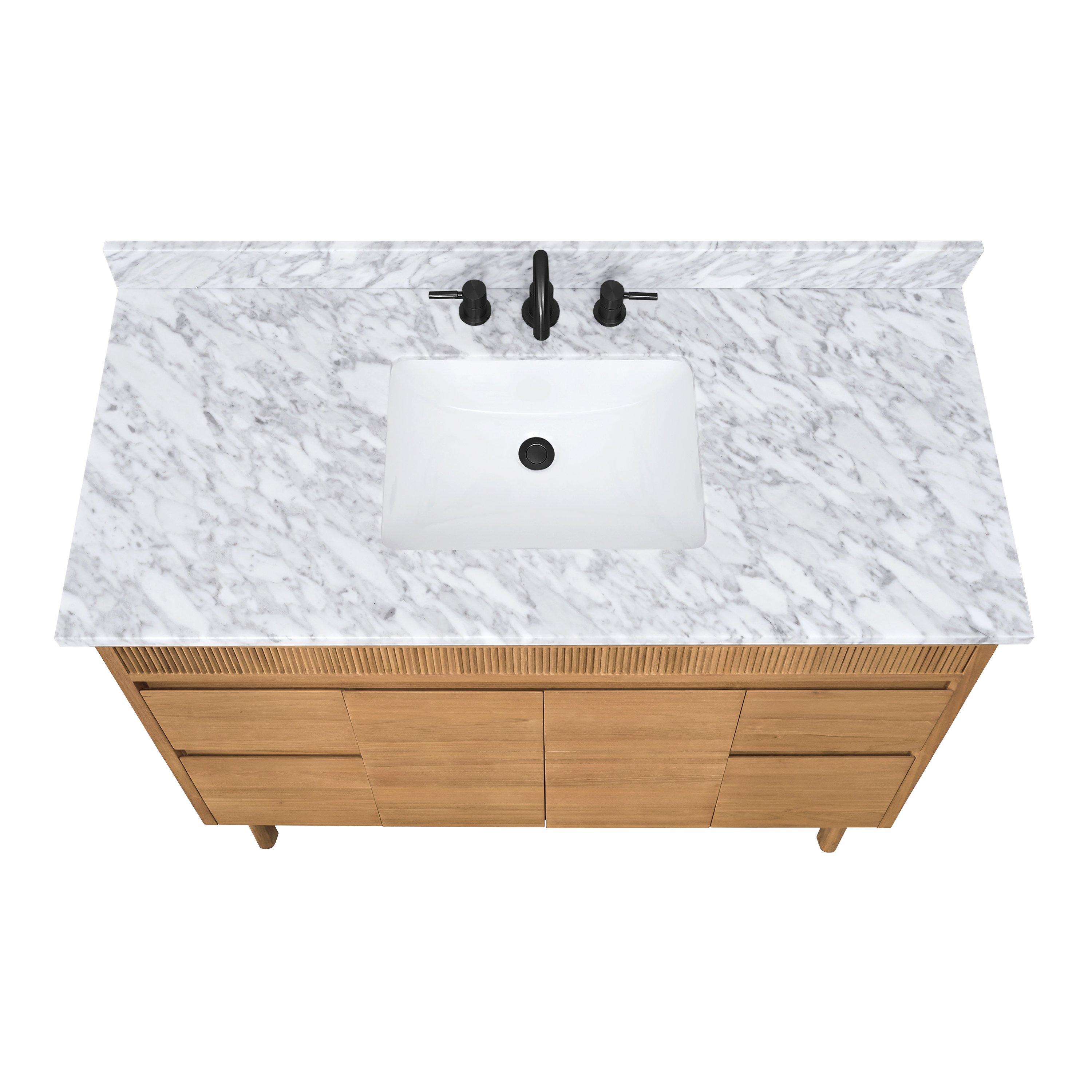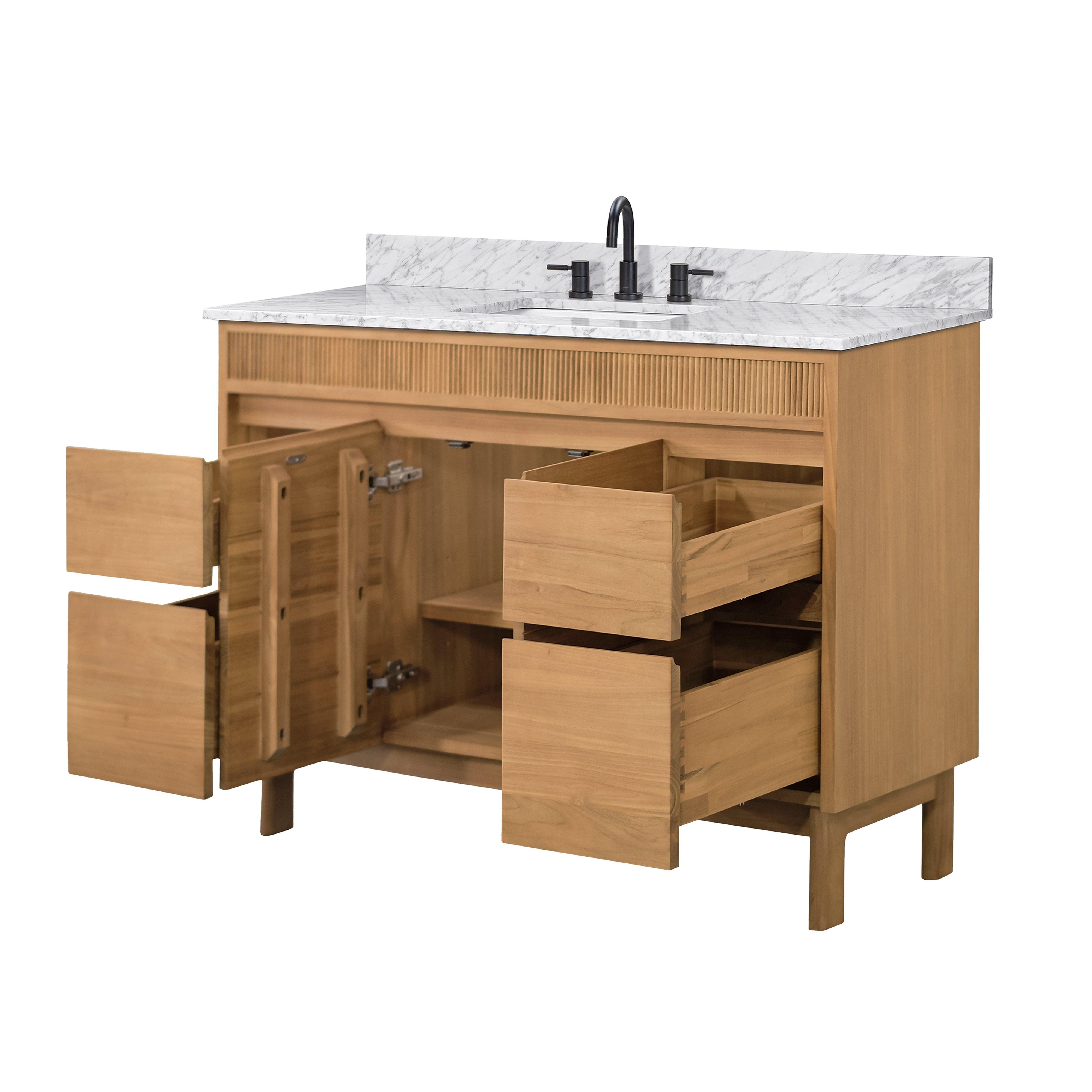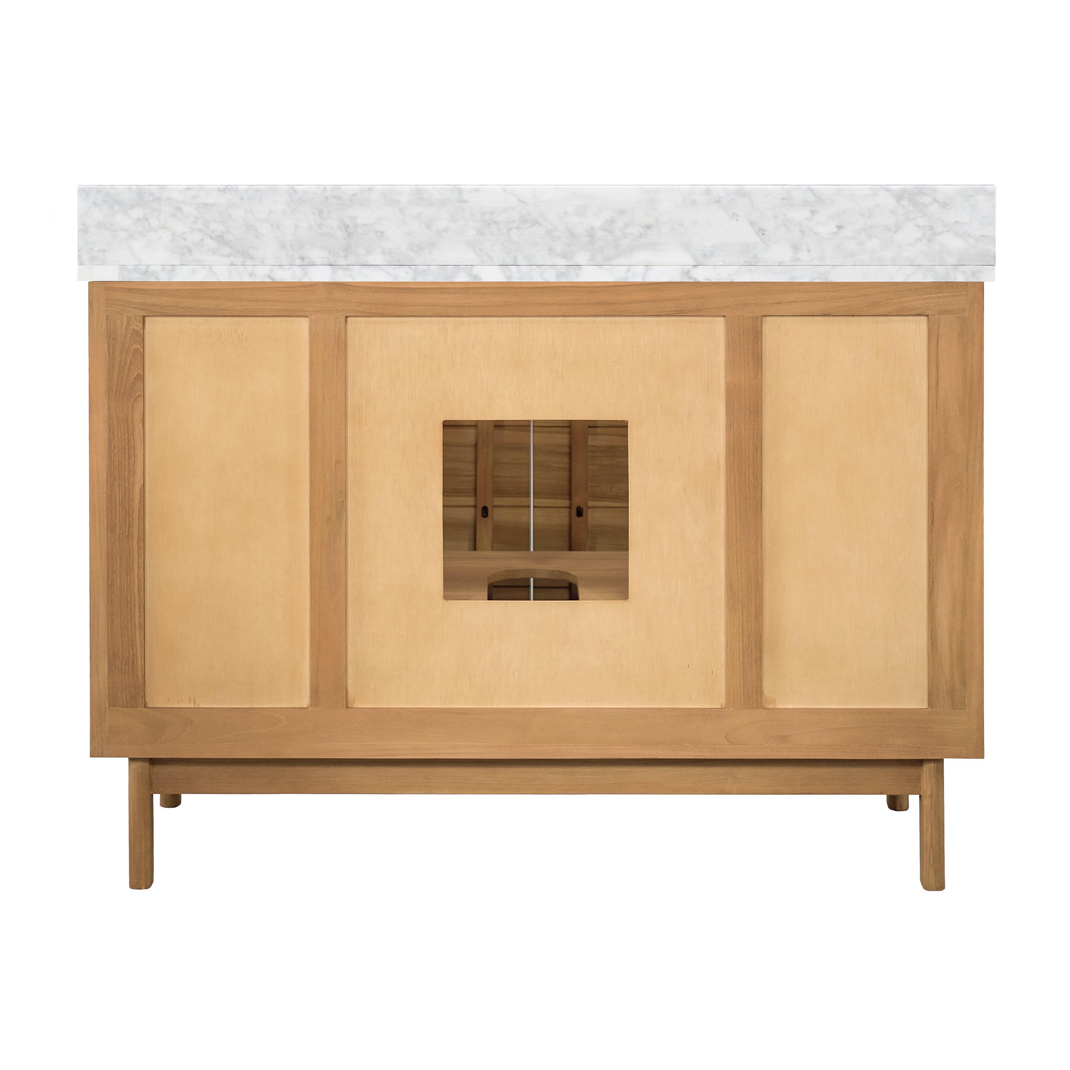 Tailor the look of your bathroom with the Kallan 49 in. Natural Vanity with Carrara Top featuring gorgeous solid wood, mdf in natural with 2 doors, 4 drawers, and 1 shelves. This piece is completed with beautiful n/a n/a hardware and a single undermount white sink. The Kallan 49 in. Natural Vanity with Carrara Top is a stunning addition to any bathroom setting.