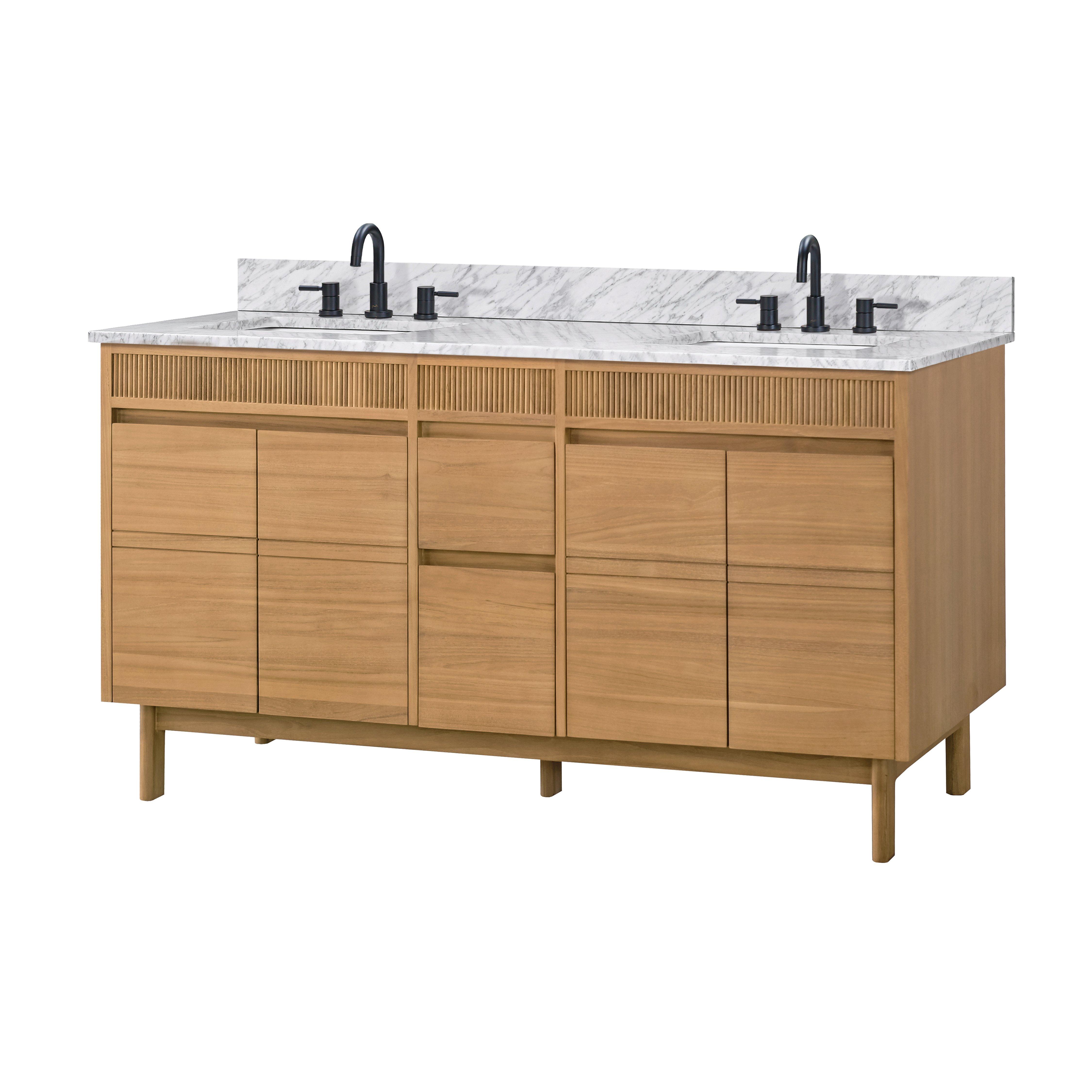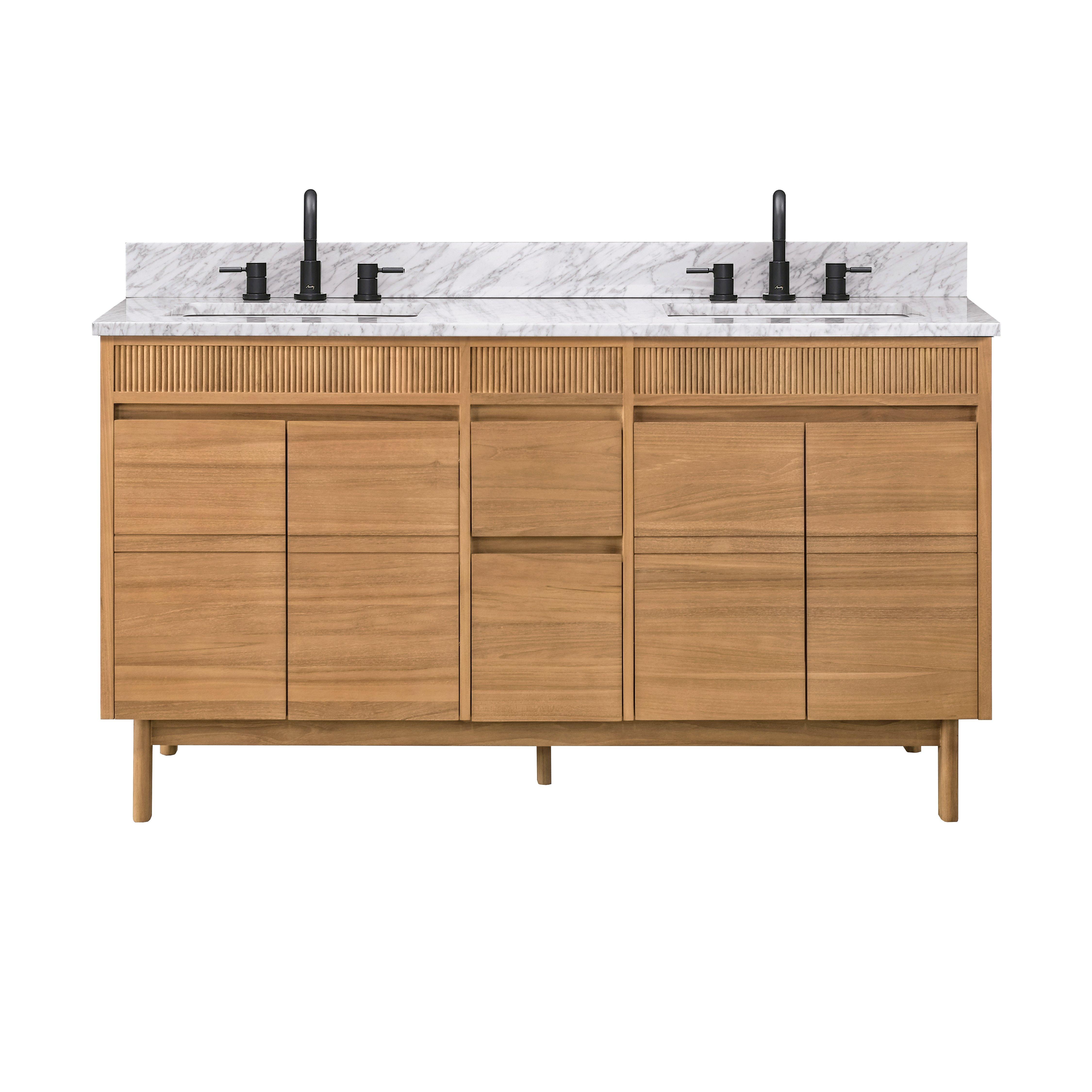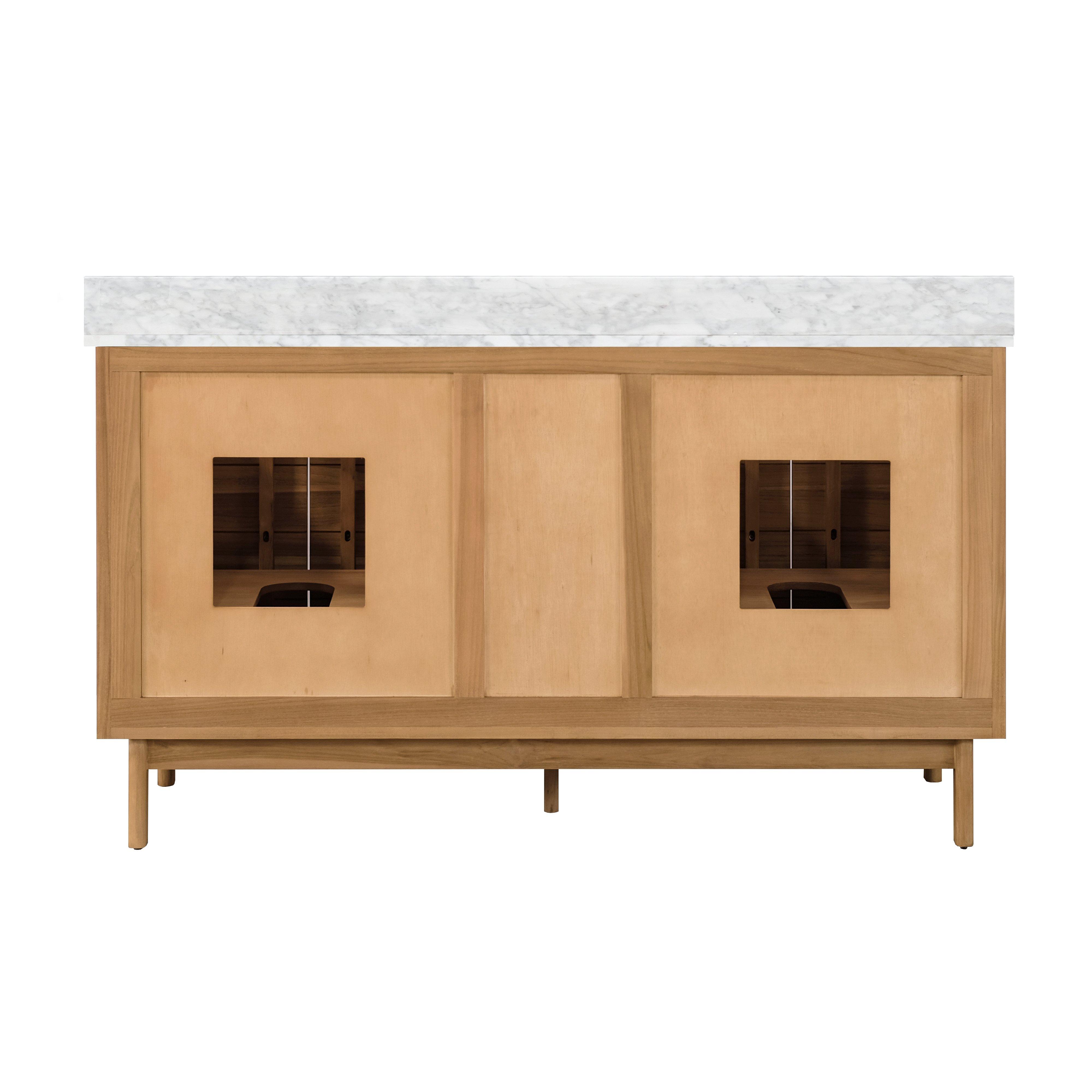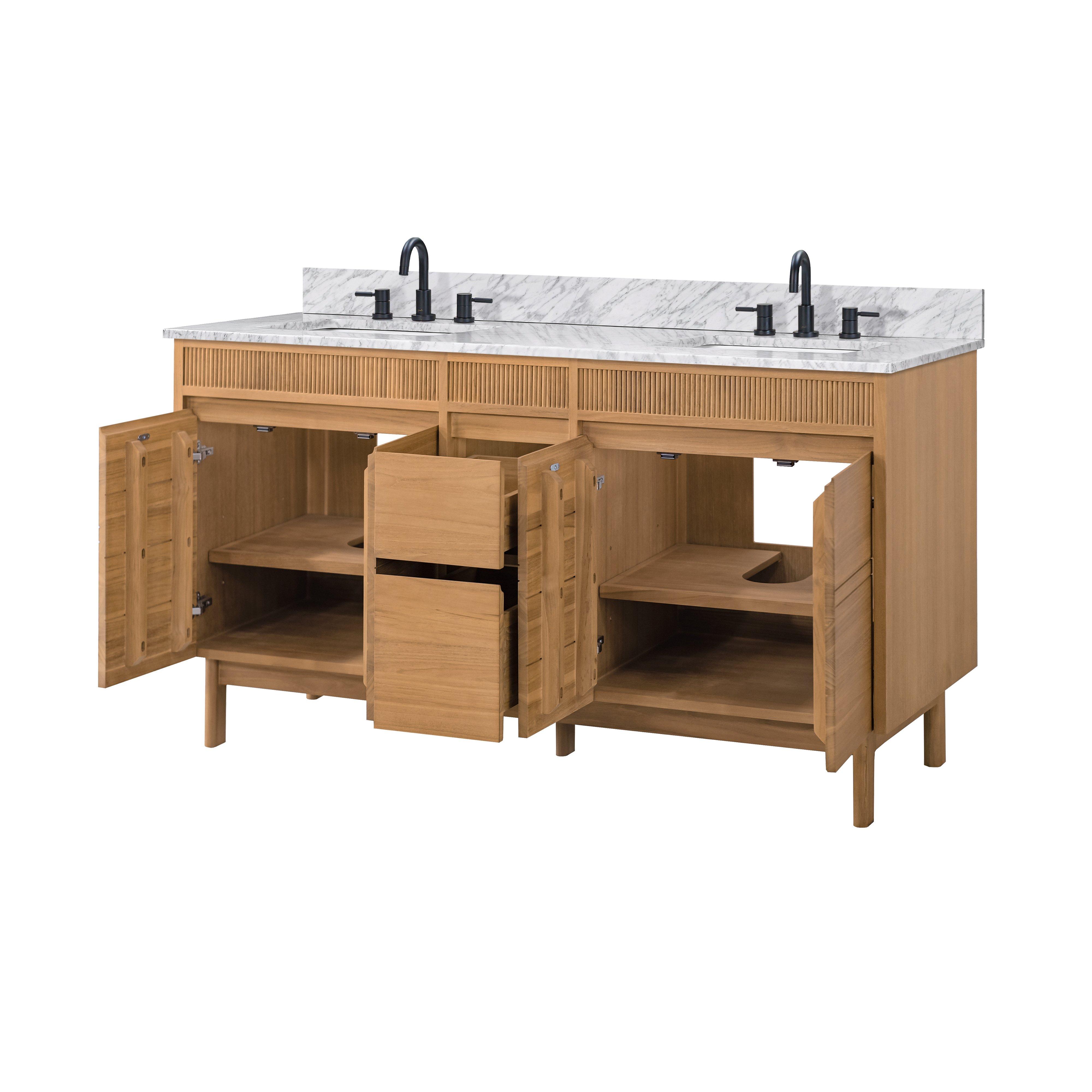 Tailor the look of your bathroom with the Kallan 61 in. Natural Vanity with Carrara Top featuring gorgeous solid wood, mdf in natural with 4 doors, 2 drawers, and 2 shelves. This piece is completed with beautiful n/a n/a hardware and a double undermount white sink. The Kallan 61 in. Natural Vanity with Carrara Top is a stunning addition to any bathroom setting.