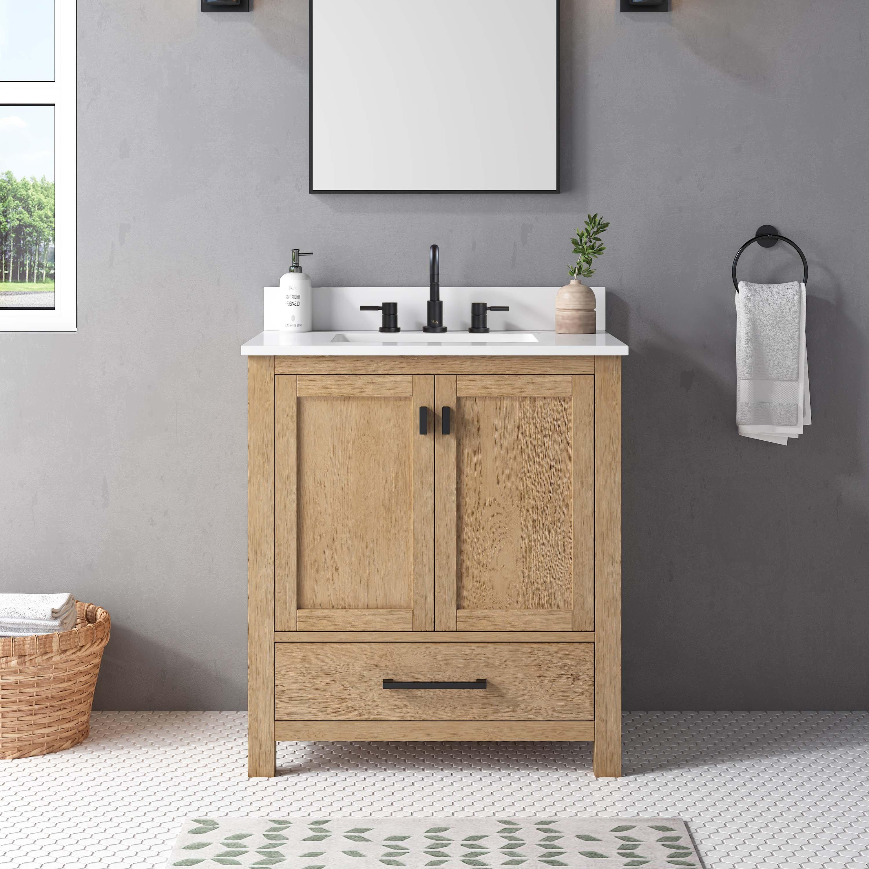 Complete your bathroom with the beautiful Kent 31 in. Natural Oak Vanity with Calacatta Engineered Top. This freestanding features durable solid wood, mdf cabinets in stunning natural with a white engineered stone vanity top and matte black bronze hardware. A charming single undermount sink in brilliant white is included. The Kent 31 in. Natural Oak Vanity with Calacatta Engineered Top is a versatile choice to customize multiple bathroom settings.