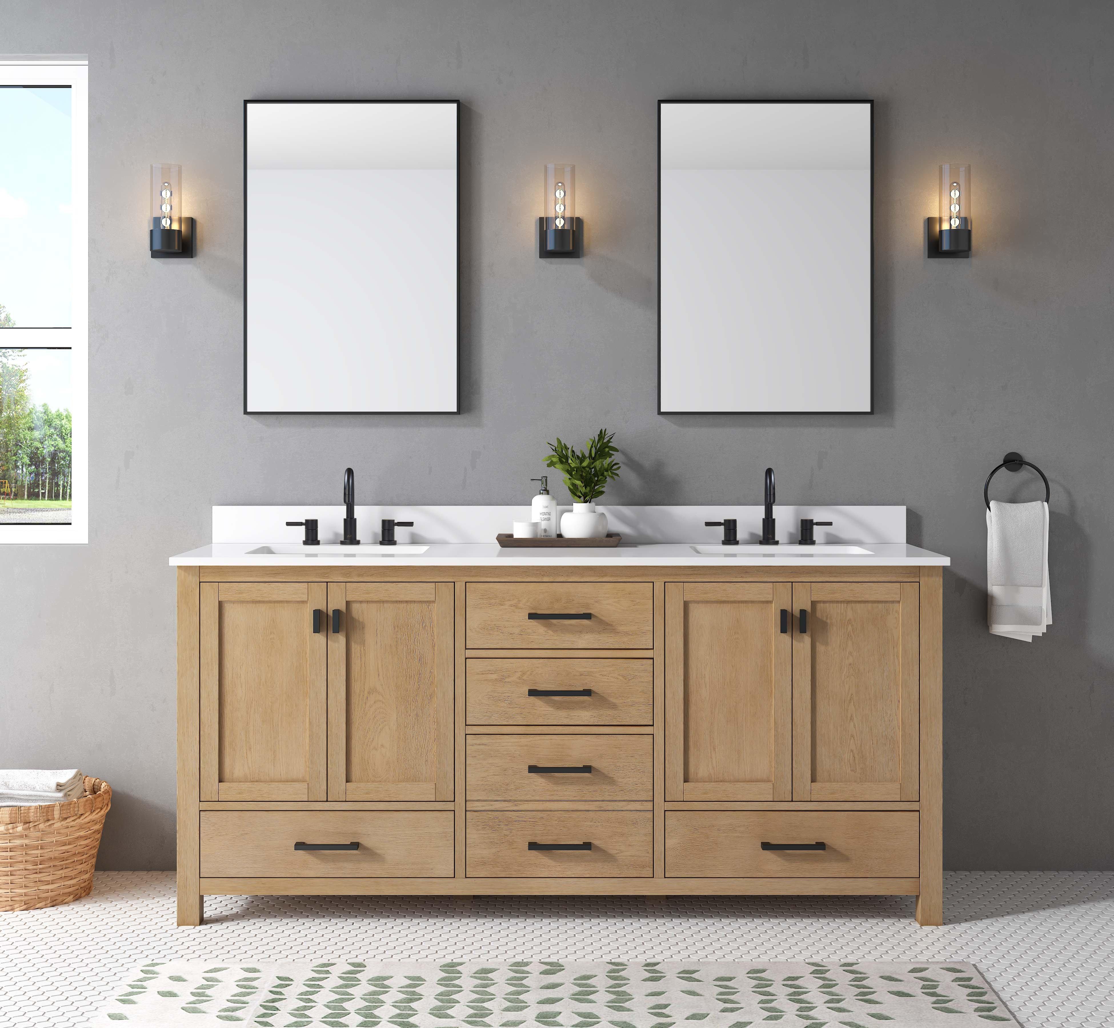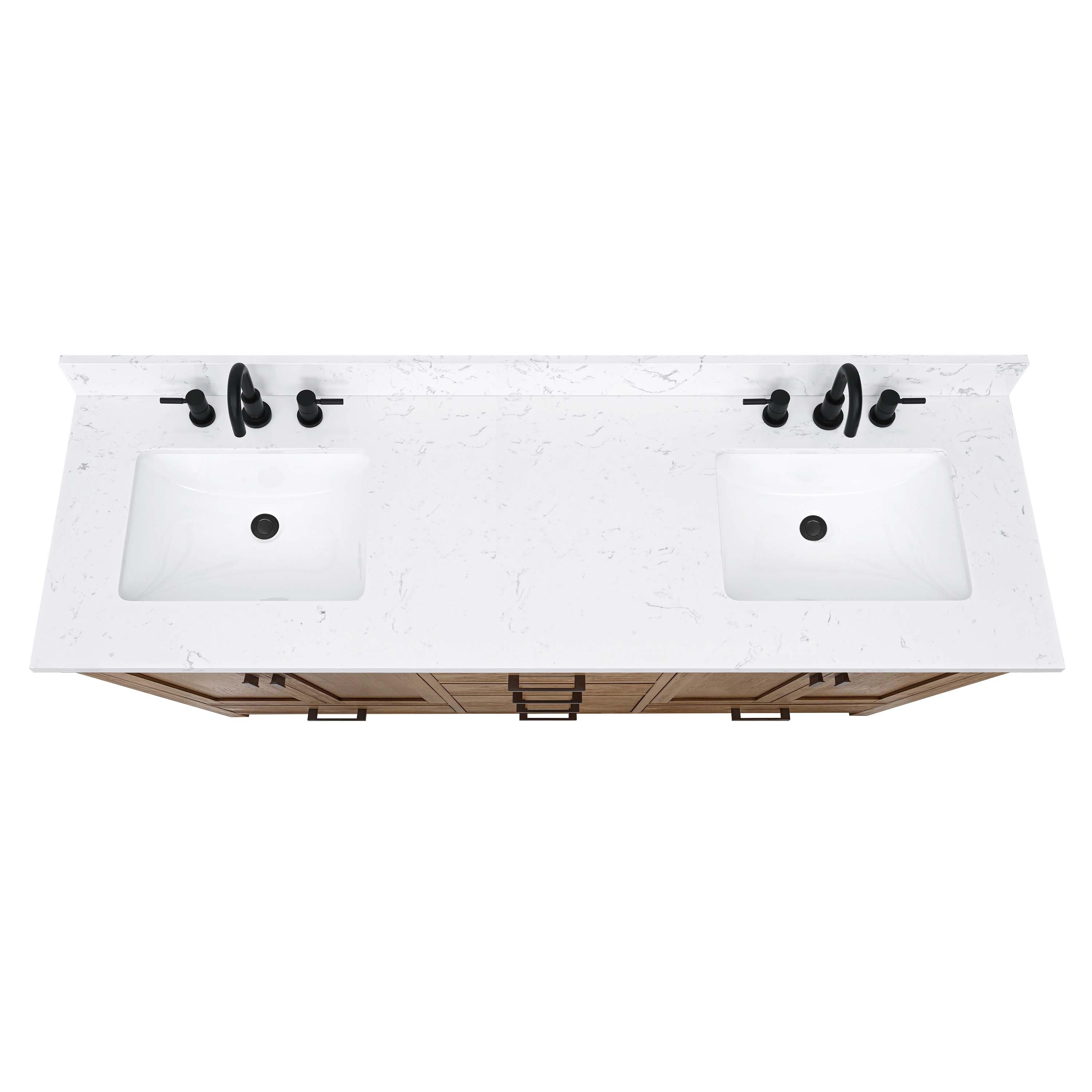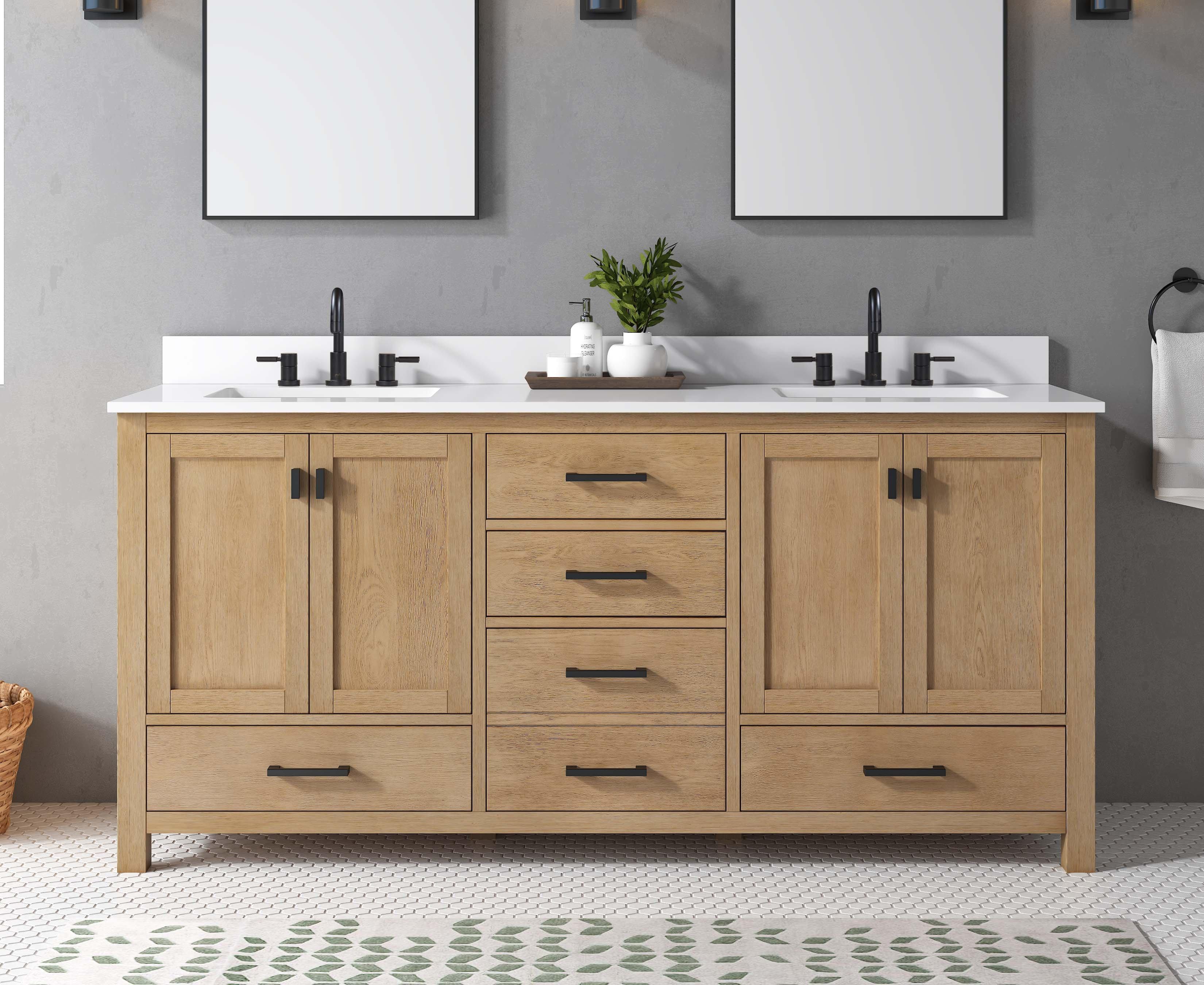 Complete your bathroom with the beautiful Kent 73 in. Natural Oak Vanity with Calacatta Engineered Top. This freestanding features durable solid wood, mdf cabinets in stunning natural with a white engineered stone vanity top and matte black bronze hardware. A charming double undermount sink in brilliant white is included. The Kent 73 in. Natural Oak Vanity with Calacatta Engineered Top is a versatile choice to customize multiple bathroom settings.