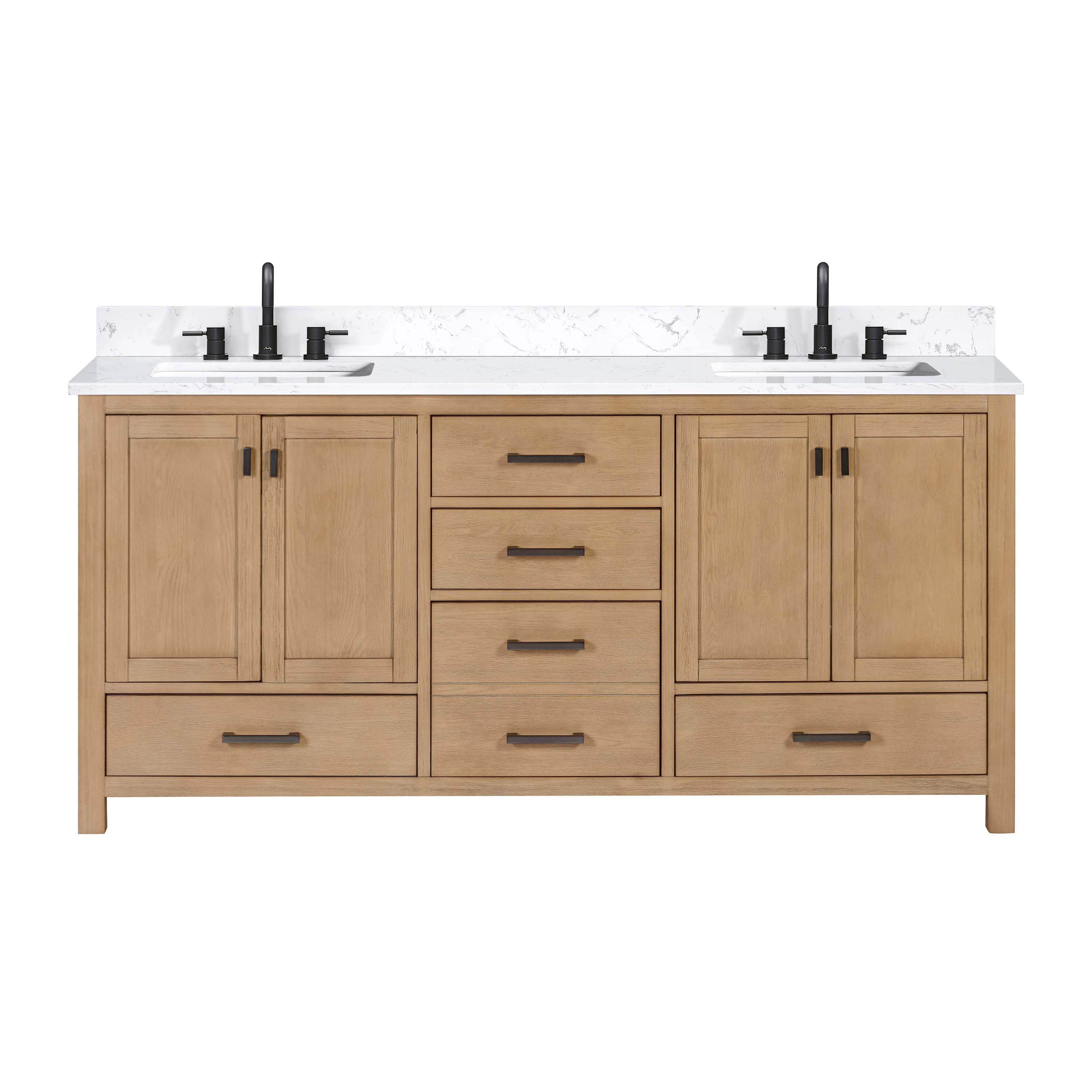 Complete your bathroom with the beautiful Kent 73 in. Natural Oak Vanity with Calacatta Engineered Top. This freestanding features durable solid wood, mdf cabinets in stunning natural with a white engineered stone vanity top and matte black bronze hardware. A charming double undermount sink in brilliant white is included. The Kent 73 in. Natural Oak Vanity with Calacatta Engineered Top is a versatile choice to customize multiple bathroom settings.