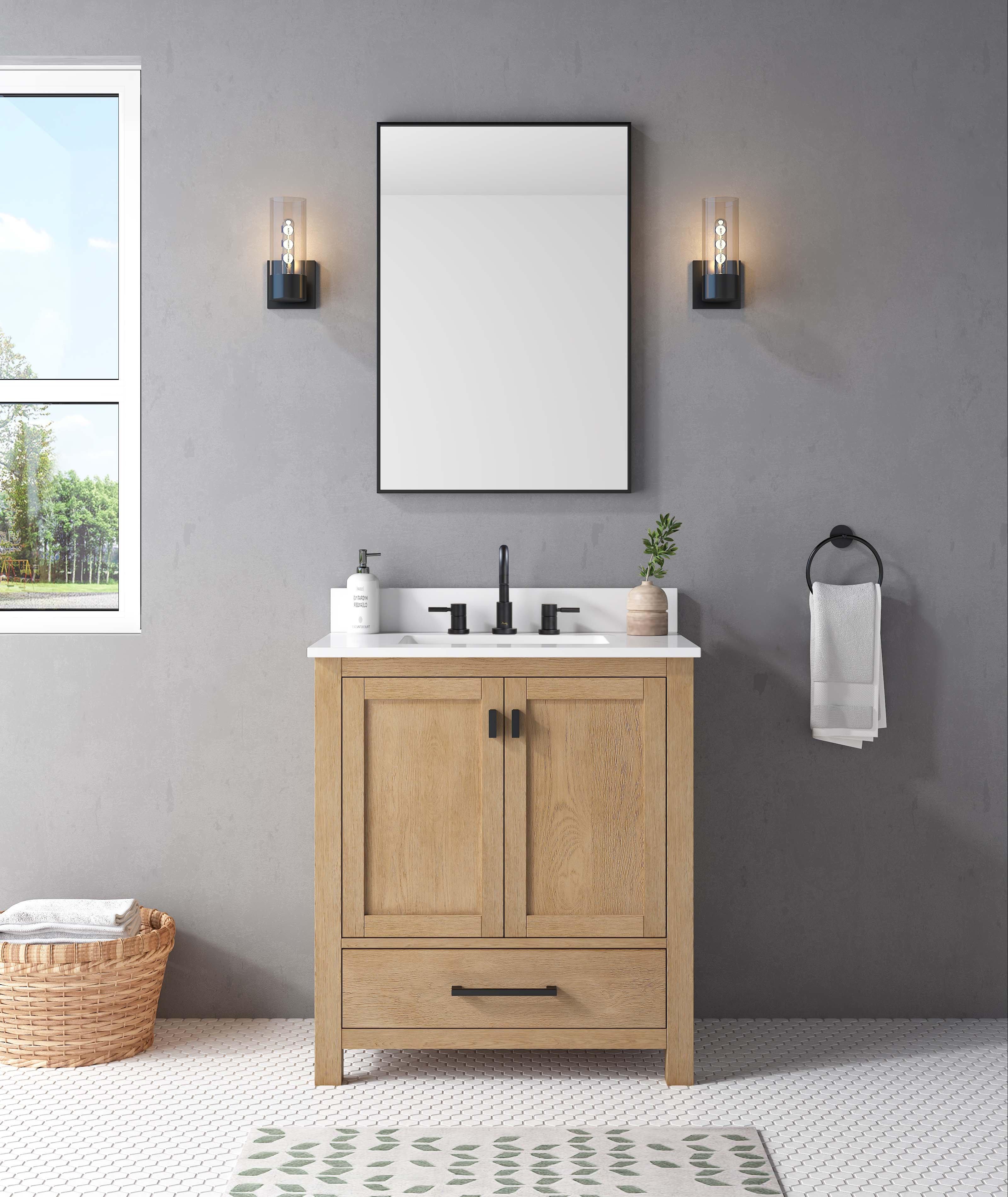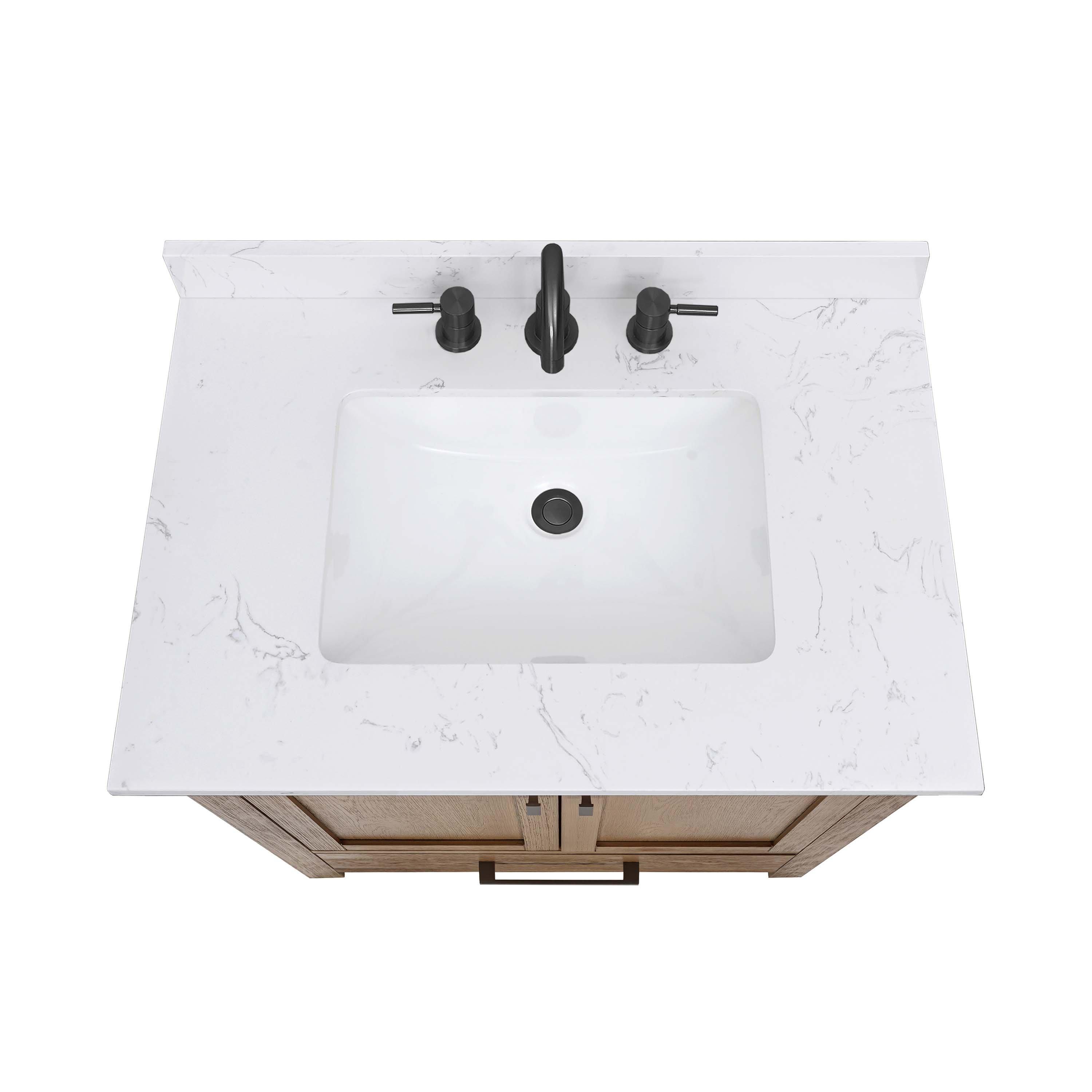 Complete your bathroom with the beautiful Kent 31 in. Natural Oak Vanity with Calacatta Engineered Top. This freestanding features durable solid wood, mdf cabinets in stunning natural with a white engineered stone vanity top and matte black bronze hardware. A charming single undermount sink in brilliant white is included. The Kent 31 in. Natural Oak Vanity with Calacatta Engineered Top is a versatile choice to customize multiple bathroom settings.