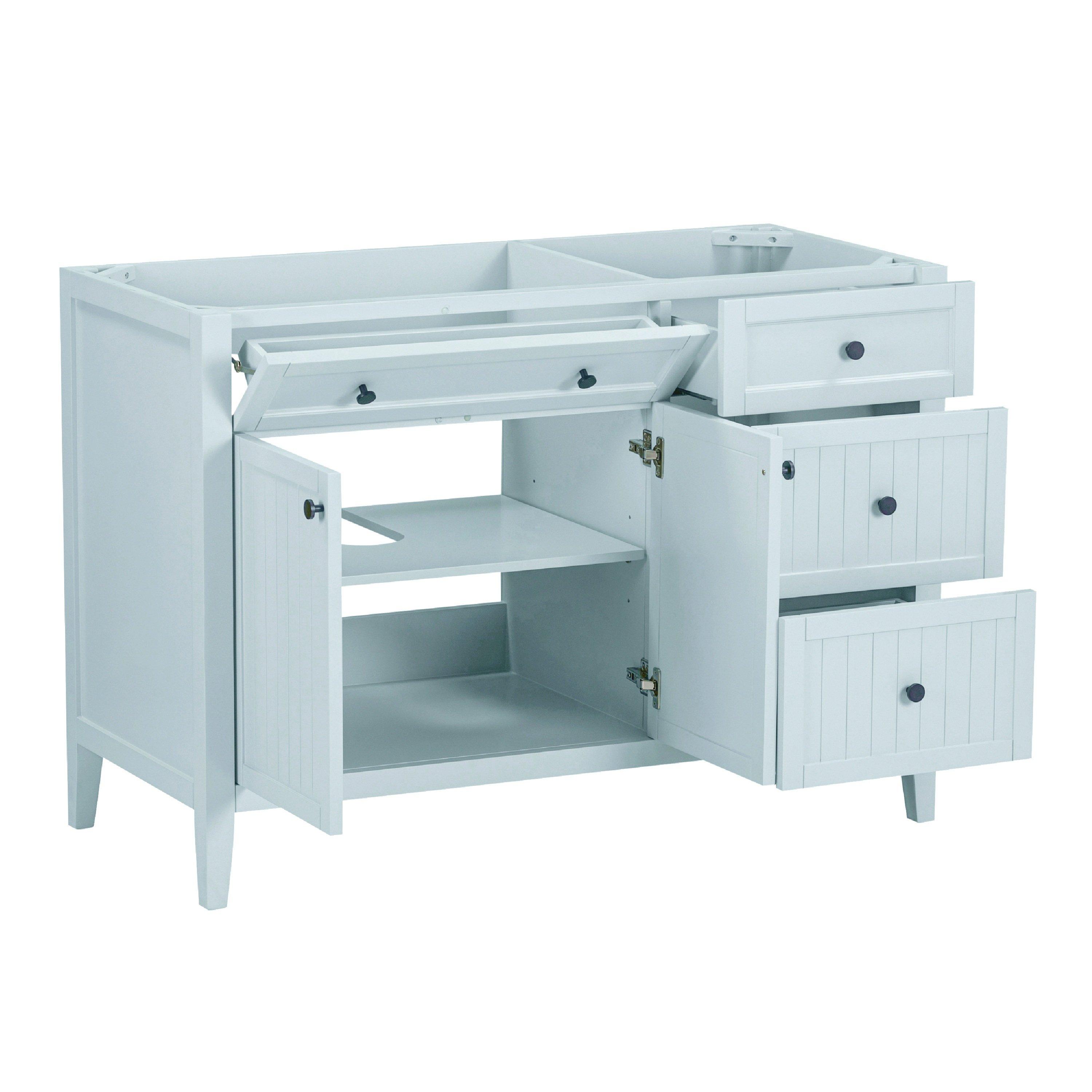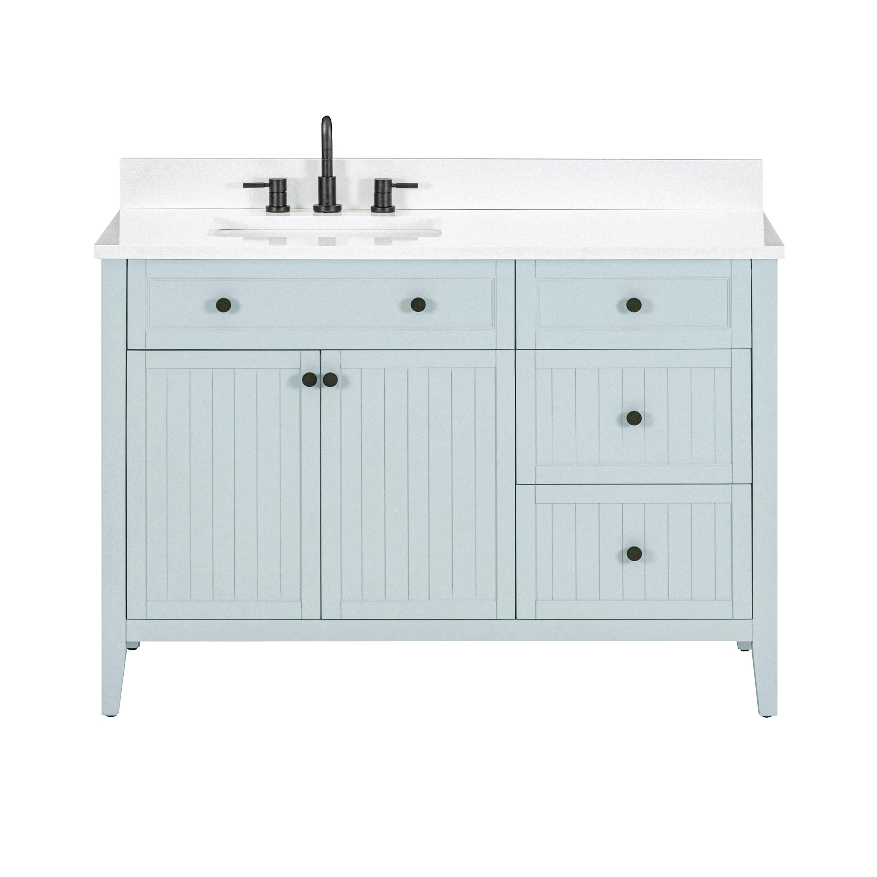 Complete your bathroom with the beautiful Lazura 49 in. Blue Vanity with Engineered Stone Top. This freestanding features durable solid wood, mdf cabinets in stunning blue with a white engineered stone vanity top and matte black hardware. A charming single undermount sink in brilliant white is included. The Lazura 49 in. Blue Vanity with Engineered Stone Top is a versatile choice to customize multiple bathroom settings.