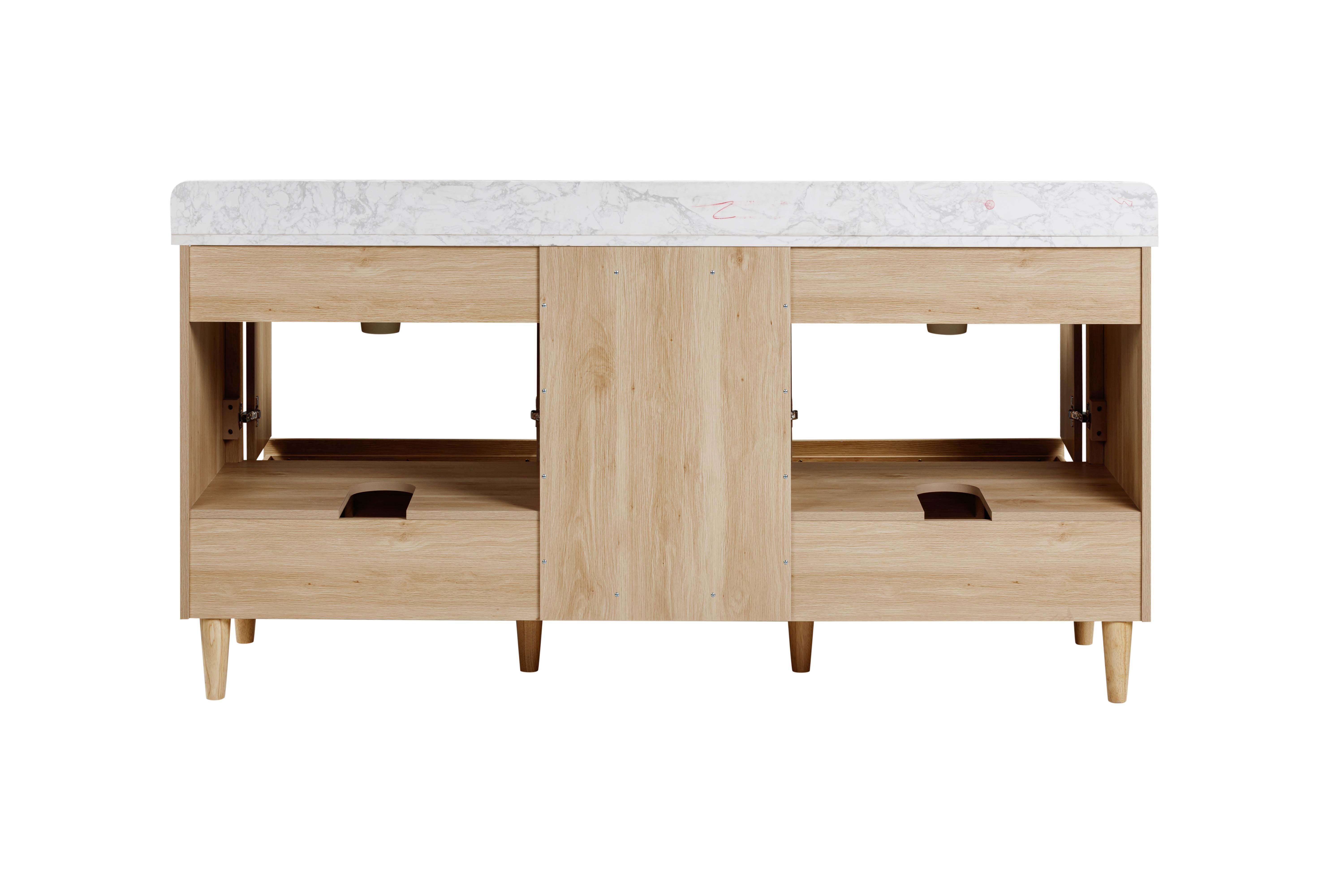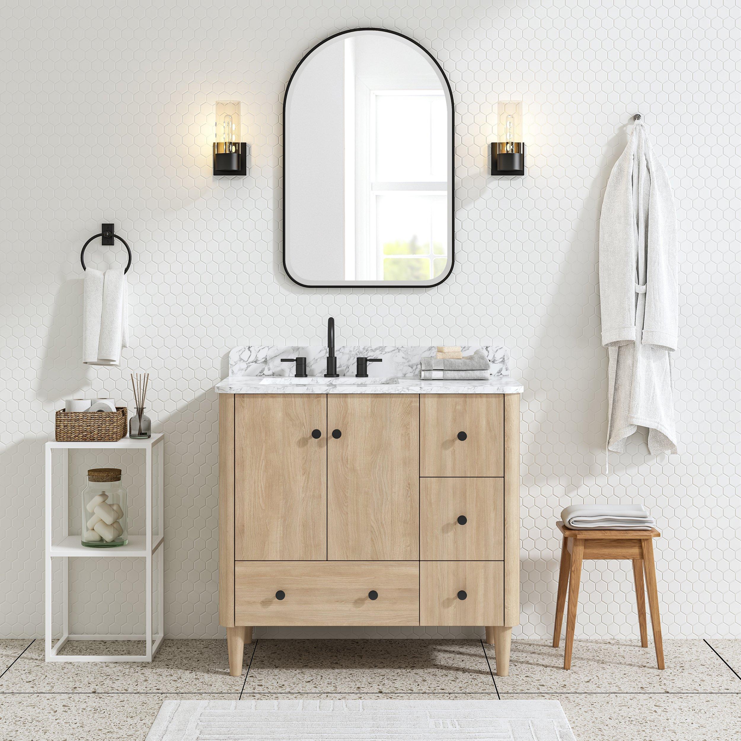 Tailor the look of your bathroom with the Leyah 31 in. Oak Finish Vanity with Engineered Stone Top featuring gorgeous solid wood, mdf in natural with 2 doors, 1 drawers, and 0 shelves. This piece is completed with beautiful matte black hardware and a single undermount white sink. The Leyah 31 in. Oak Finish Vanity with Engineered Stone Top is a stunning addition to any bathroom setting.