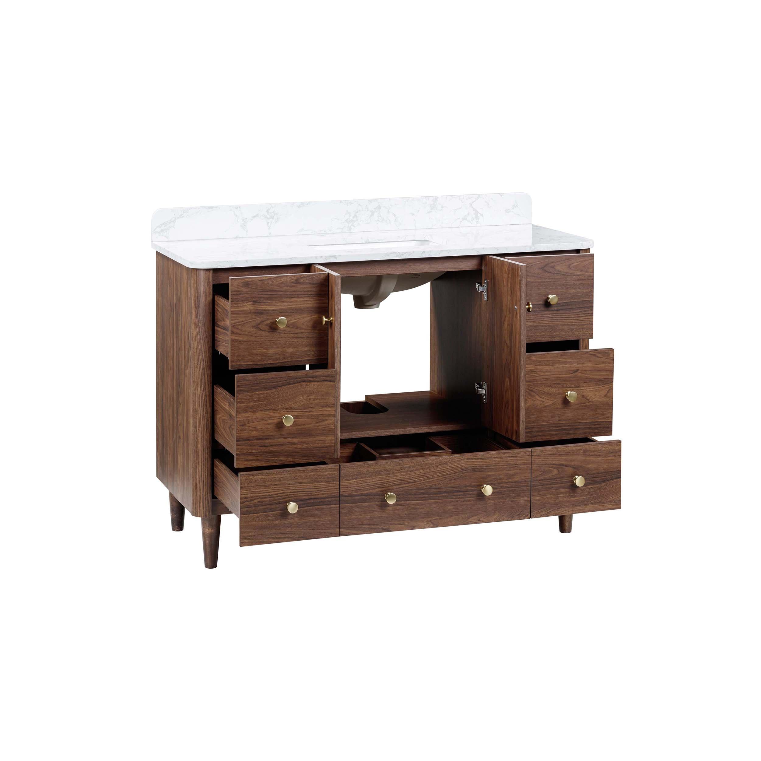 Complete your bathroom with the beautiful Leyah 49 in. Walnut Finish Vanity with Engineered Stone Top. This freestanding features durable solid wood, mdf cabinets in stunning brown with a white engineered stone vanity top and matte gold hardware. A charming single undermount sink in brilliant white is included. The Leyah 49 in. Walnut Finish Vanity with Engineered Stone Top is a versatile choice to customize multiple bathroom settings.