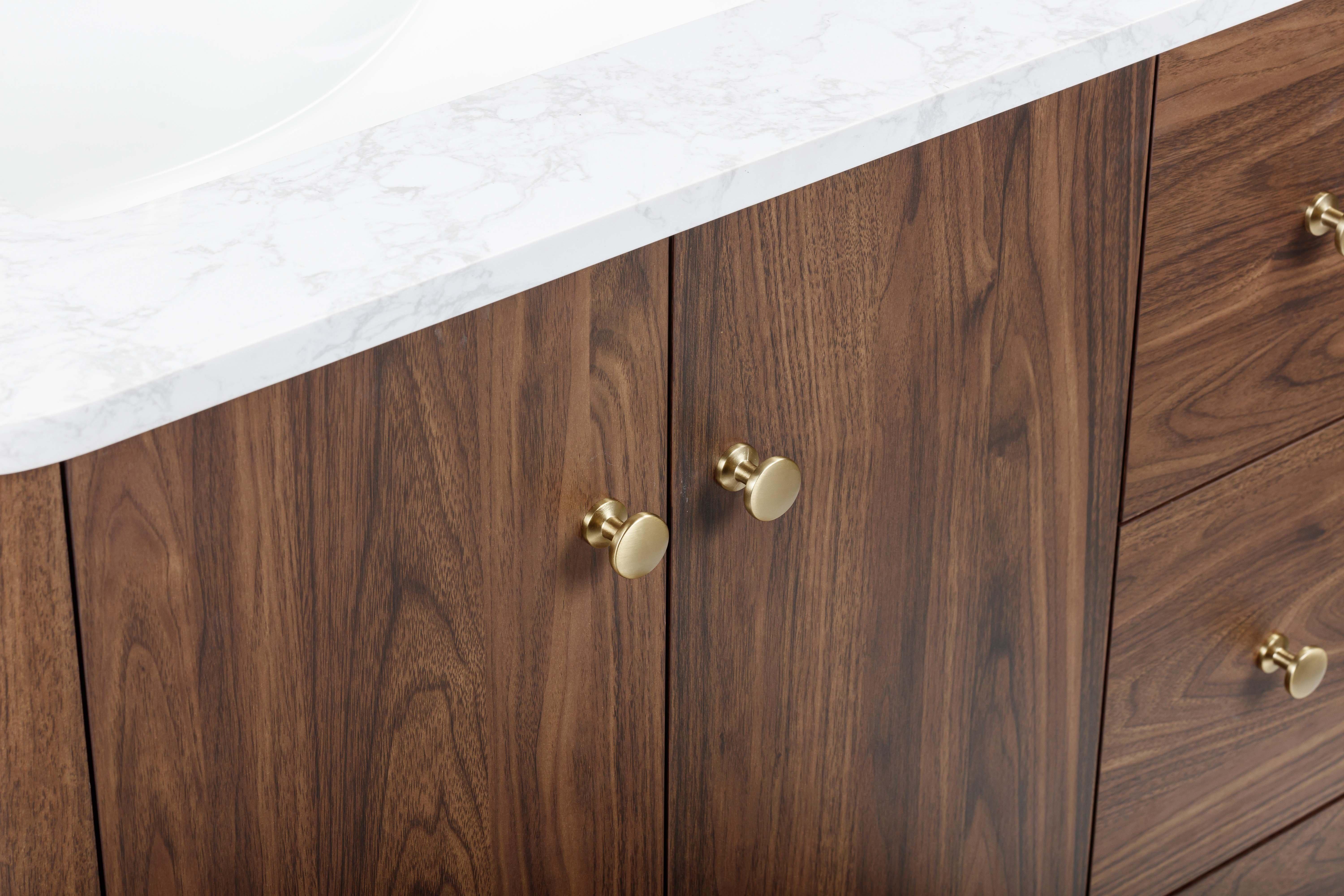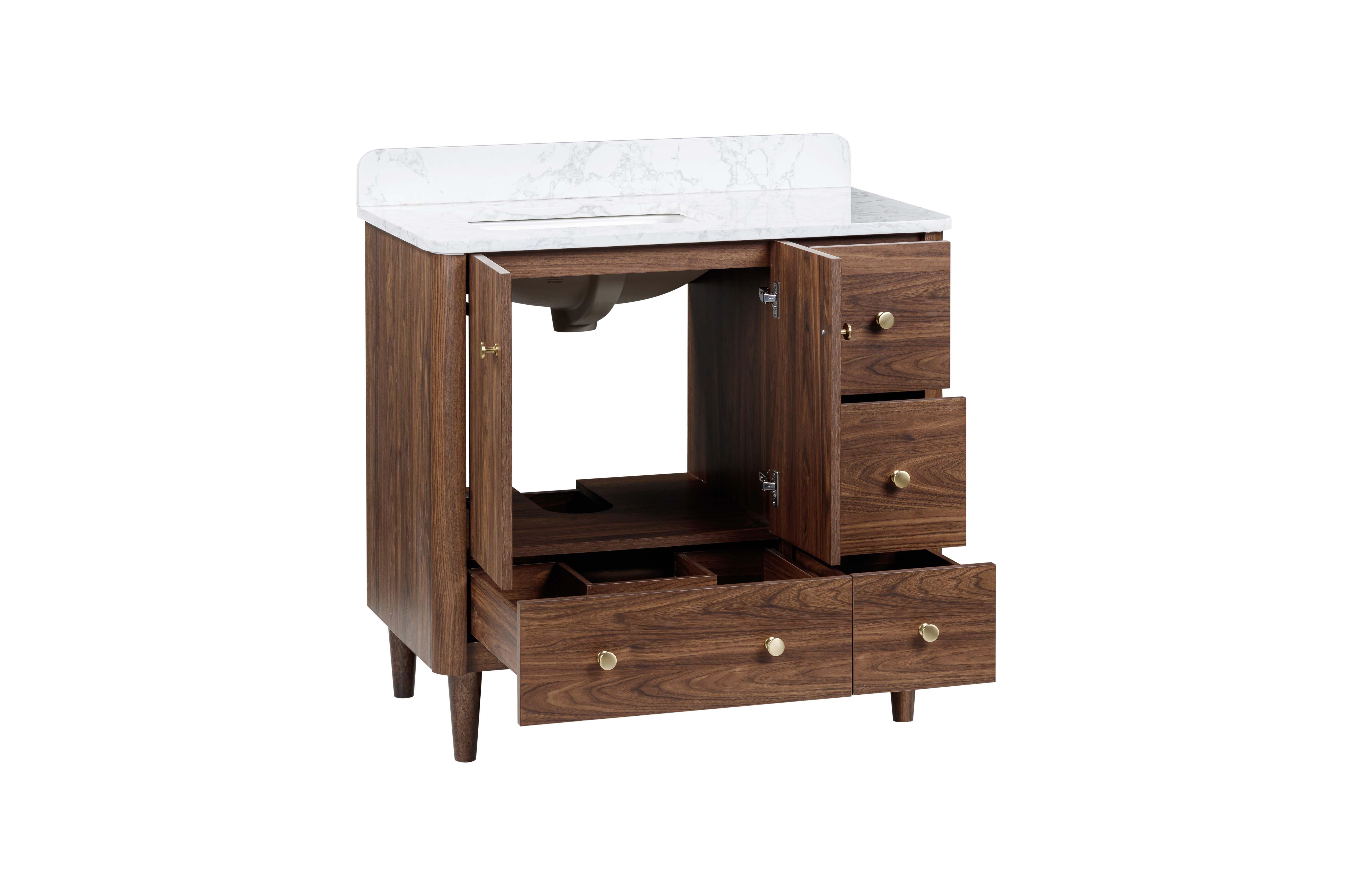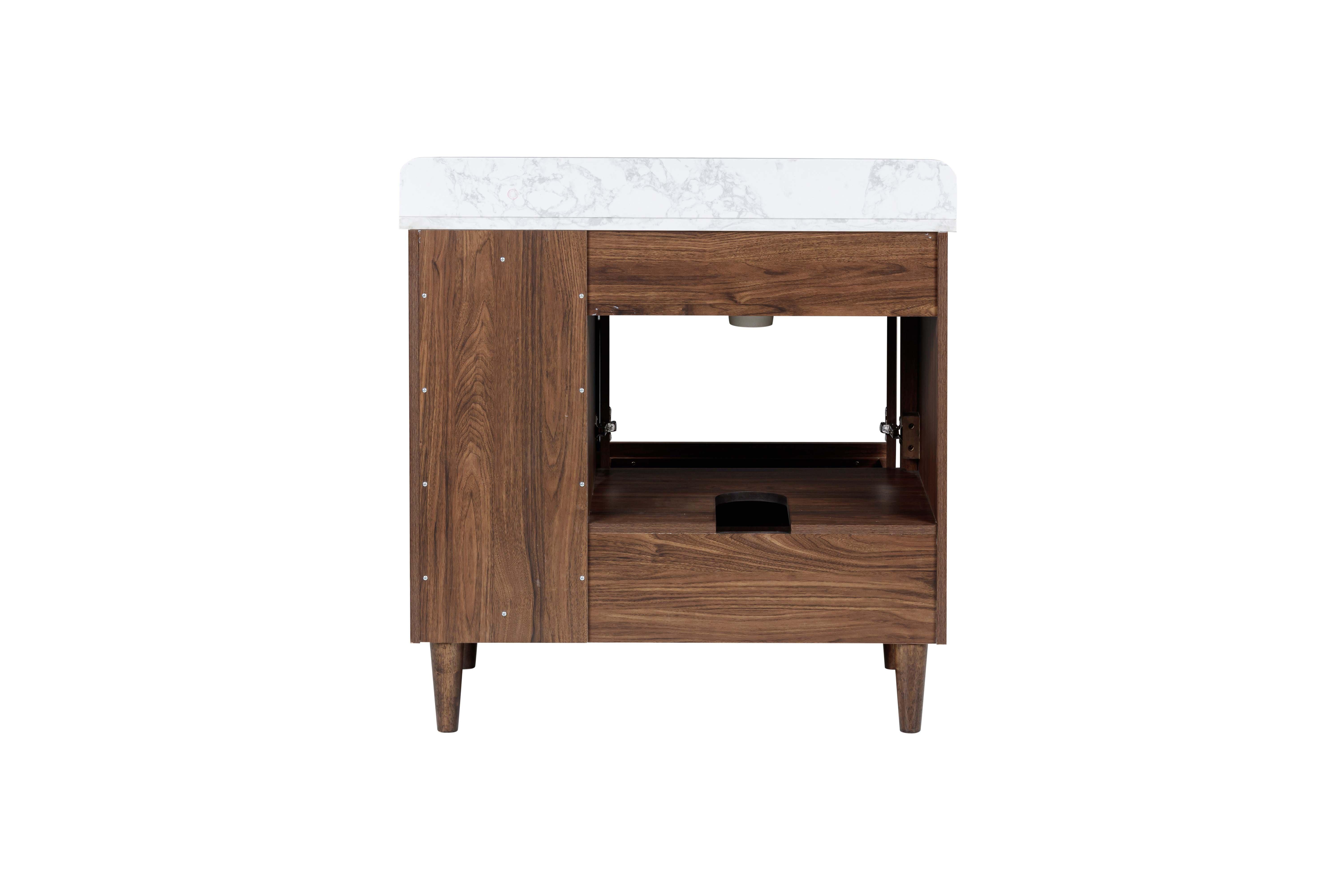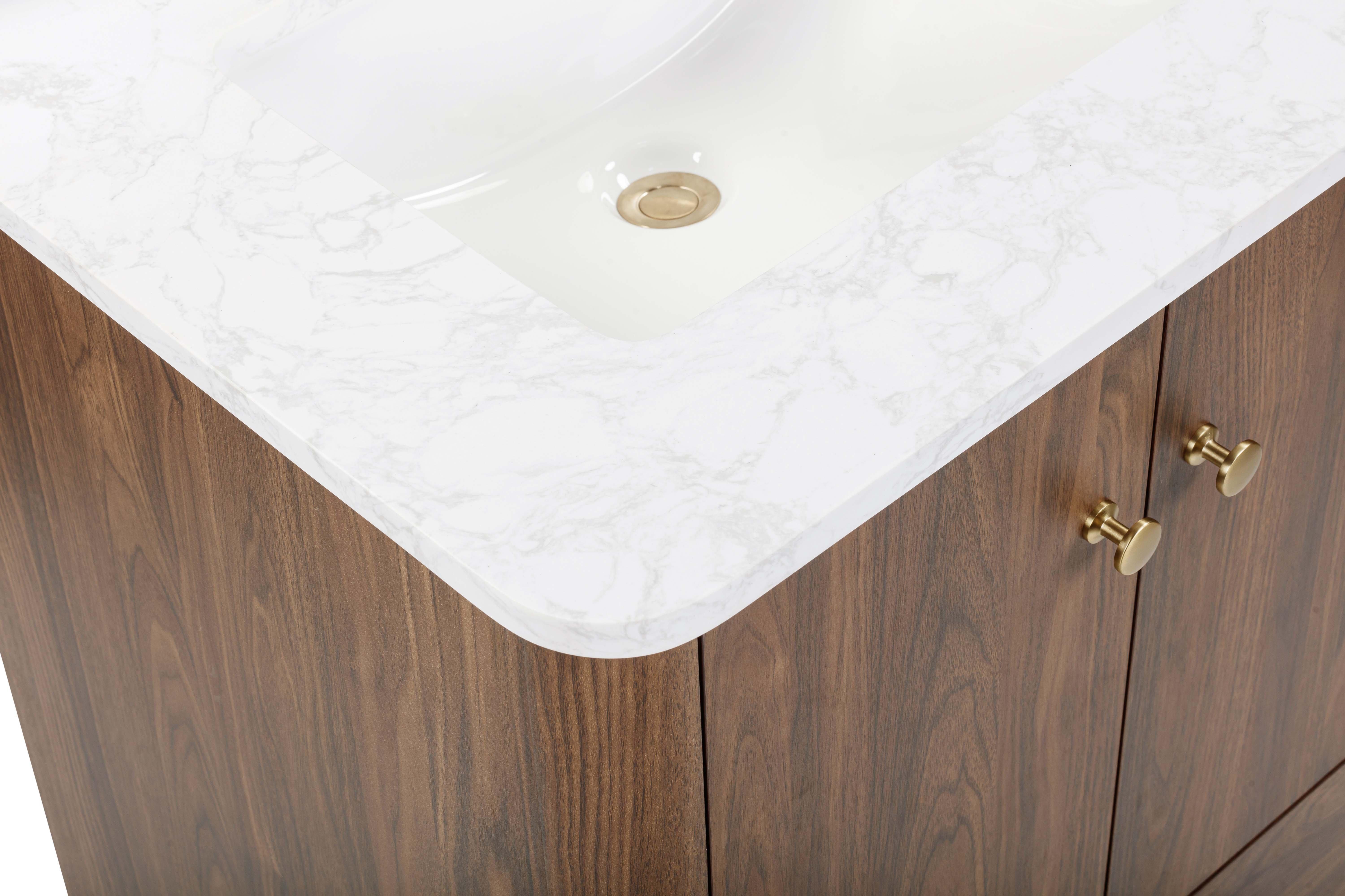 Tailor the look of your bathroom with the Leyah 31 in. Walnut Finish Vanity with Engineered Stone Top featuring gorgeous solid wood, mdf in brown with 2 doors, 1 drawers, and 0 shelves. This piece is completed with beautiful matte gold hardware and a single undermount white sink. The Leyah 31 in. Walnut Finish Vanity with Engineered Stone Top is a stunning addition to any bathroom setting.