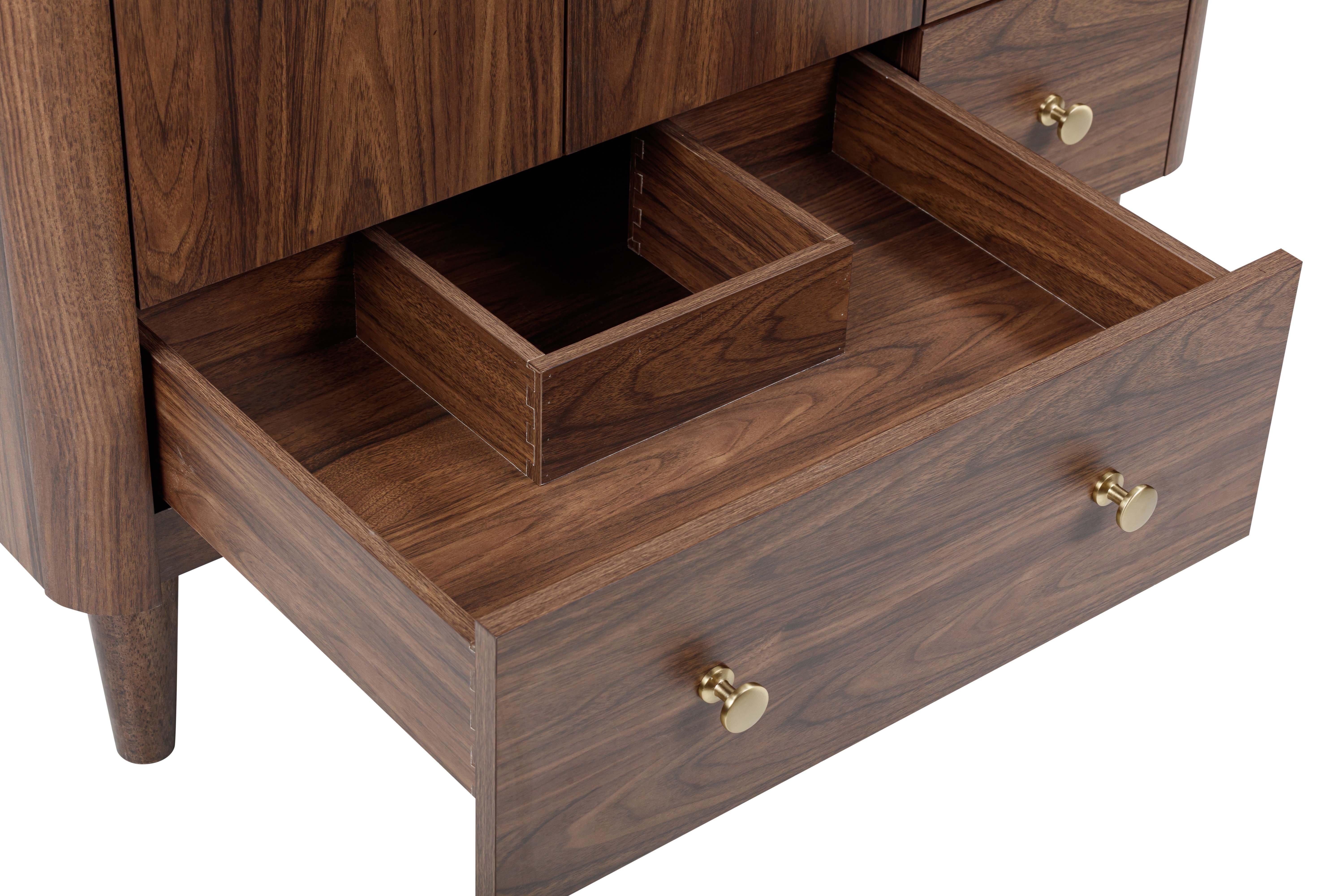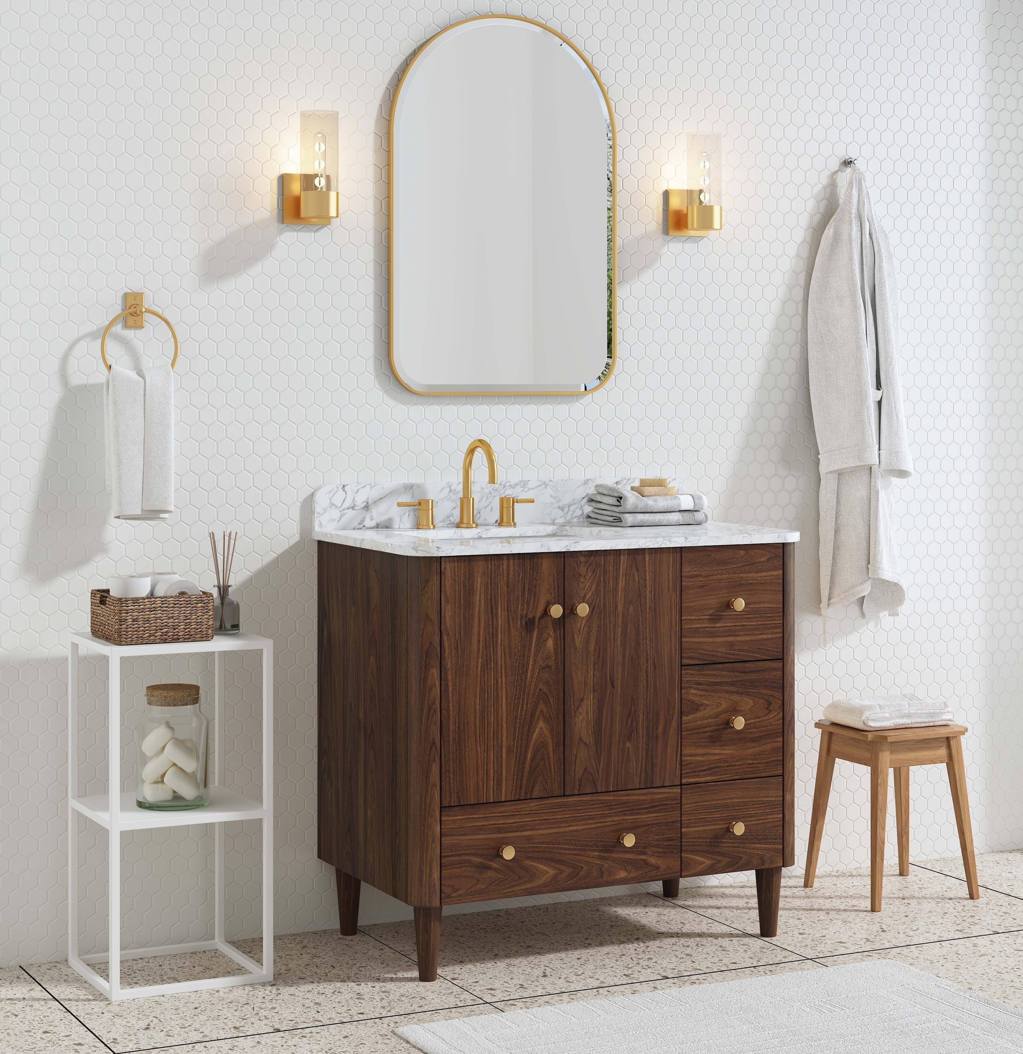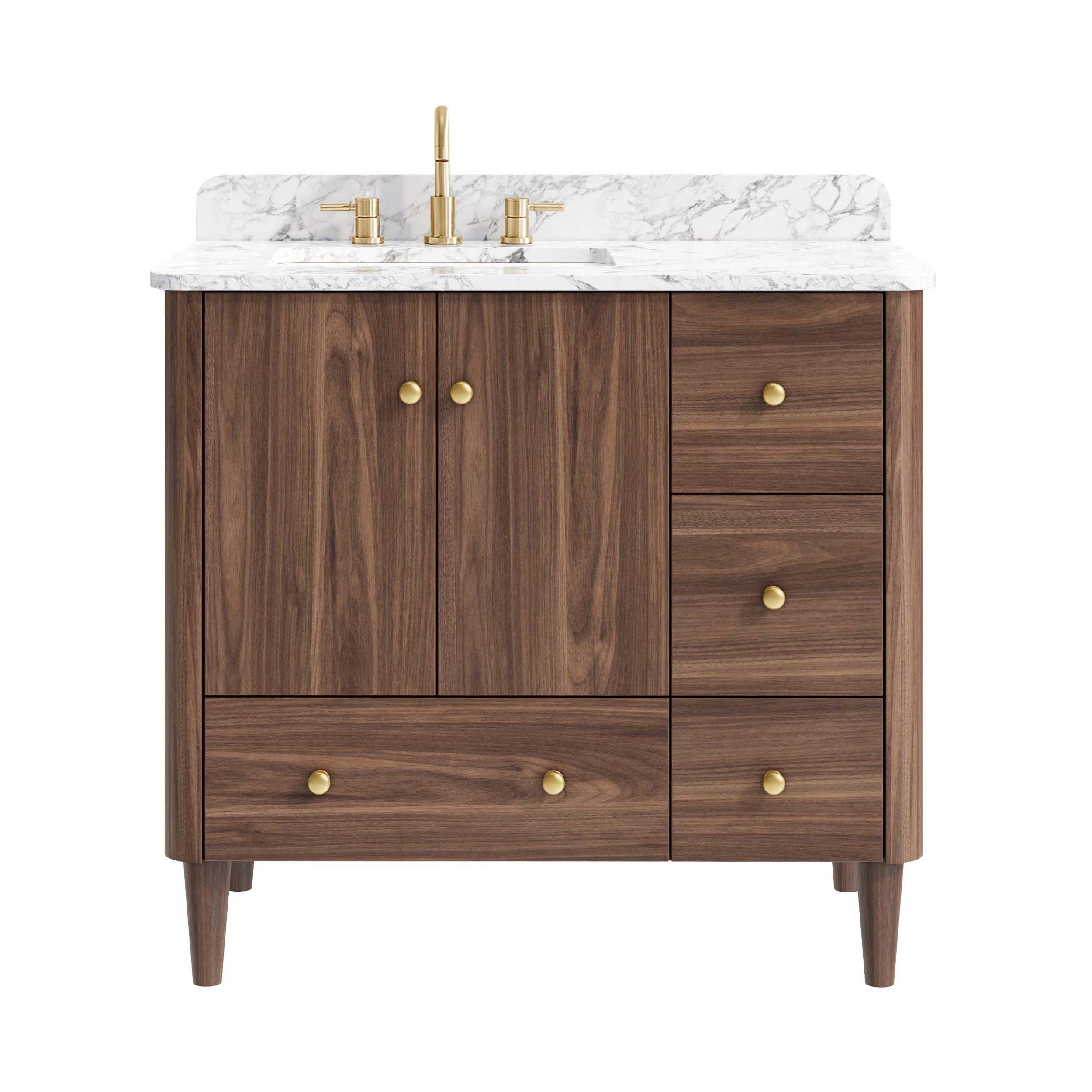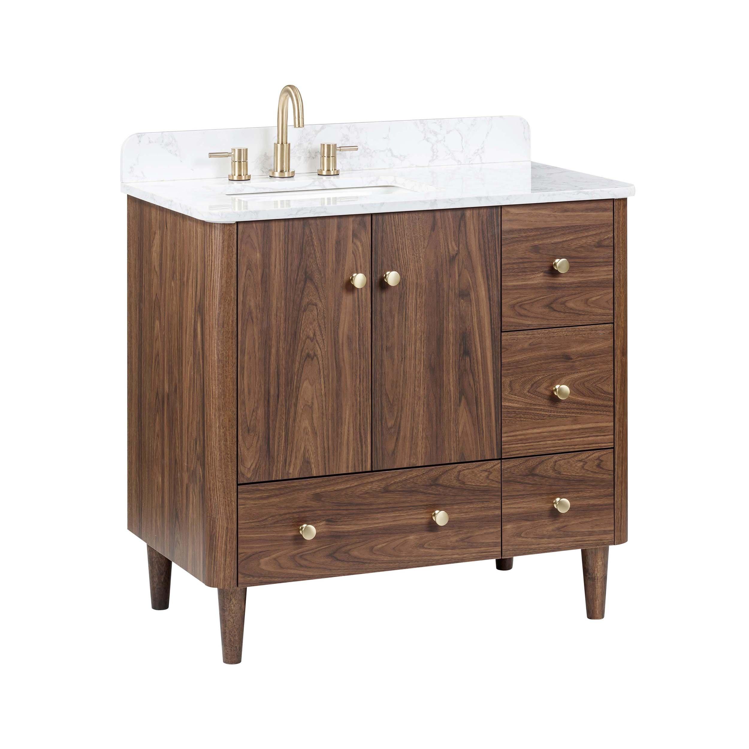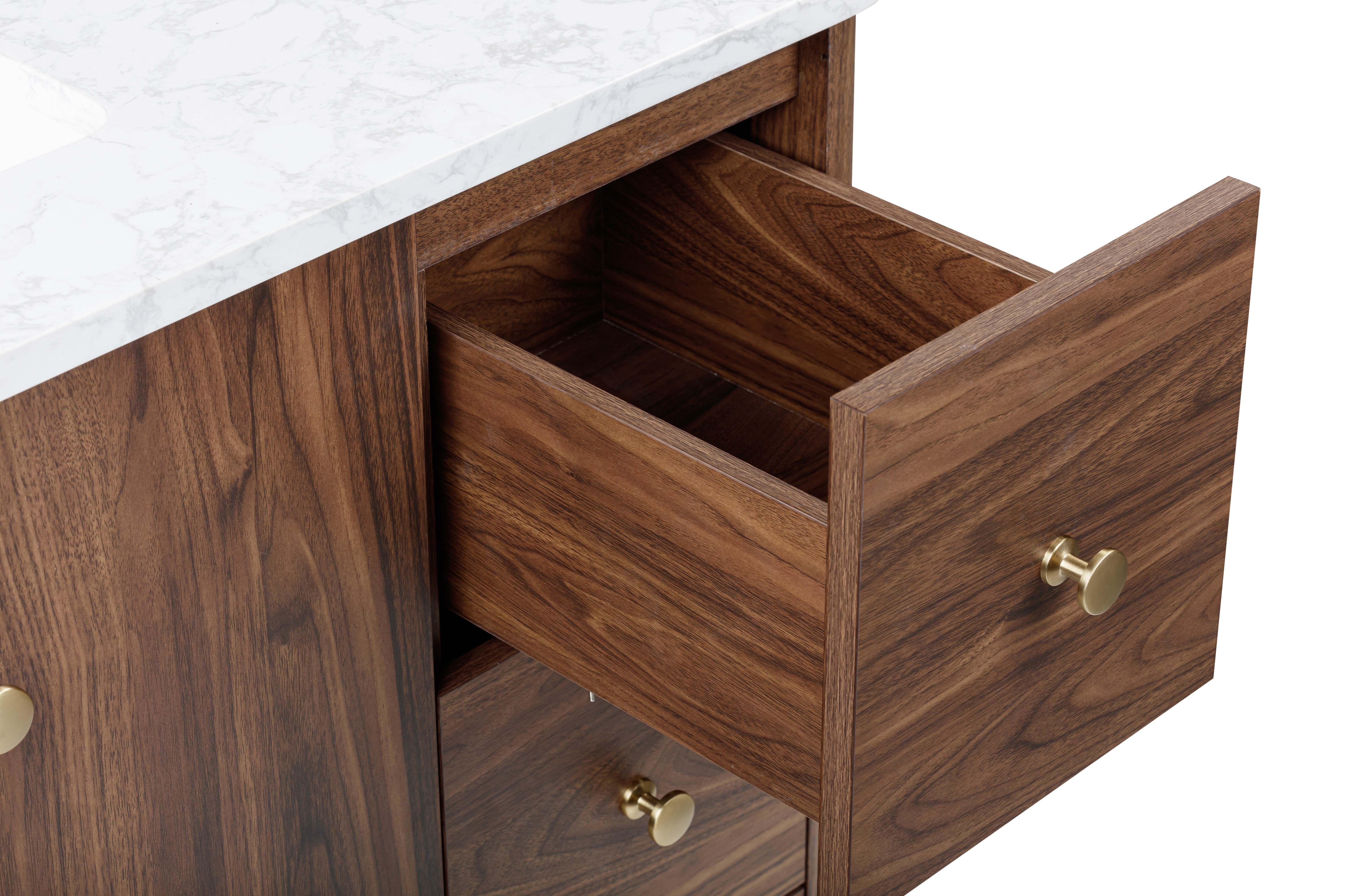 Tailor the look of your bathroom with the Leyah 31 in. Walnut Finish Vanity with Engineered Stone Top featuring gorgeous solid wood, mdf in brown with 2 doors, 1 drawers, and 0 shelves. This piece is completed with beautiful matte gold hardware and a single undermount white sink. The Leyah 31 in. Walnut Finish Vanity with Engineered Stone Top is a stunning addition to any bathroom setting.