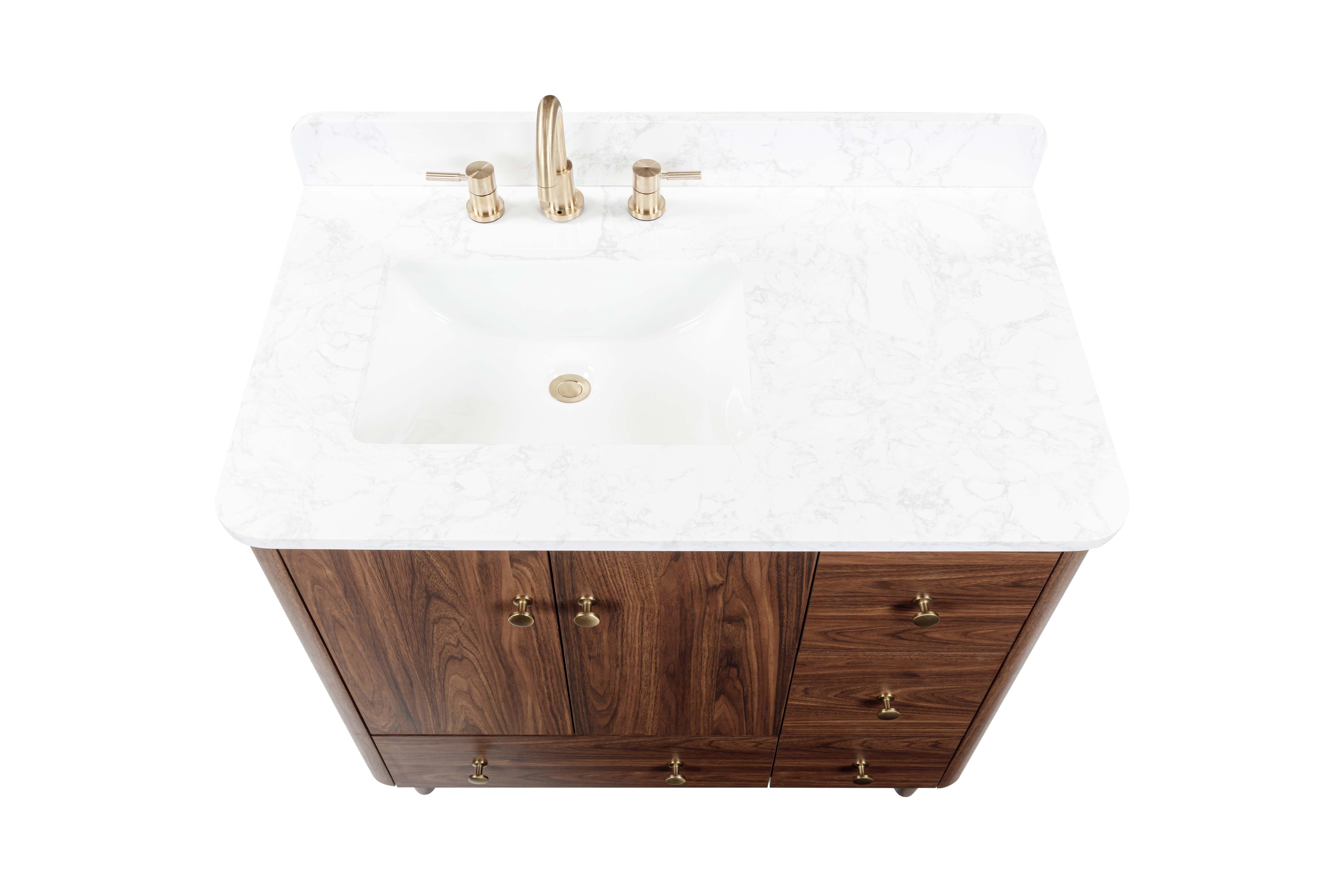 The sink position is offset and not directly centered on the vanity top to allow for more space on the side of the vanity.