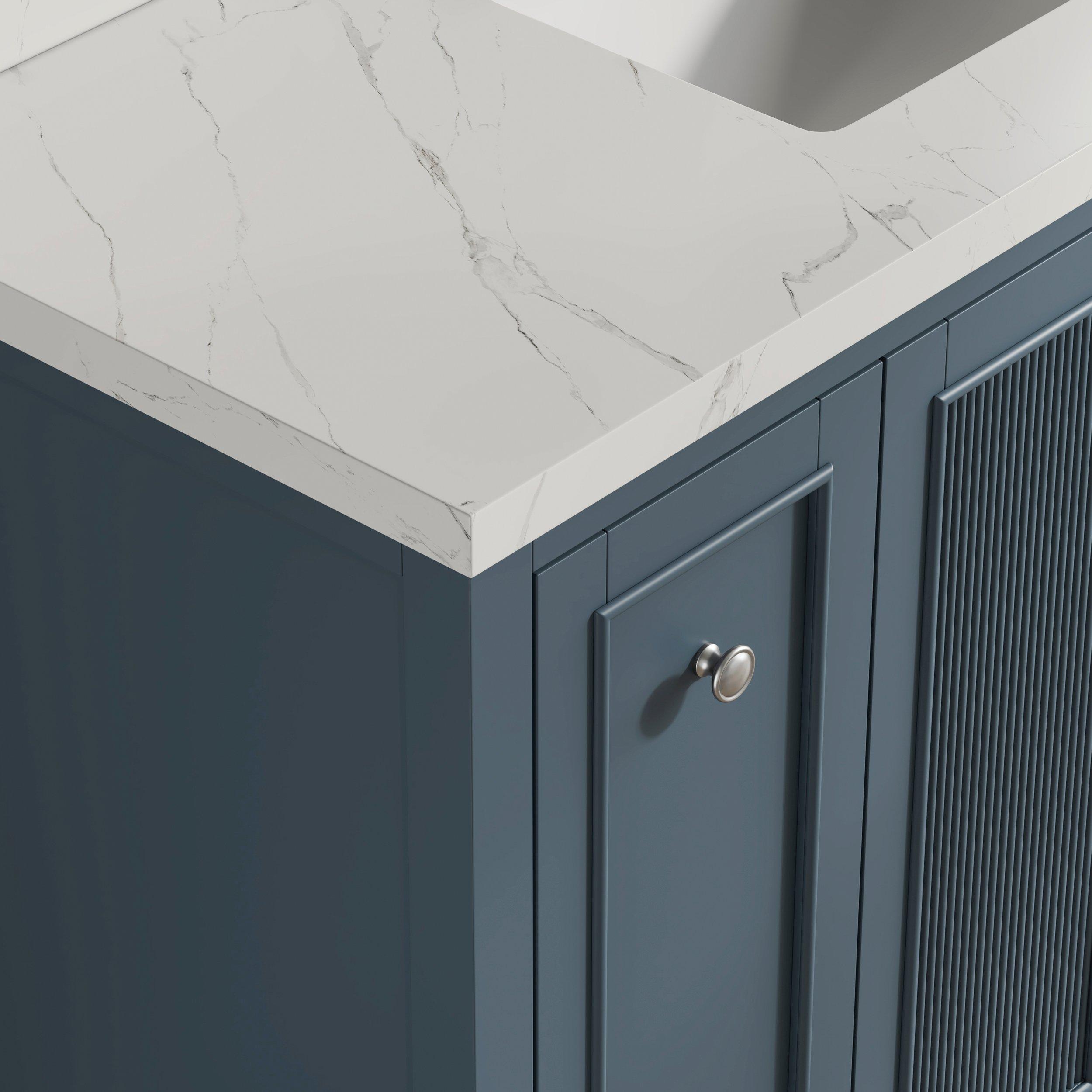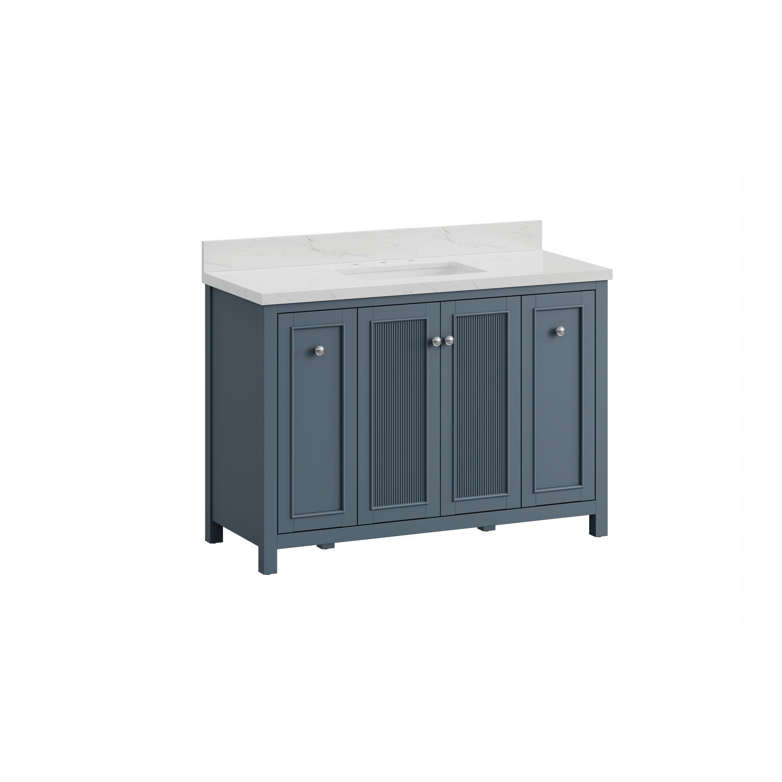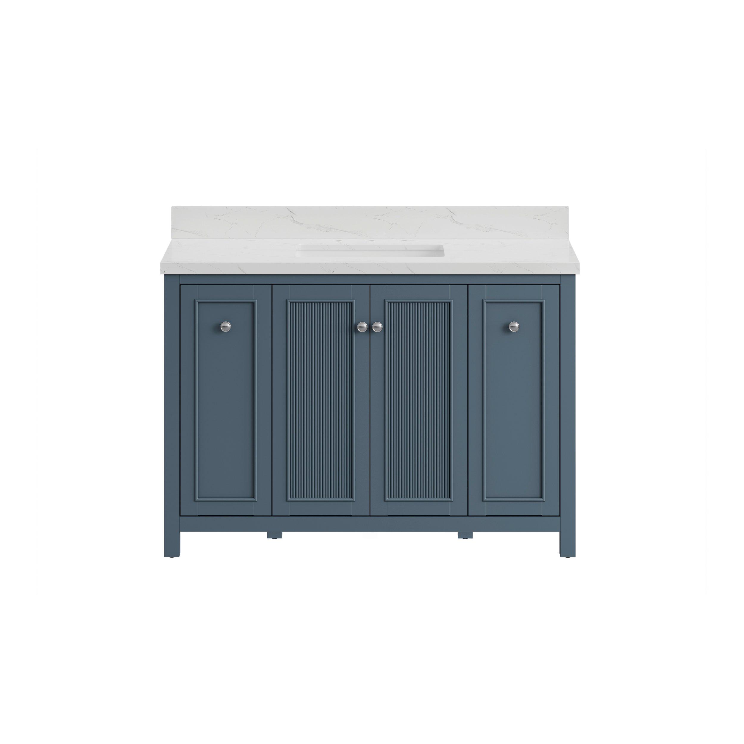 Complete your bathroom with the beautiful Lorain 49 in. Gray Vanity with Engineered Stone Top. This freestanding features durable solid wood, mdf cabinets in stunning blue with a white composite vanity top and n/a n/a hardware. A charming single undermount sink in brilliant white is included. The Lorain 49 in. Gray Vanity with Engineered Stone Top is a versatile choice to customize multiple bathroom settings.
