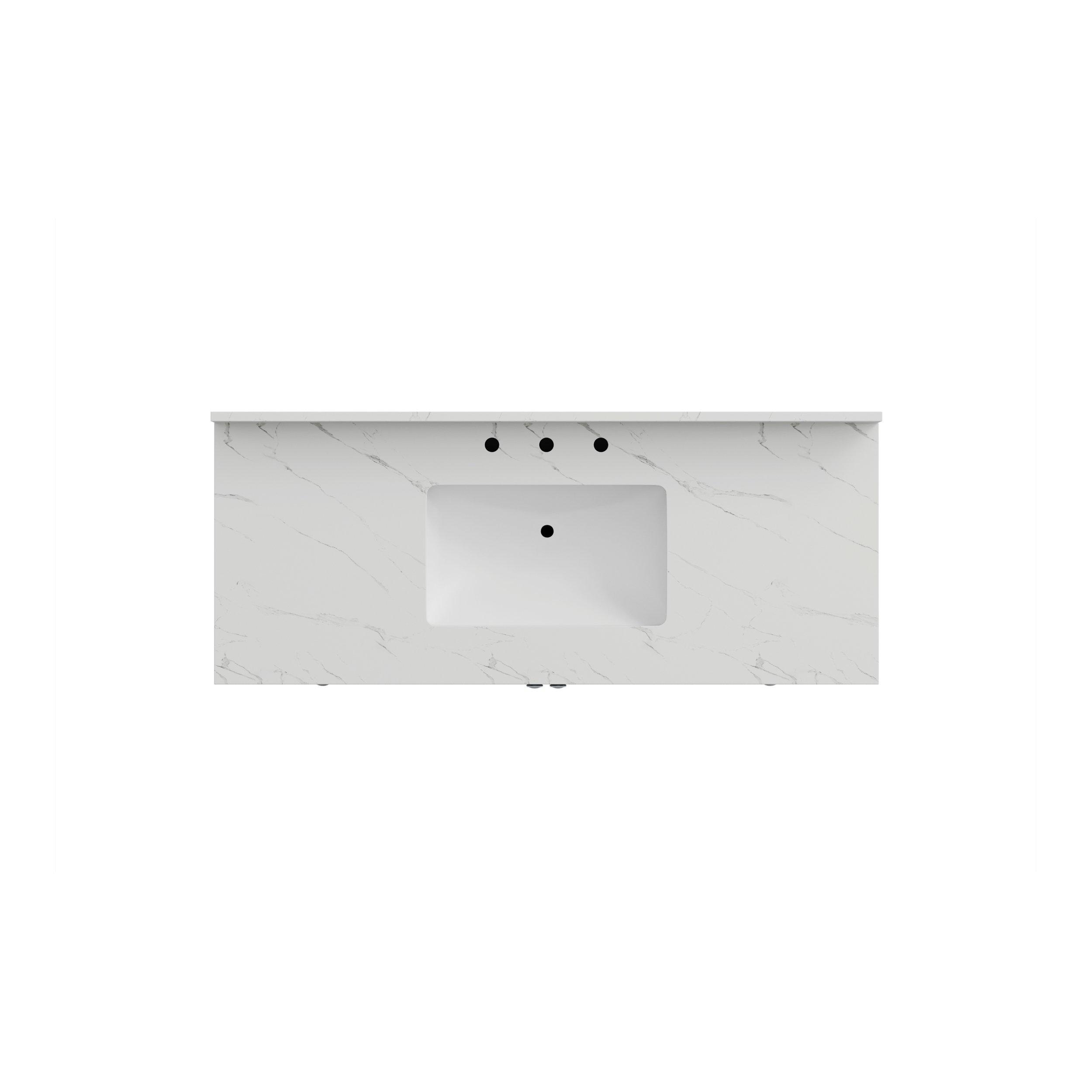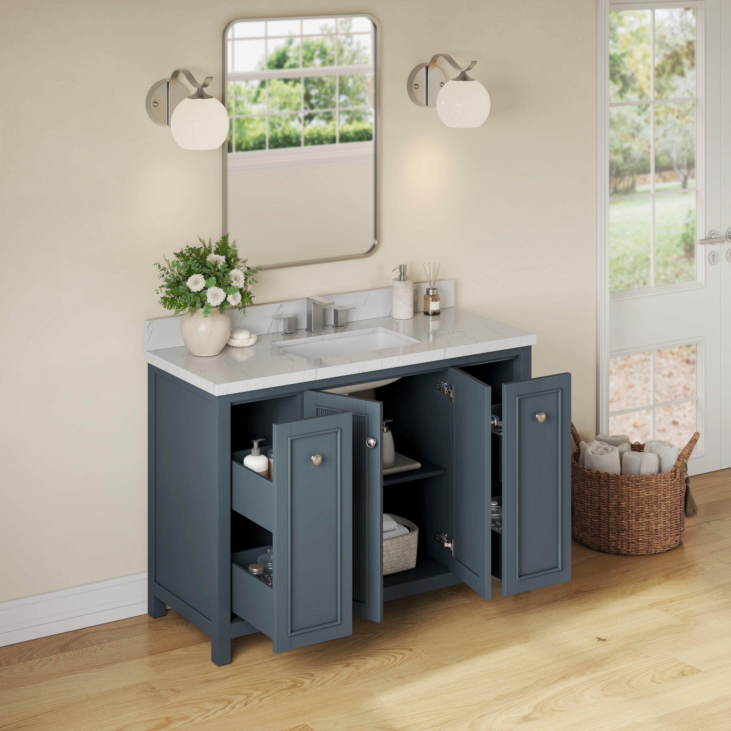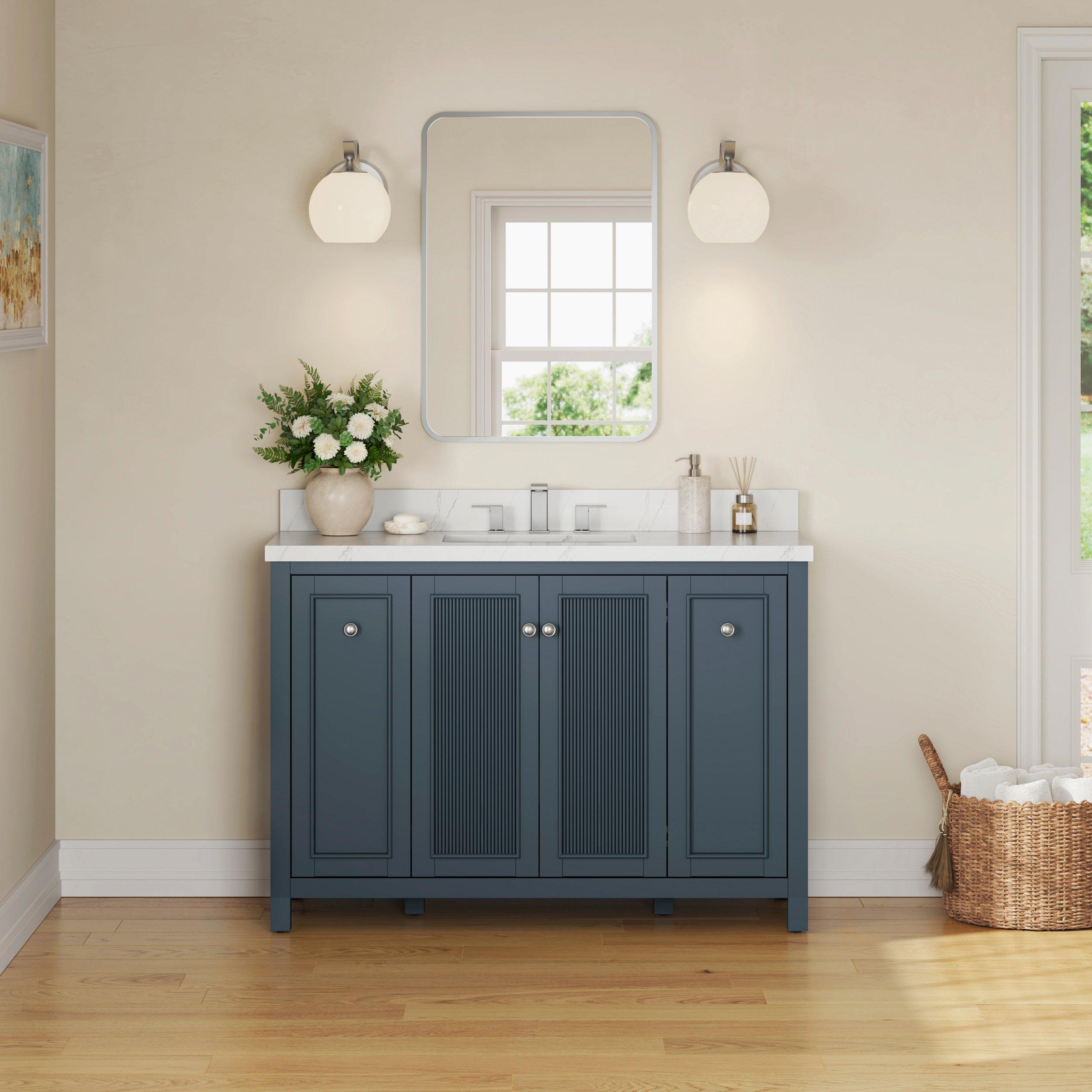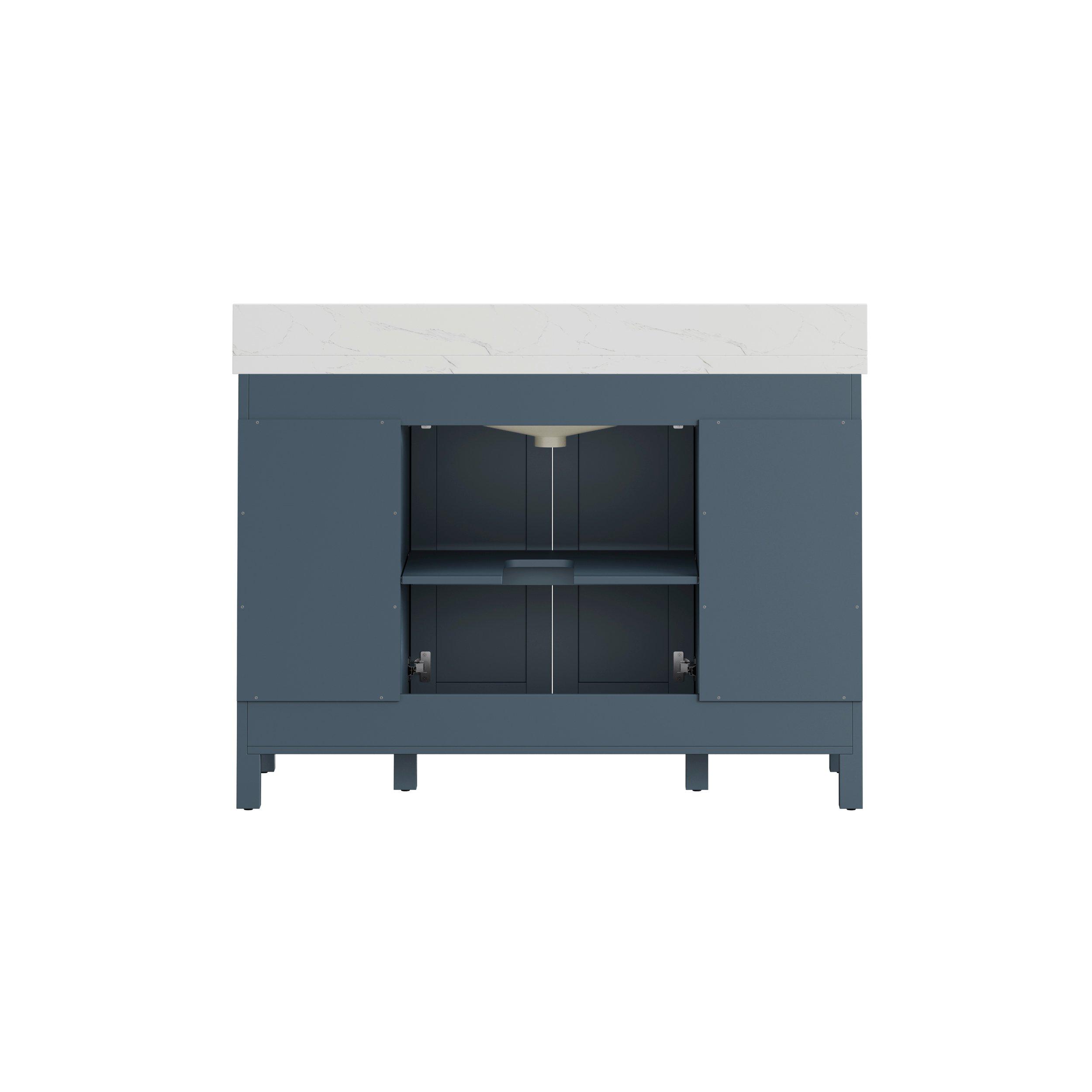 Complete your bathroom with the beautiful Lorain 49 in. Gray Vanity with Engineered Stone Top. This freestanding features durable solid wood, mdf cabinets in stunning blue with a white composite vanity top and n/a n/a hardware. A charming single undermount sink in brilliant white is included. The Lorain 49 in. Gray Vanity with Engineered Stone Top is a versatile choice to customize multiple bathroom settings.