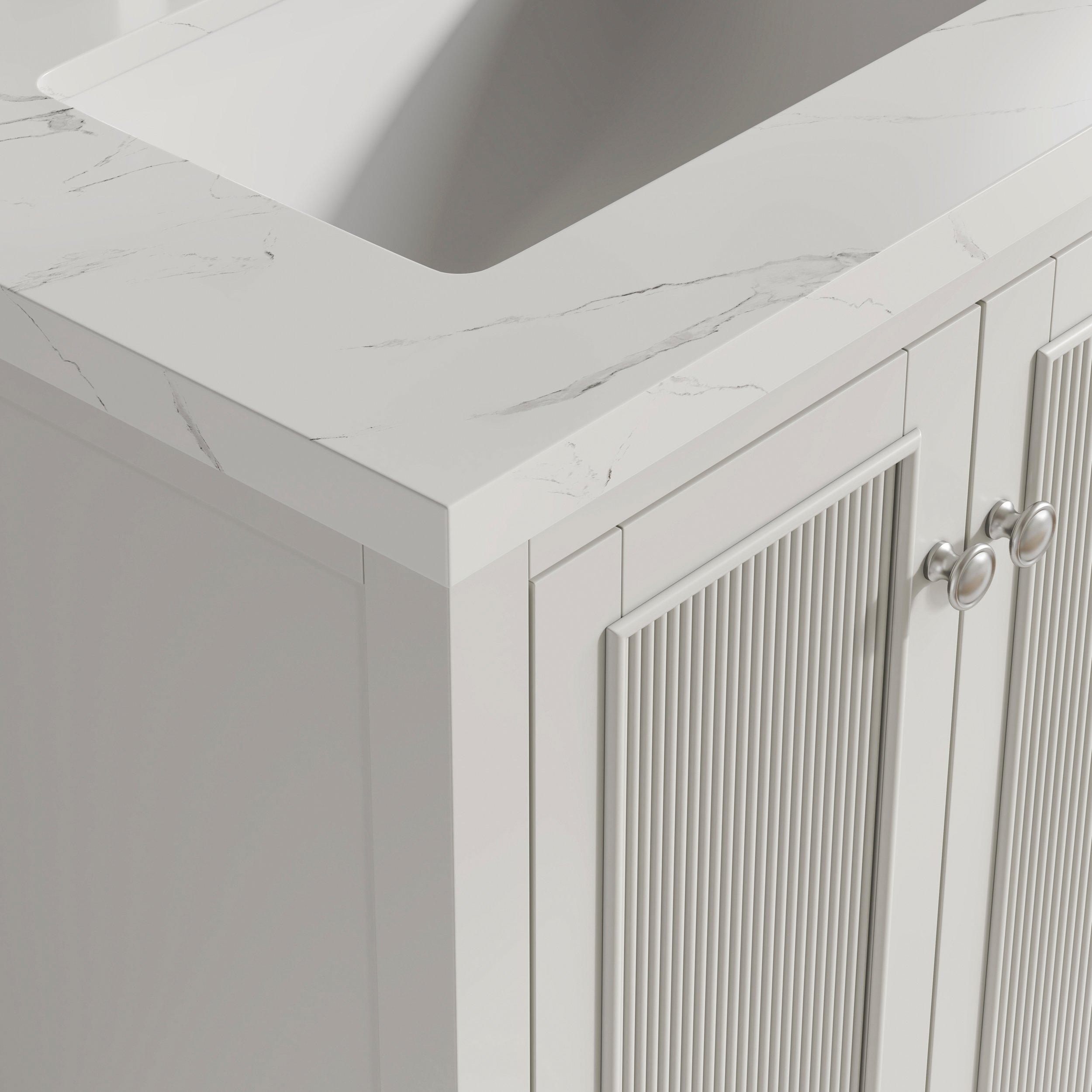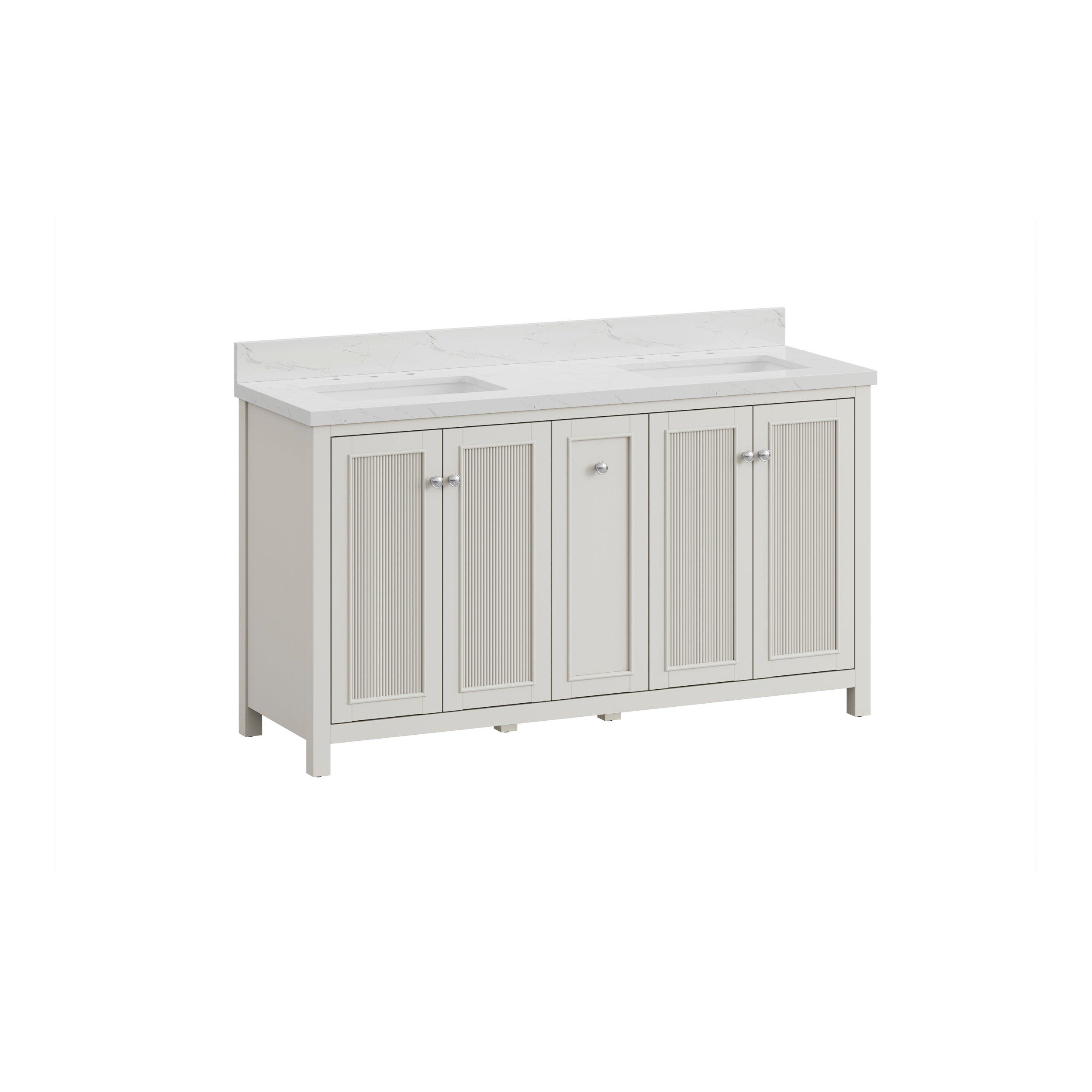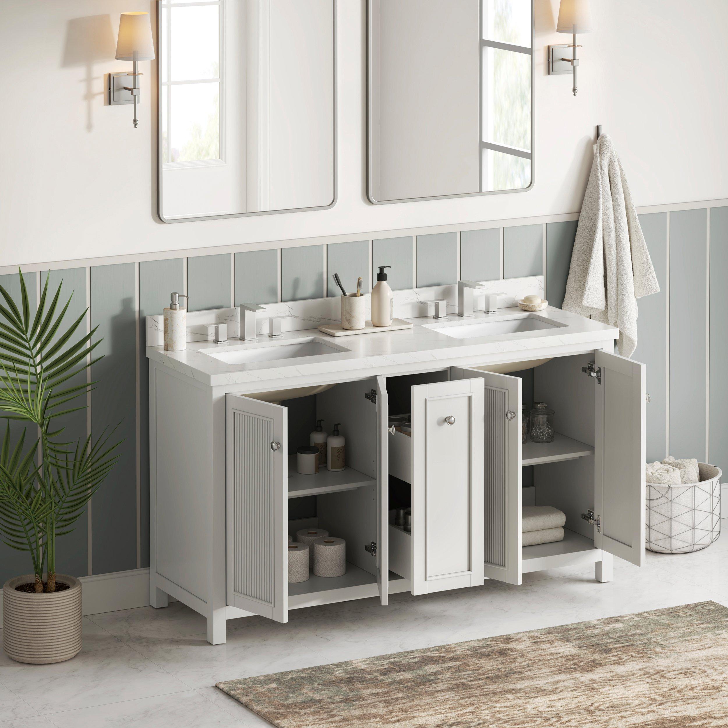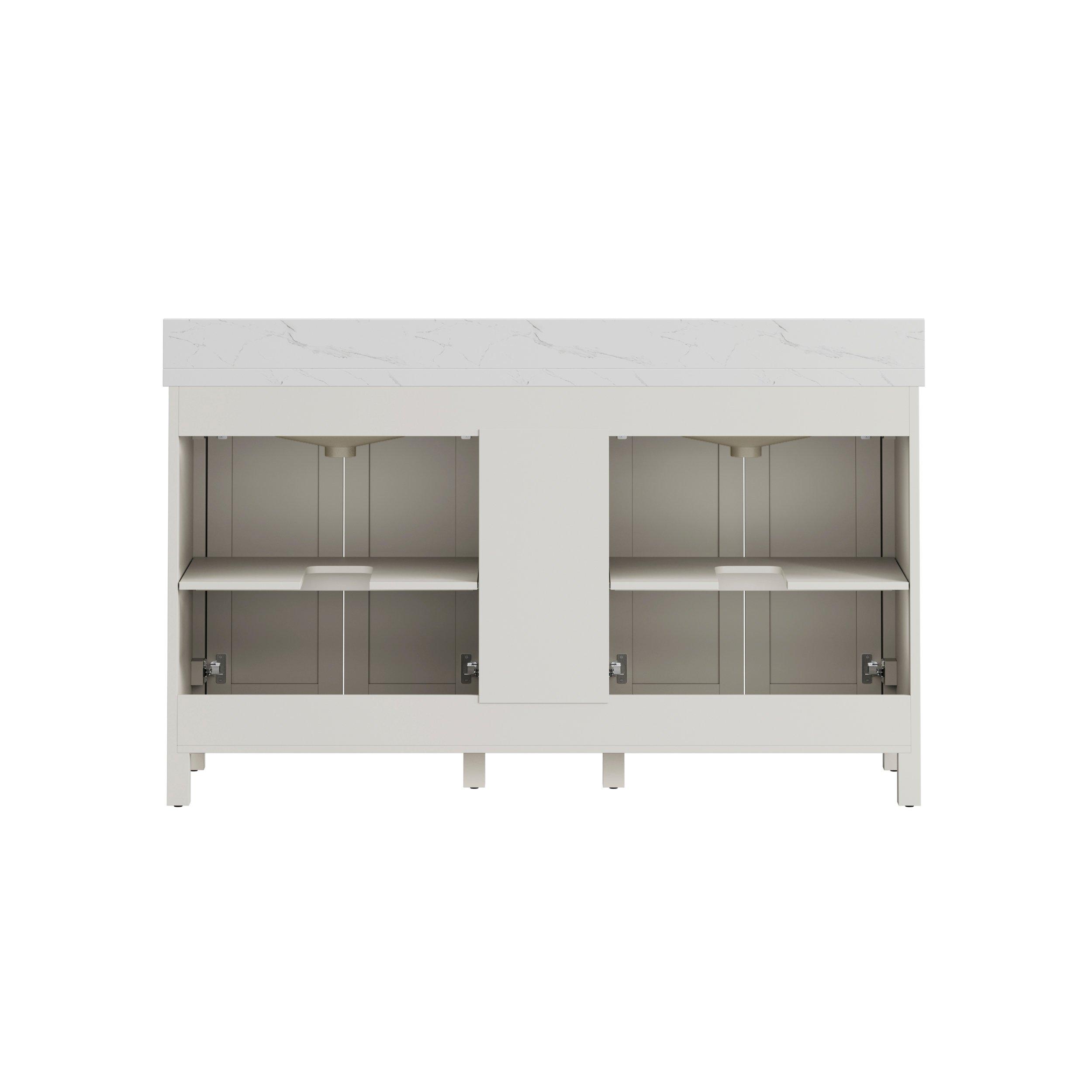 Complete your bathroom with the beautiful Lorain 61 in. White Vanity with Enginnered Stone Top. This freestanding features durable solid wood, mdf cabinets in stunning white with a white composite vanity top and n/a n/a hardware. A charming double undermount sink in brilliant white is included. The Lorain 61 in. White Vanity with Enginnered Stone Top is a versatile choice to customize multiple bathroom settings.