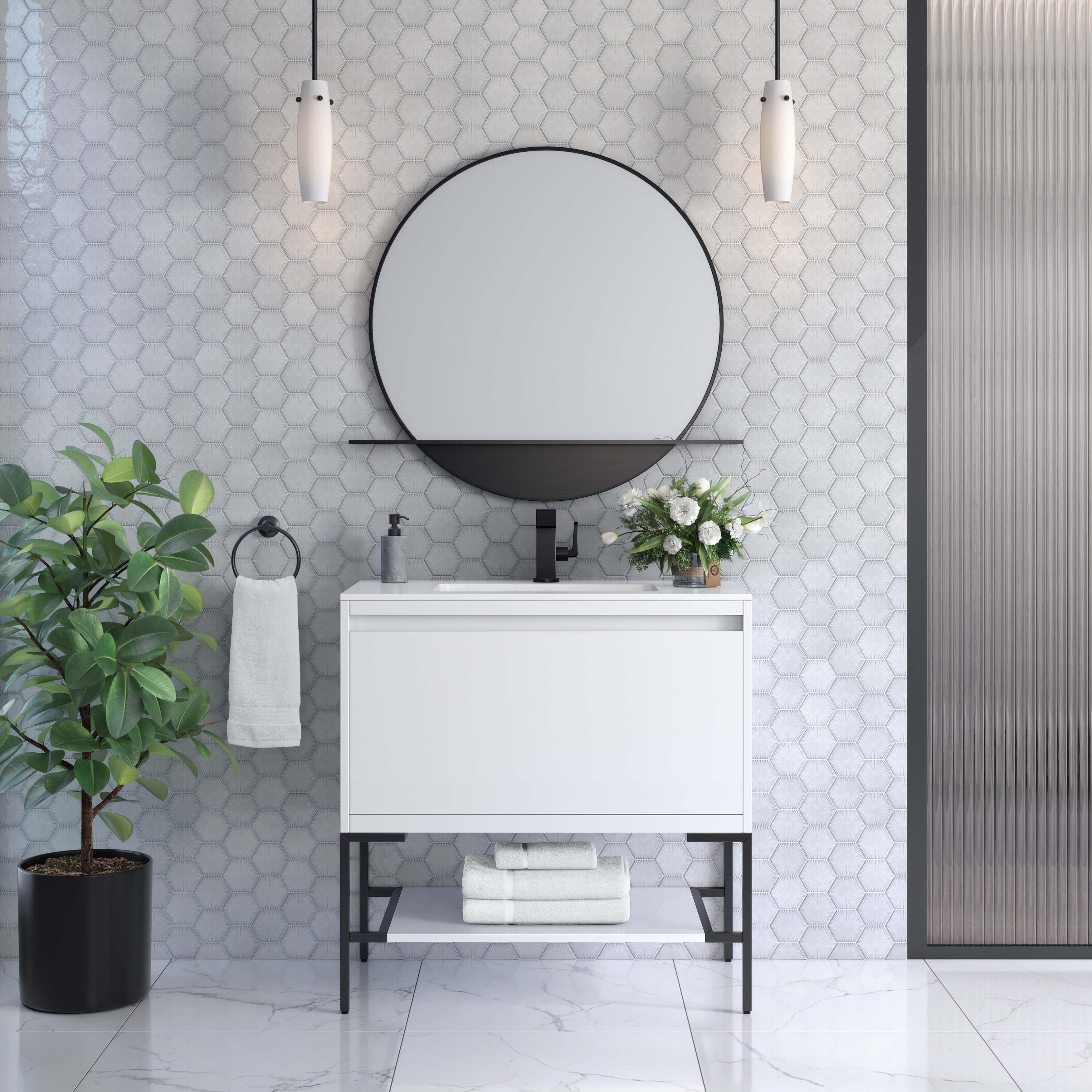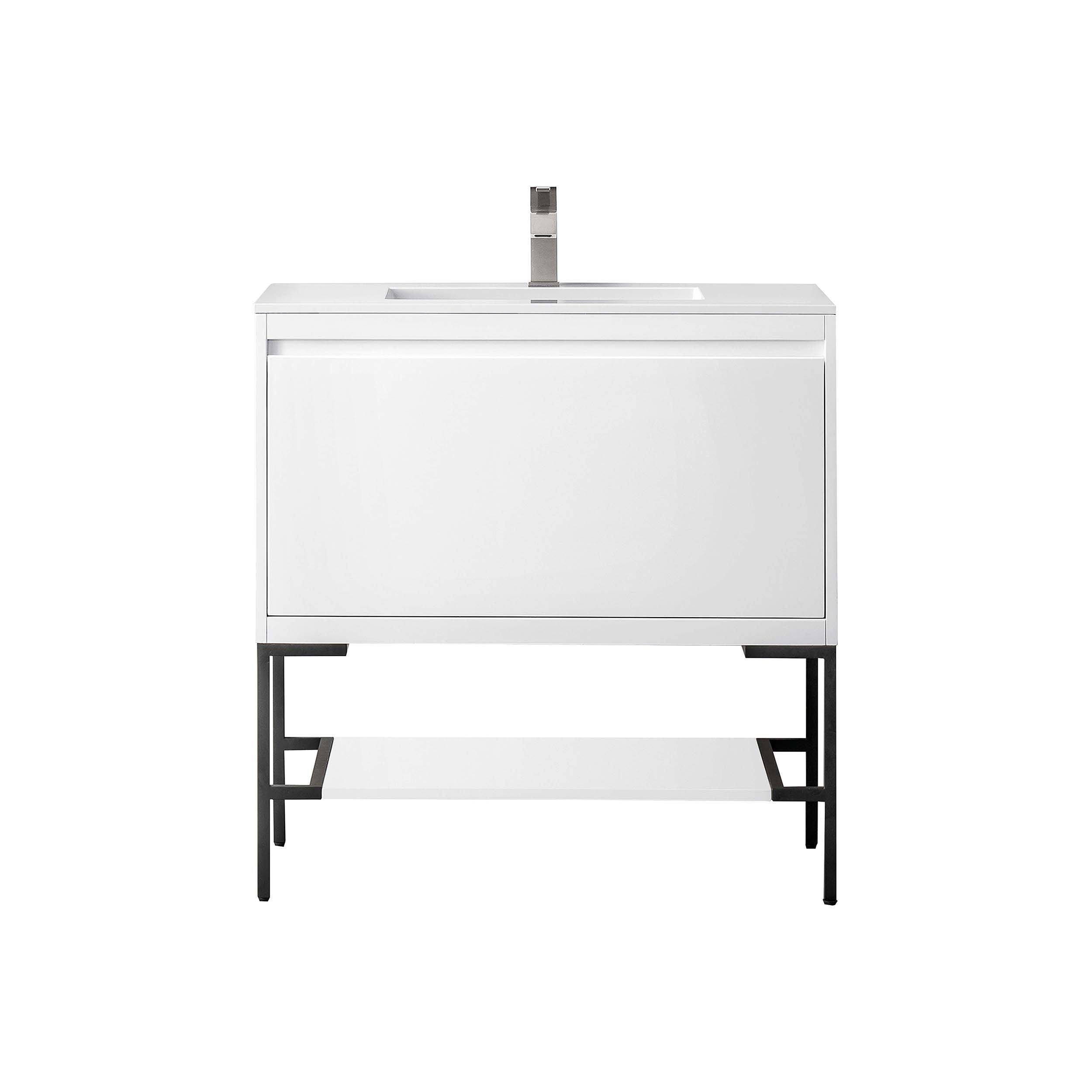 Complete your bathroom with the beautiful Mantova 35.4 in. White and Black Vanity with White Engineered Stone Top. This freestanding features durable solid wood, plywood cabinets in stunning white with a white manufactured stone vanity top and polished black hardware. A charming single integral sink in brilliant white is included. The Mantova 35.4 in. White and Black Vanity with White Engineered Stone Top is a versatile choice to customize multiple bathroom settings.