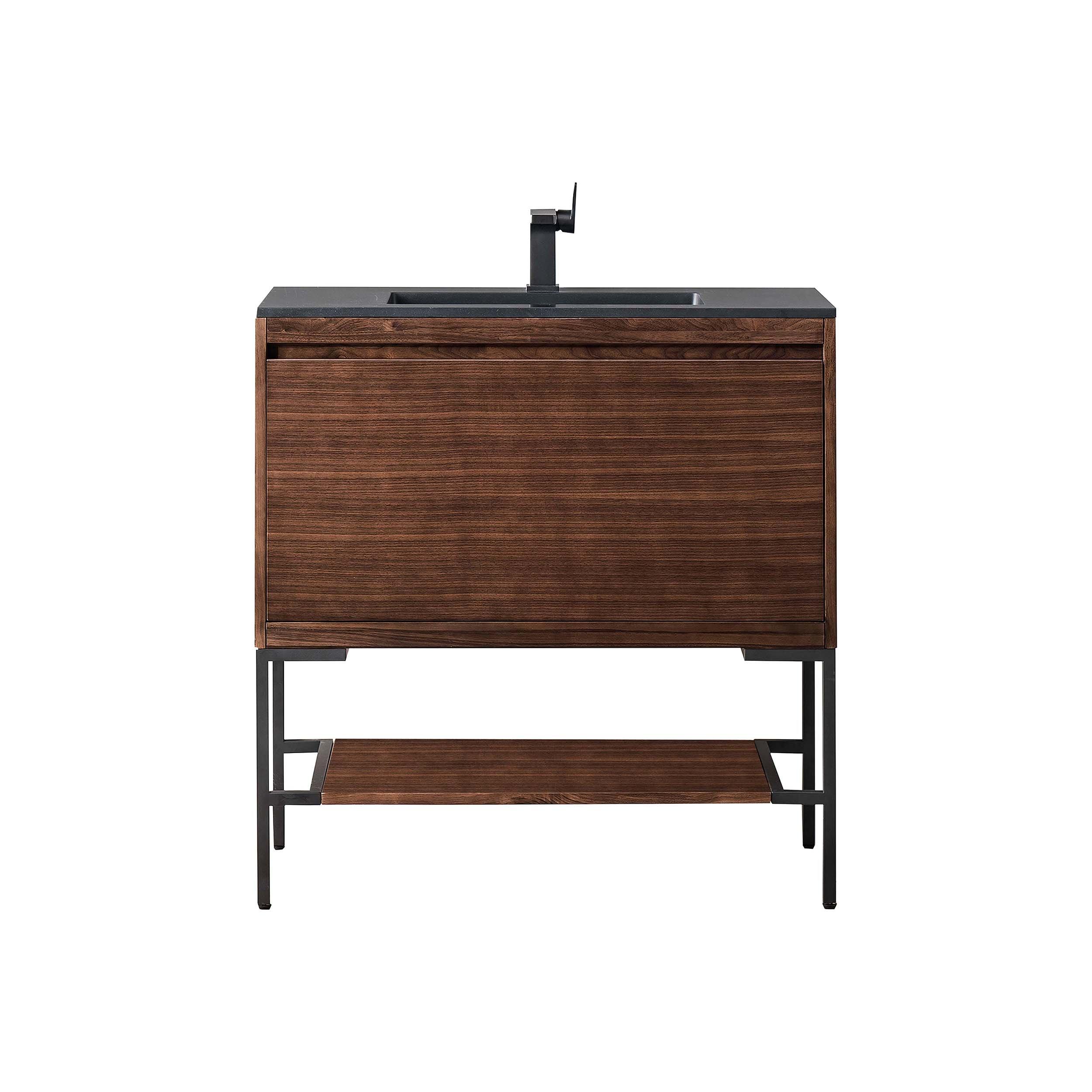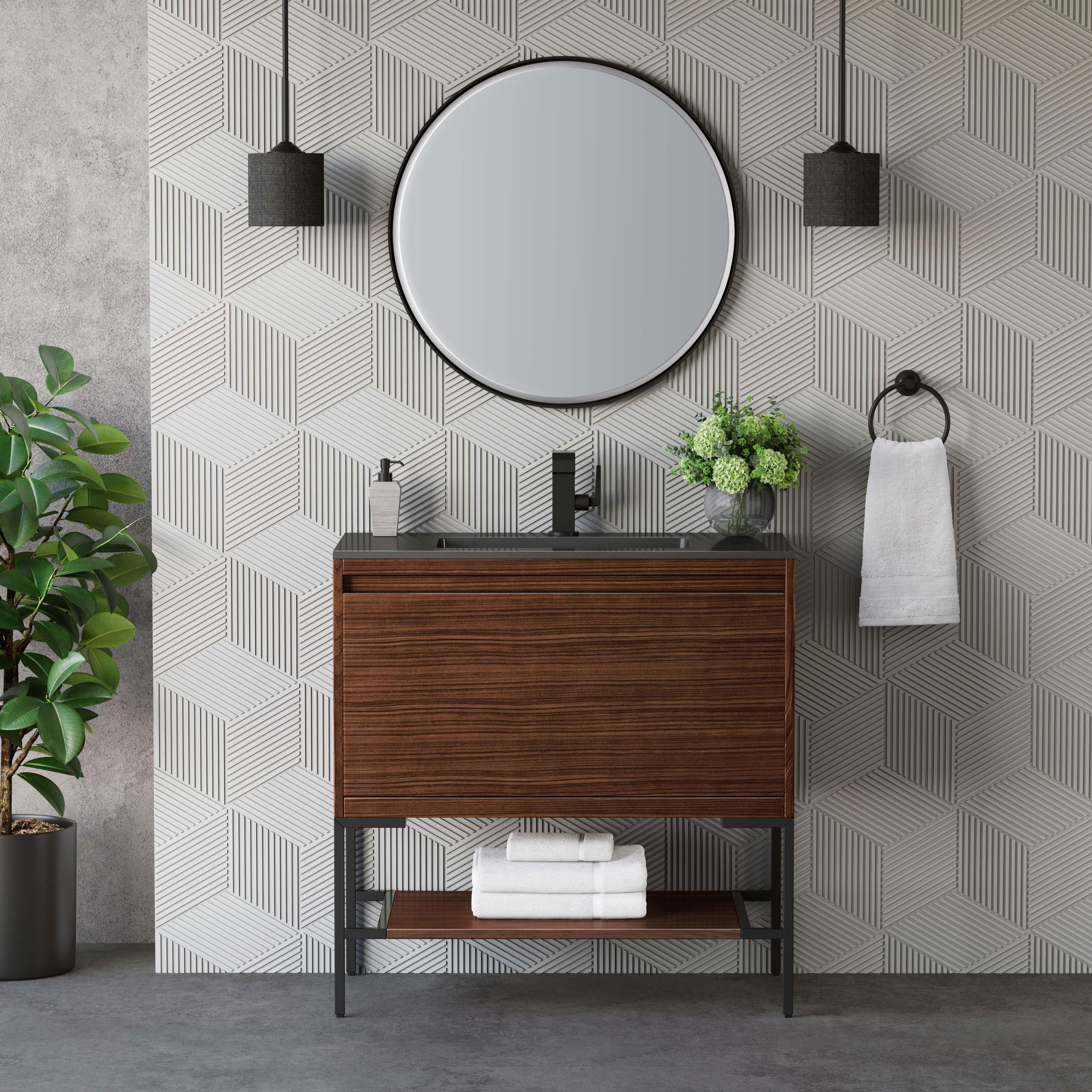 Complete your bathroom with the beautiful Mantova 35.4 in. Brown and Black Vanity with Black Engineered Stone Top. This freestanding features durable solid wood, plywood cabinets in stunning brown with a black manufactured stone vanity top and polished black hardware. A charming single integral sink in brilliant black is included. The Mantova 35.4 in. Brown and Black Vanity with Black Engineered Stone Top is a versatile choice to customize multiple bathroom settings.
