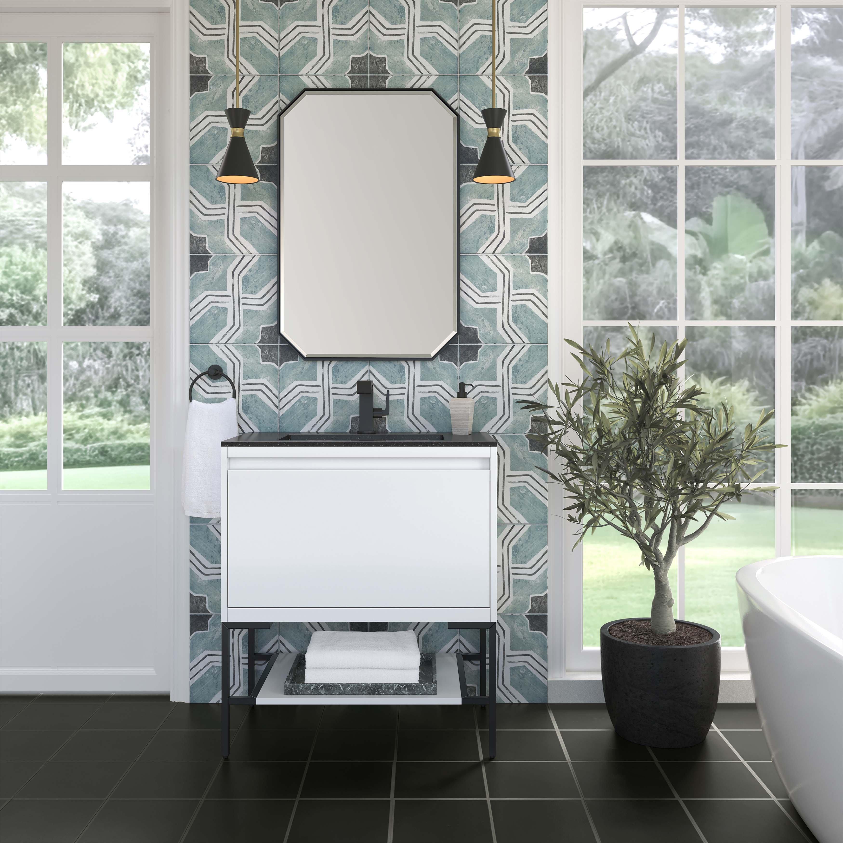 Complete your bathroom with the beautiful Mantova 31.5 in. White and Black Vanity with Black Engineered Stone Top. This freestanding features durable solid wood, plywood cabinets in stunning white with a black manufactured stone vanity top and polished black hardware. A charming single integral sink in brilliant black is included. The Mantova 31.5 in. White and Black Vanity with Black Engineered Stone Top is a versatile choice to customize multiple bathroom settings.