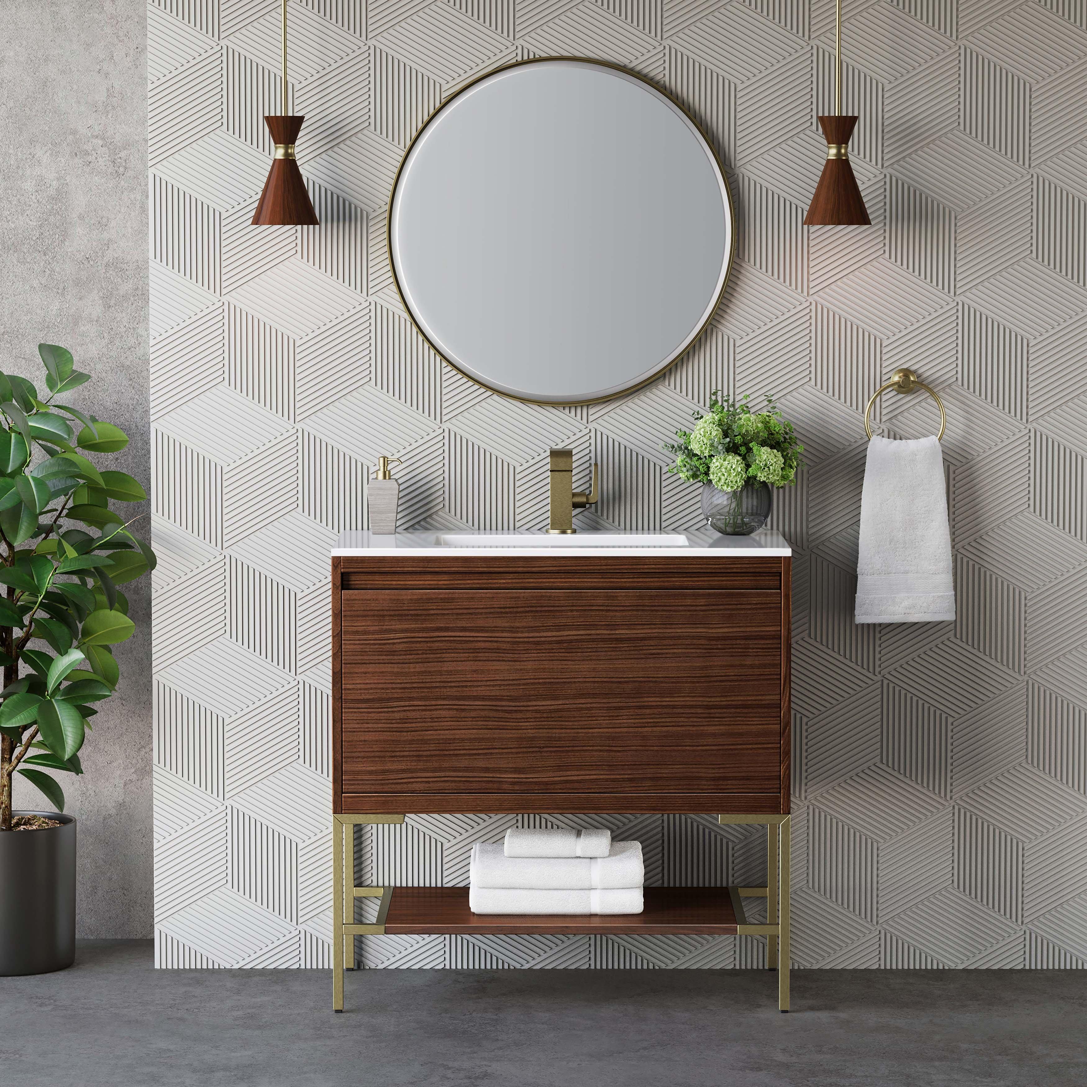 Complete your bathroom with the beautiful Mantova 35.4 in. Brown and Brass Vanity with White Engineered Stone Top. This freestanding features durable solid wood, plywood cabinets in stunning brown with a white manufactured stone vanity top and n/a brass hardware. A charming single integral sink in brilliant white is included. The Mantova 35.4 in. Brown and Brass Vanity with White Engineered Stone Top is a versatile choice to customize multiple bathroom settings.