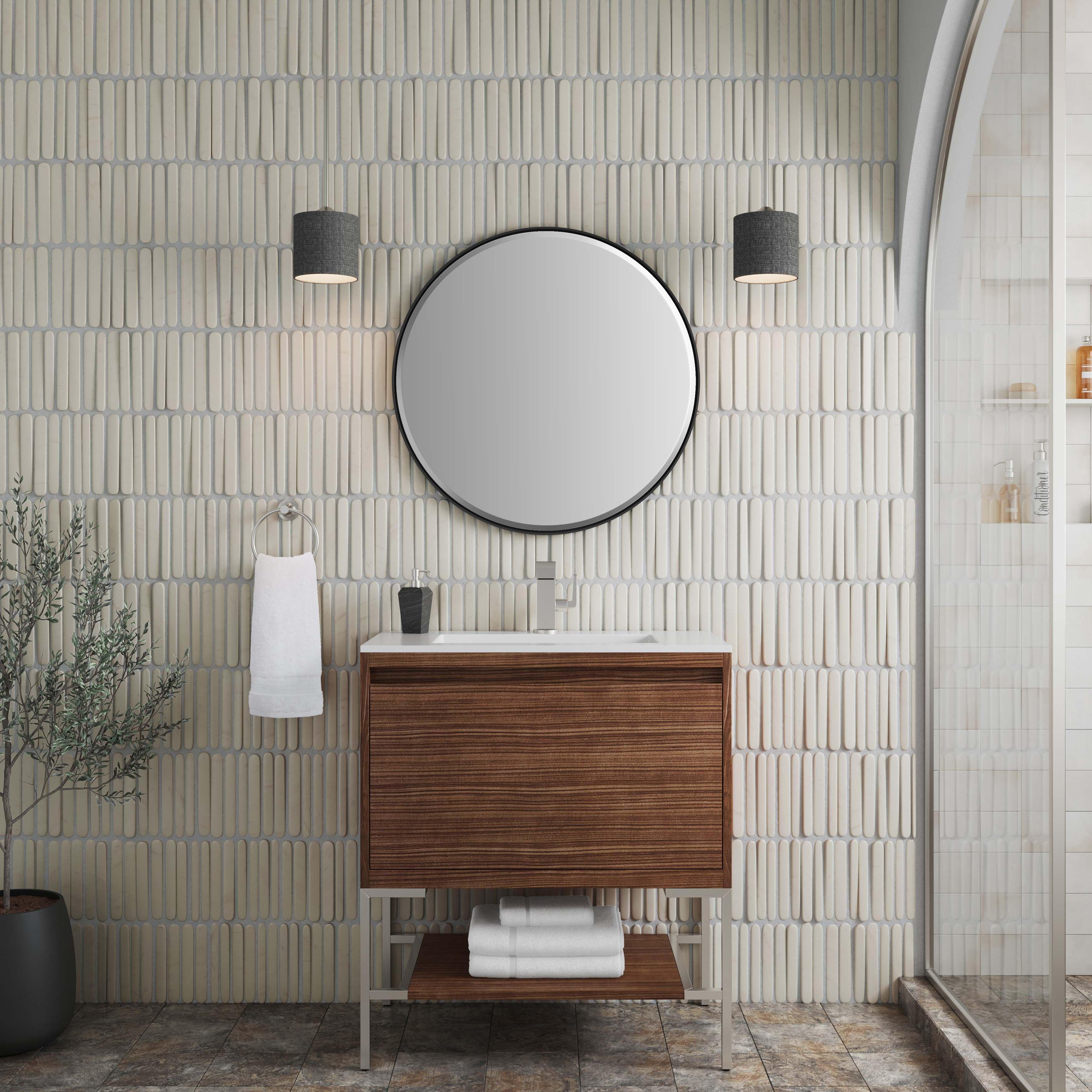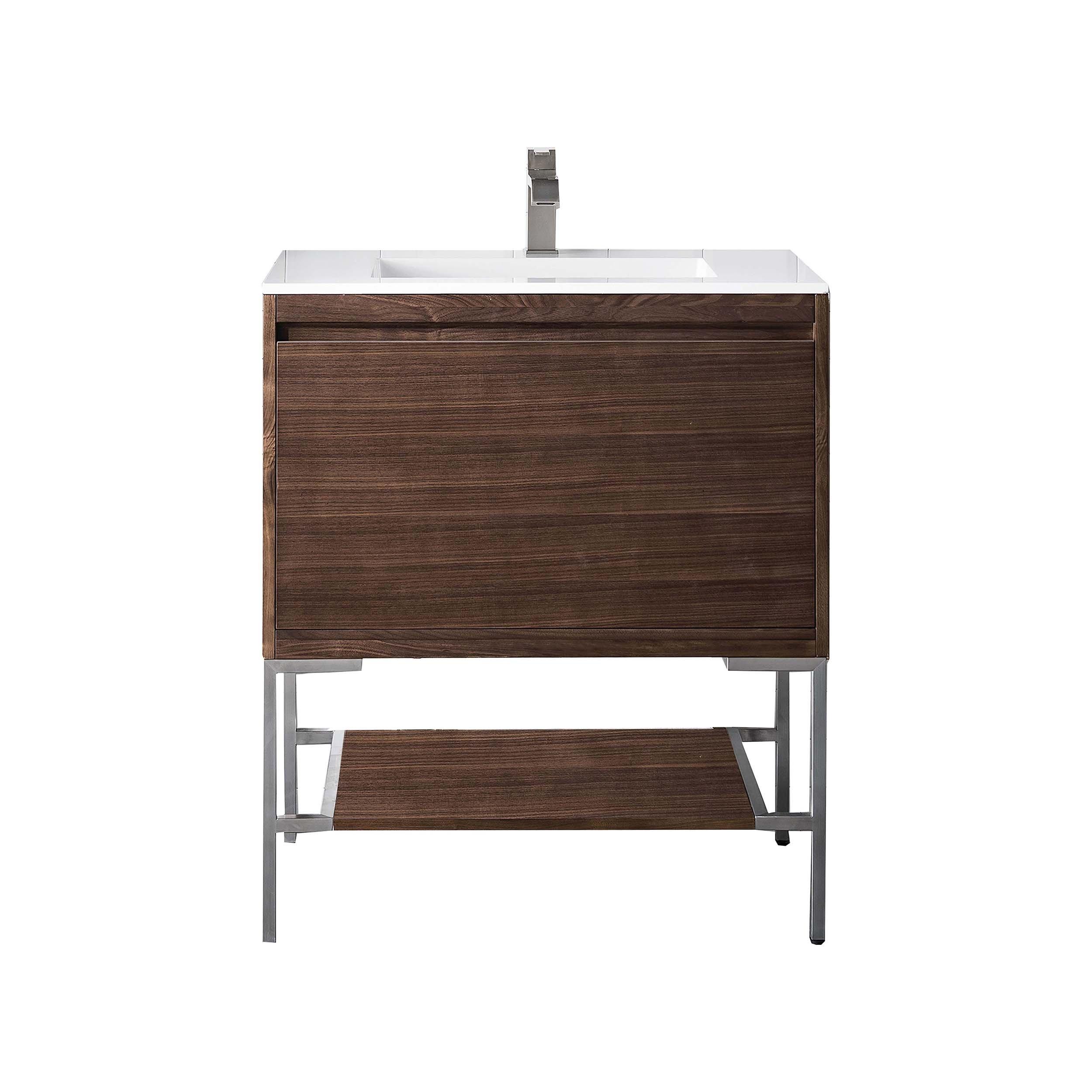 Complete your bathroom with the beautiful Mantova 31.5 in. Brown and Nickel Vanity with White Engineered Stone Top. This freestanding features durable solid wood, plywood cabinets in stunning brown with a white manufactured stone vanity top and brushed nickel hardware. A charming single integral sink in brilliant white is included. The Mantova 31.5 in. Brown and Nickel Vanity with White Engineered Stone Top is a versatile choice to customize multiple bathroom settings.