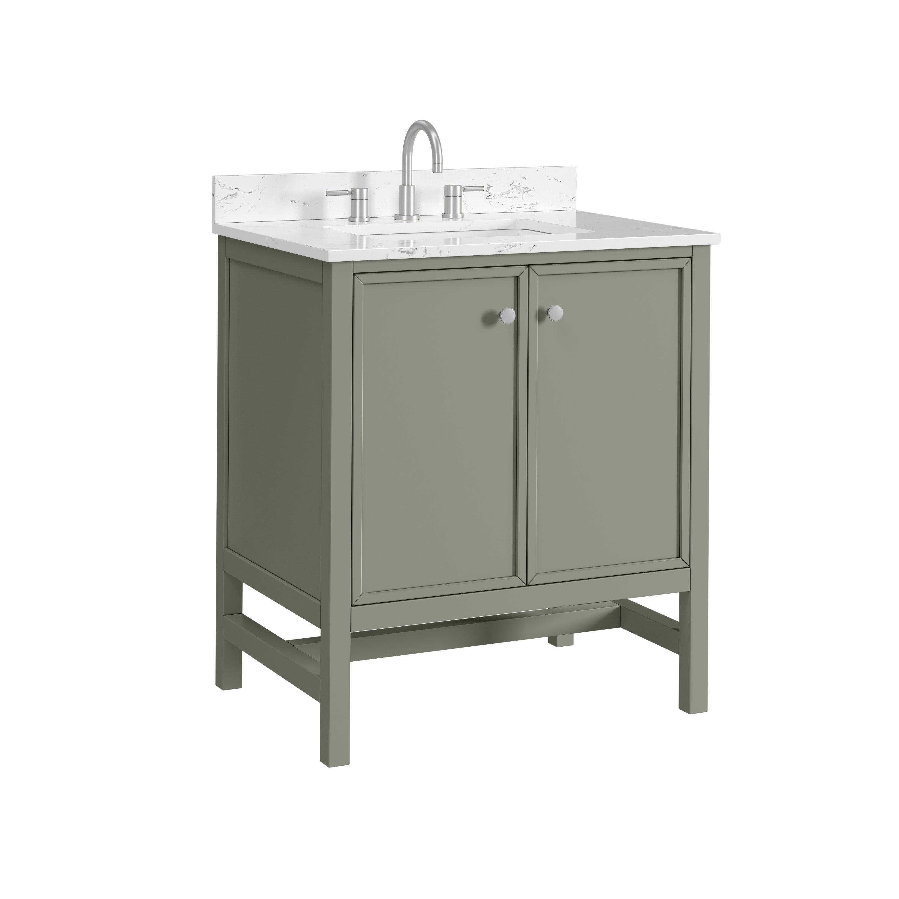 Tailor the look of your bathroom with the Piper 31 in. Green Vanity with Engineered Stone Top featuring gorgeous solid wood, mdf in green with 2 doors, 0 drawers, and 1 shelves. This piece is completed with beautiful matte nickel hardware and a single undermount white sink. The Piper 31 in. Green Vanity with Engineered Stone Top is a stunning addition to any bathroom setting.