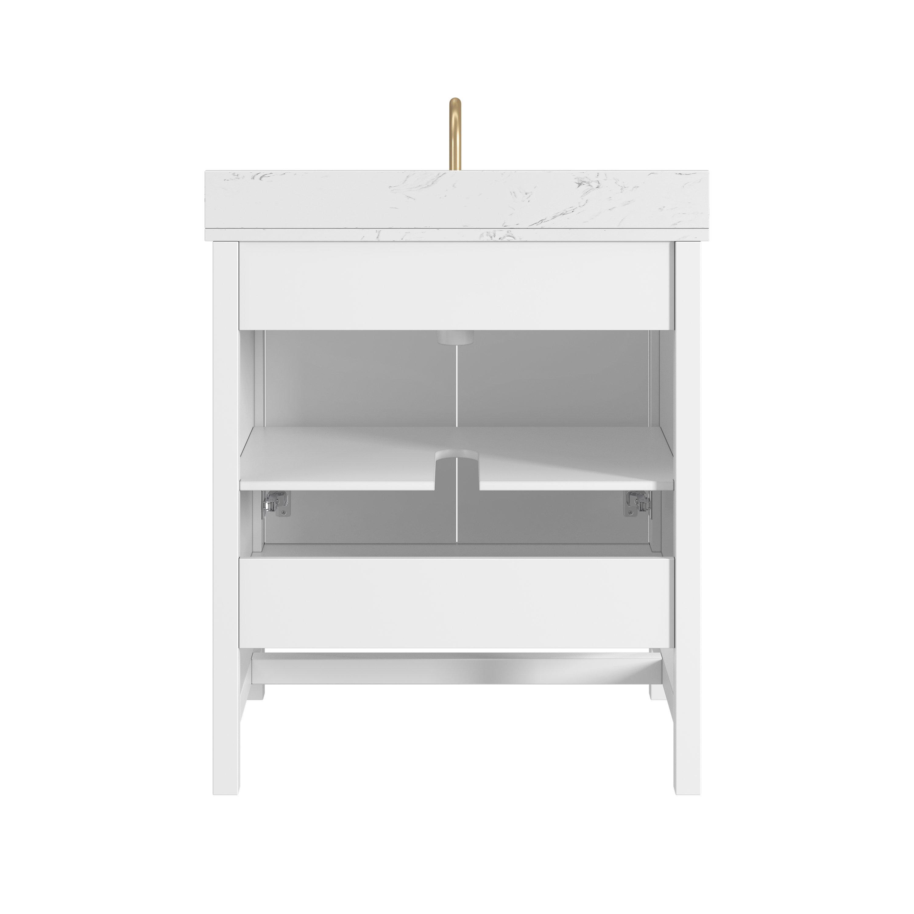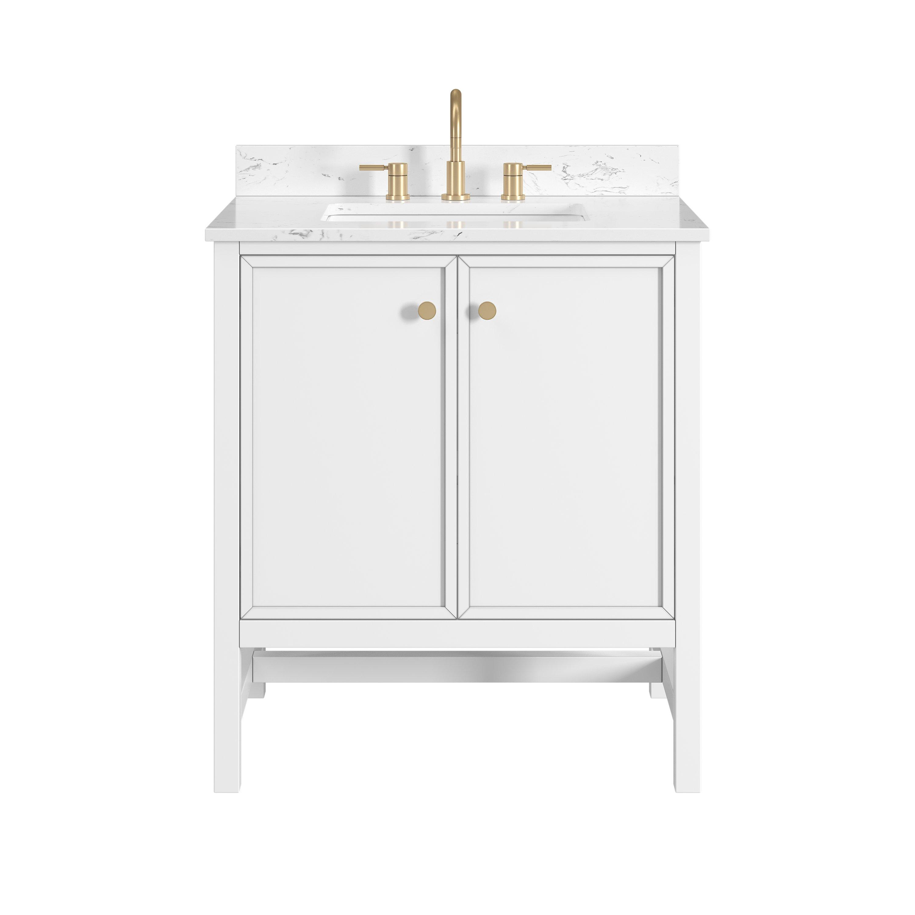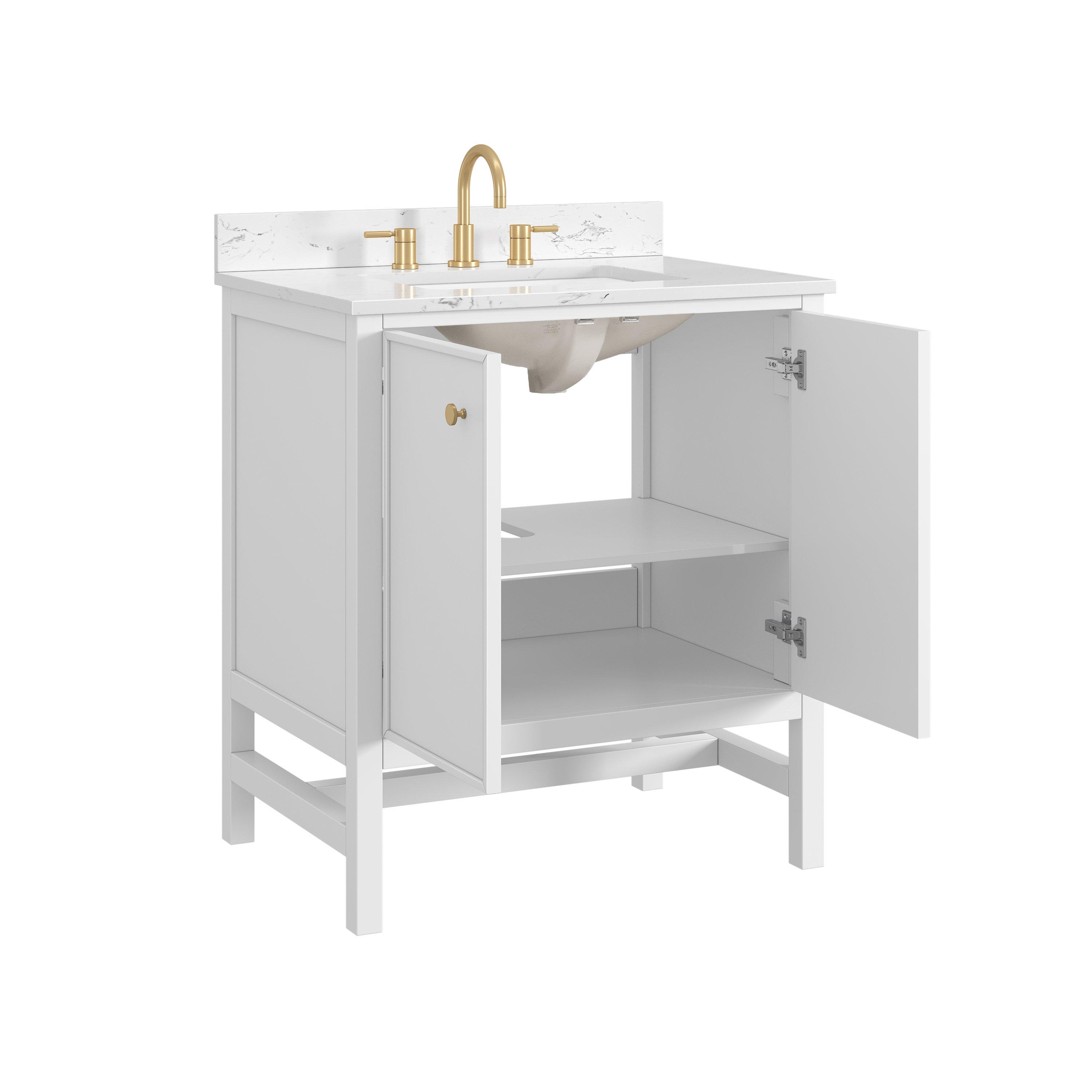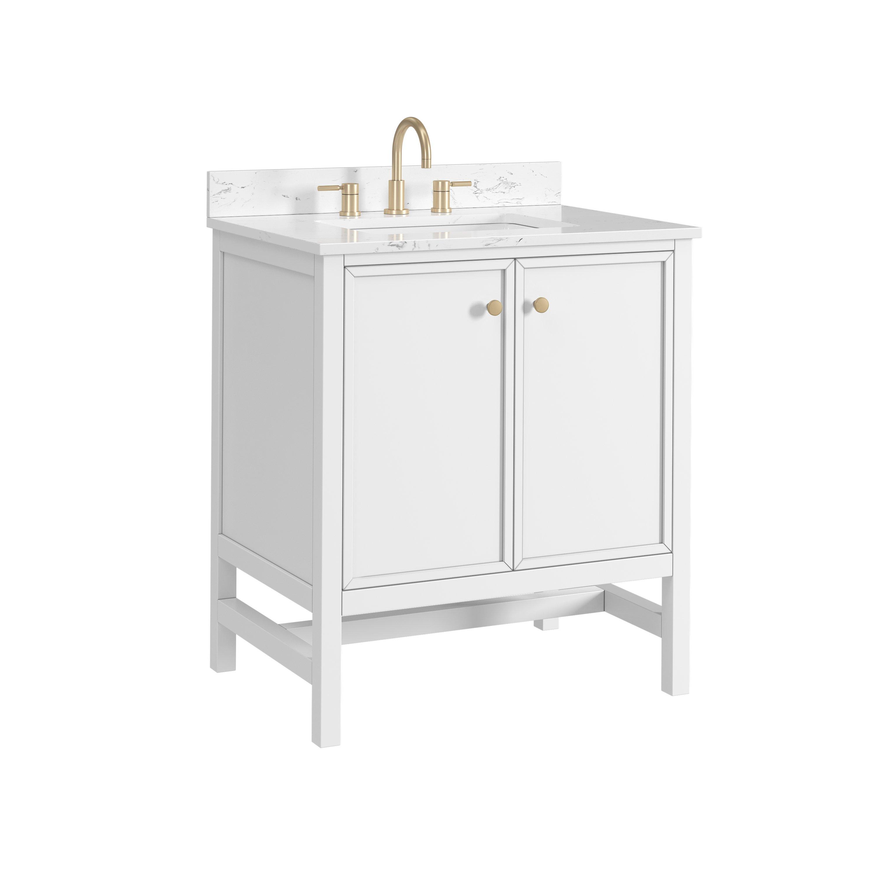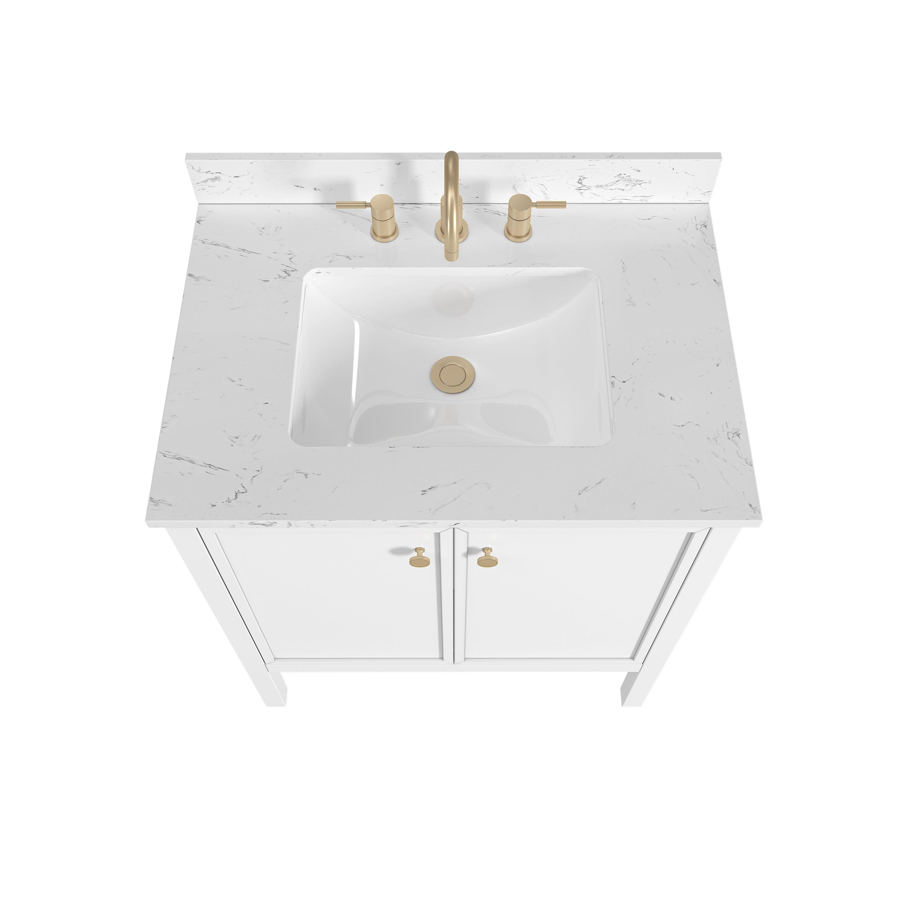 Complete your bathroom with the beautiful Piper 31 in. White Vanity with Engineered Stone Top. This freestanding features durable solid wood, mdf cabinets in stunning white with a white engineered stone vanity top and matte gold hardware. A charming single undermount sink in brilliant white is included. The Piper 31 in. White Vanity with Engineered Stone Top is a versatile choice to customize multiple bathroom settings.