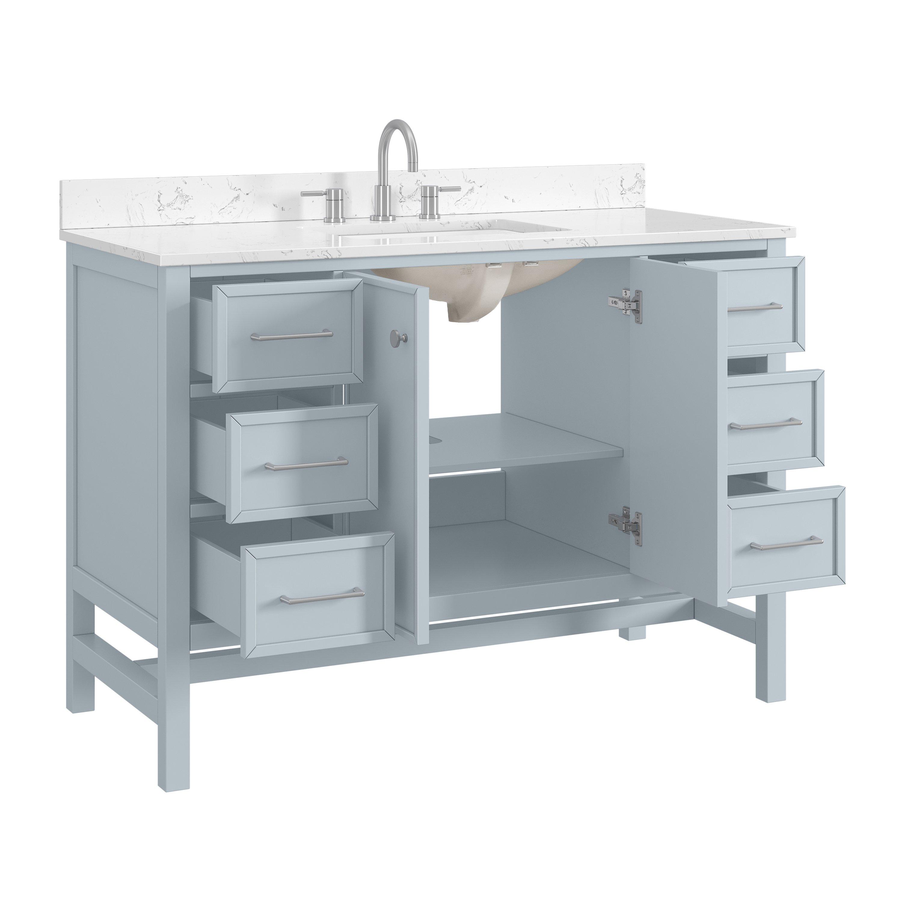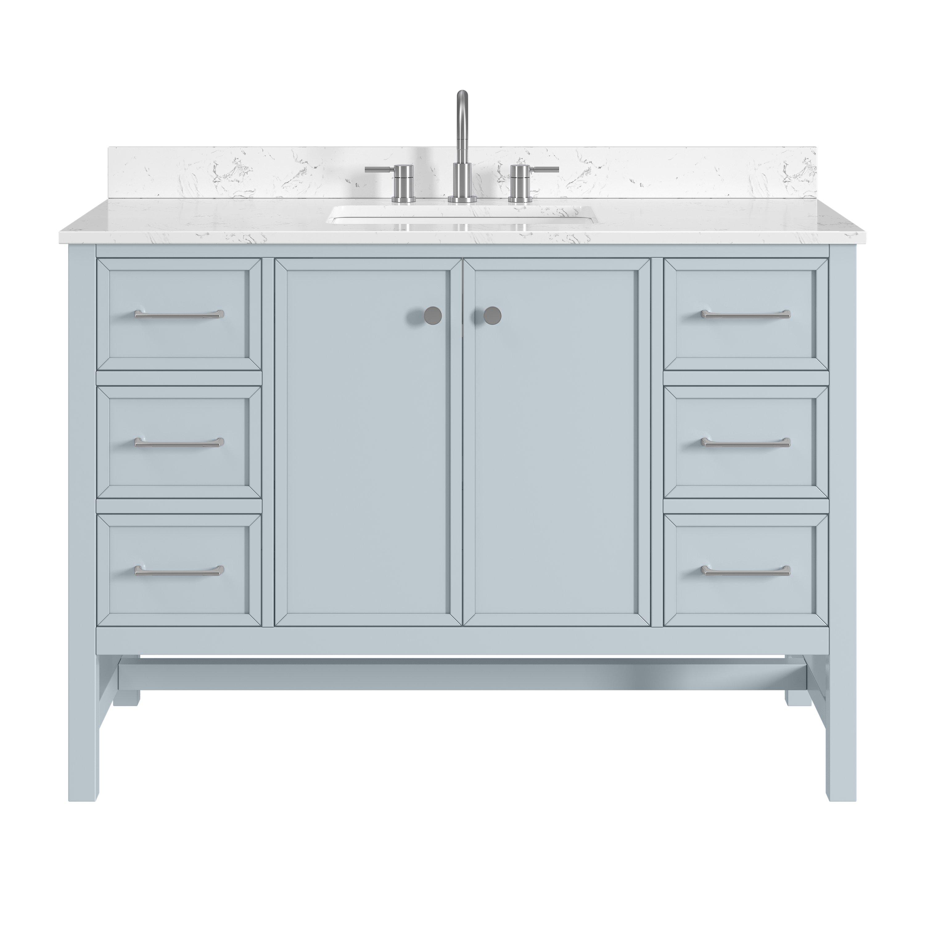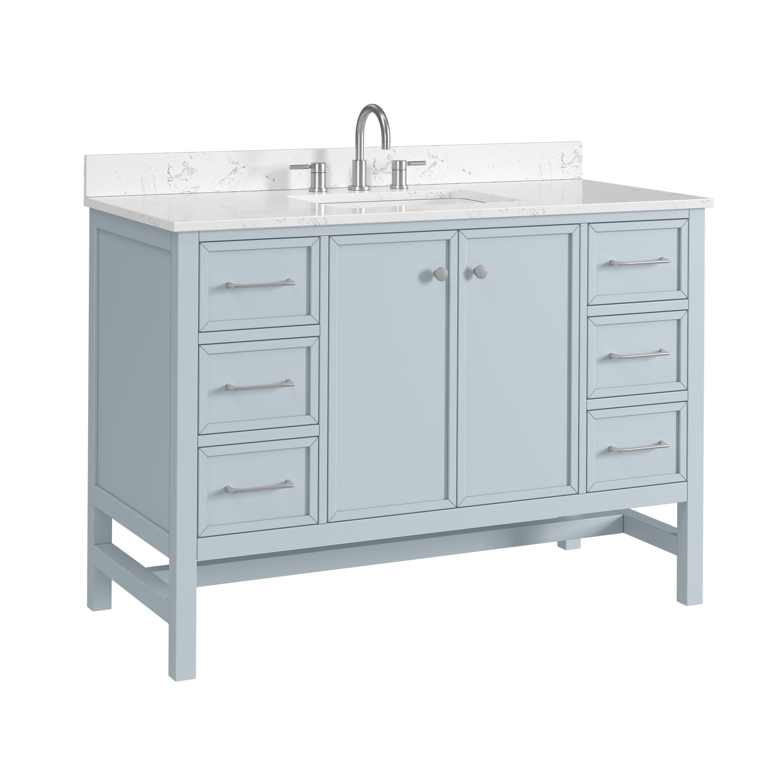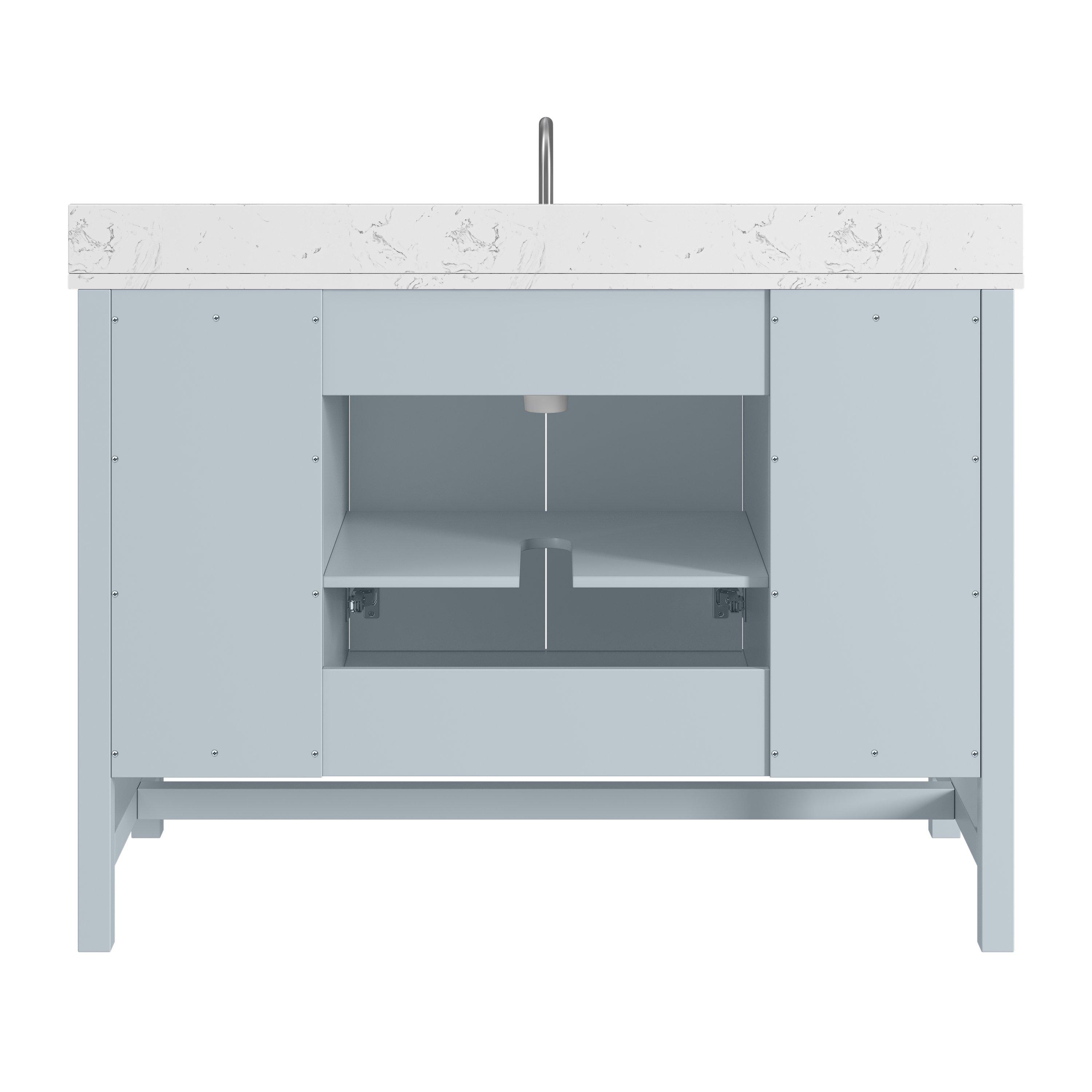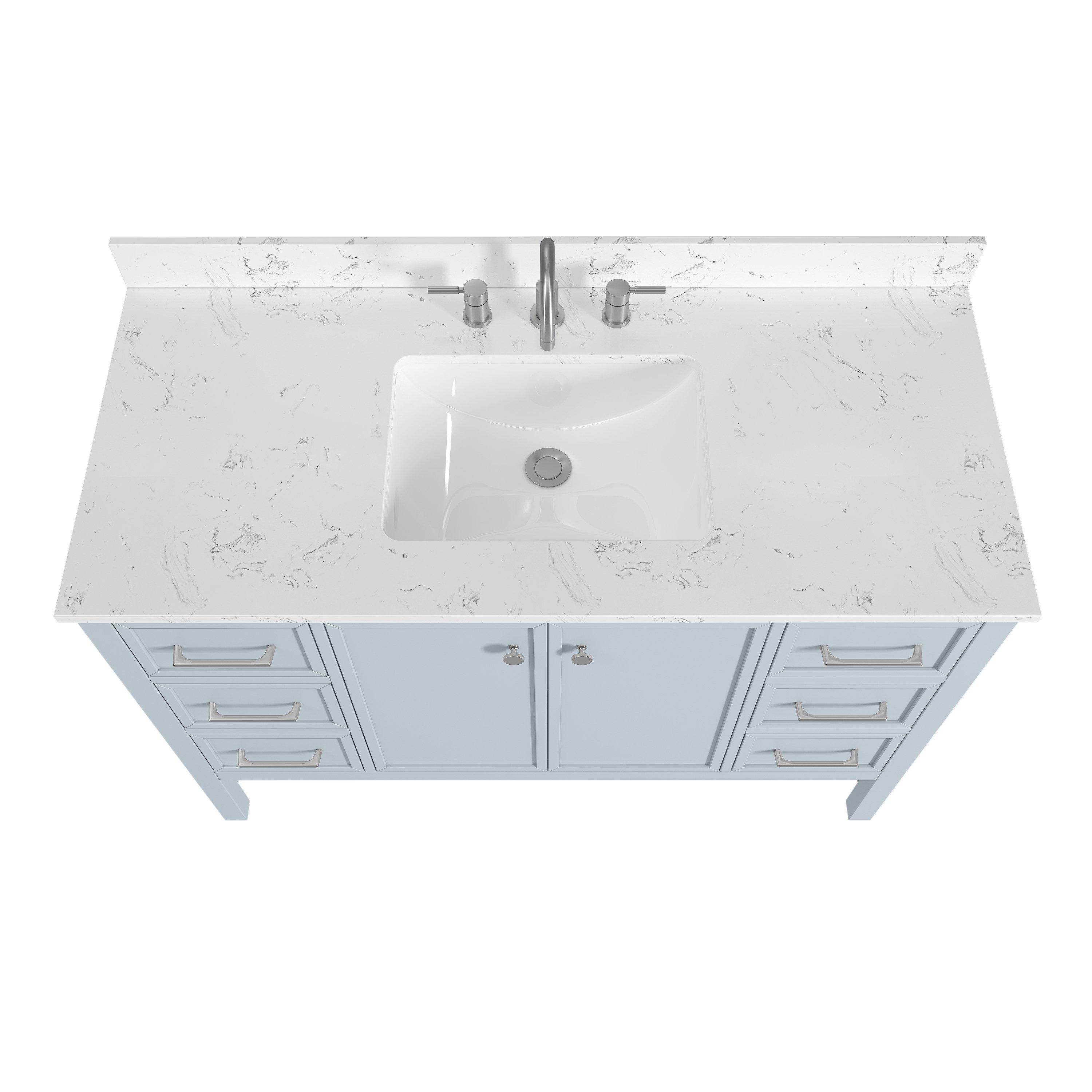 Tailor the look of your bathroom with the Piper 49 in. Blue Vanity with Engineered Stone Top featuring gorgeous solid wood, mdf in blue with 2 doors, 6 drawers, and 1 shelves. This piece is completed with beautiful polished chrome hardware and a single undermount white sink. The Piper 49 in. Blue Vanity with Engineered Stone Top is a stunning addition to any bathroom setting.