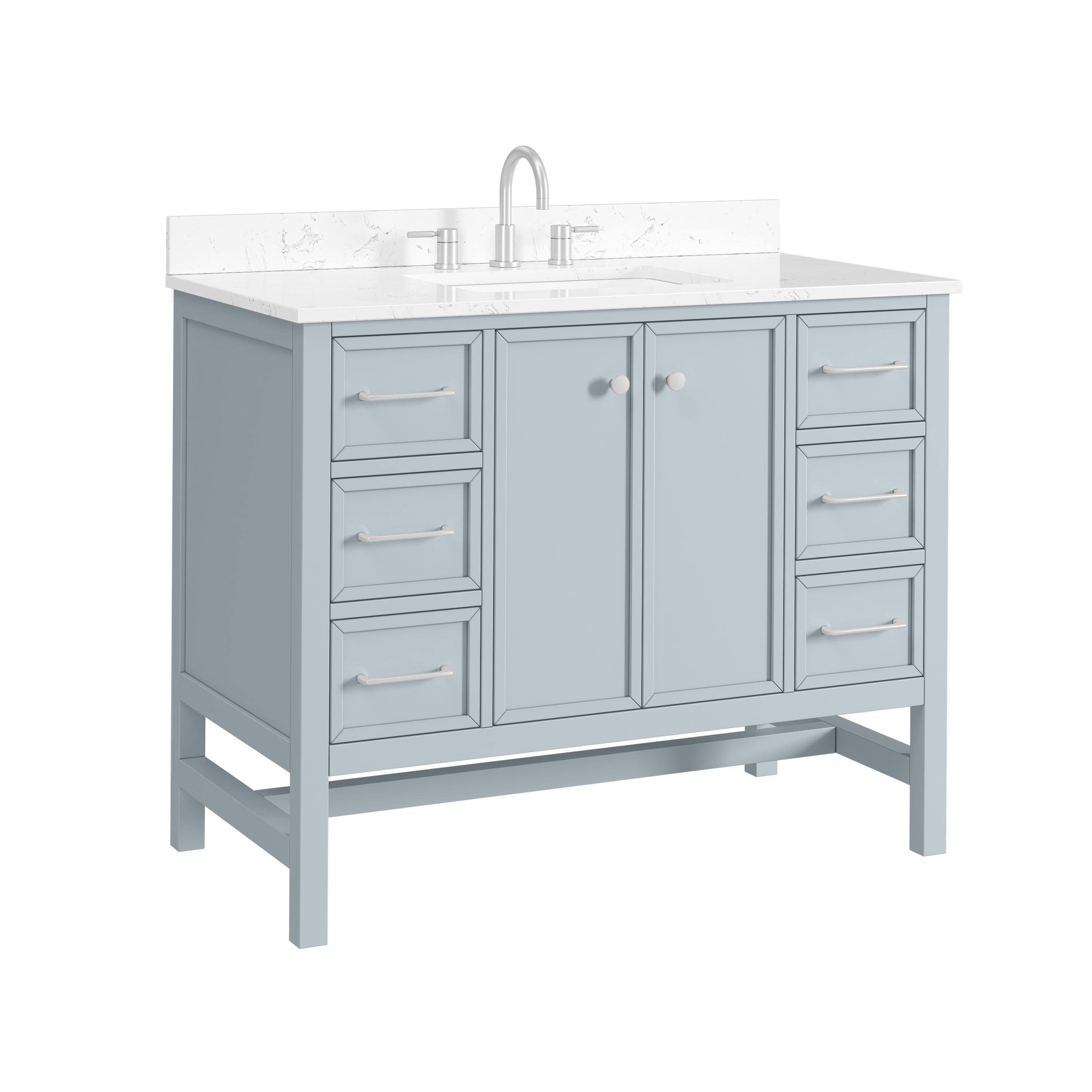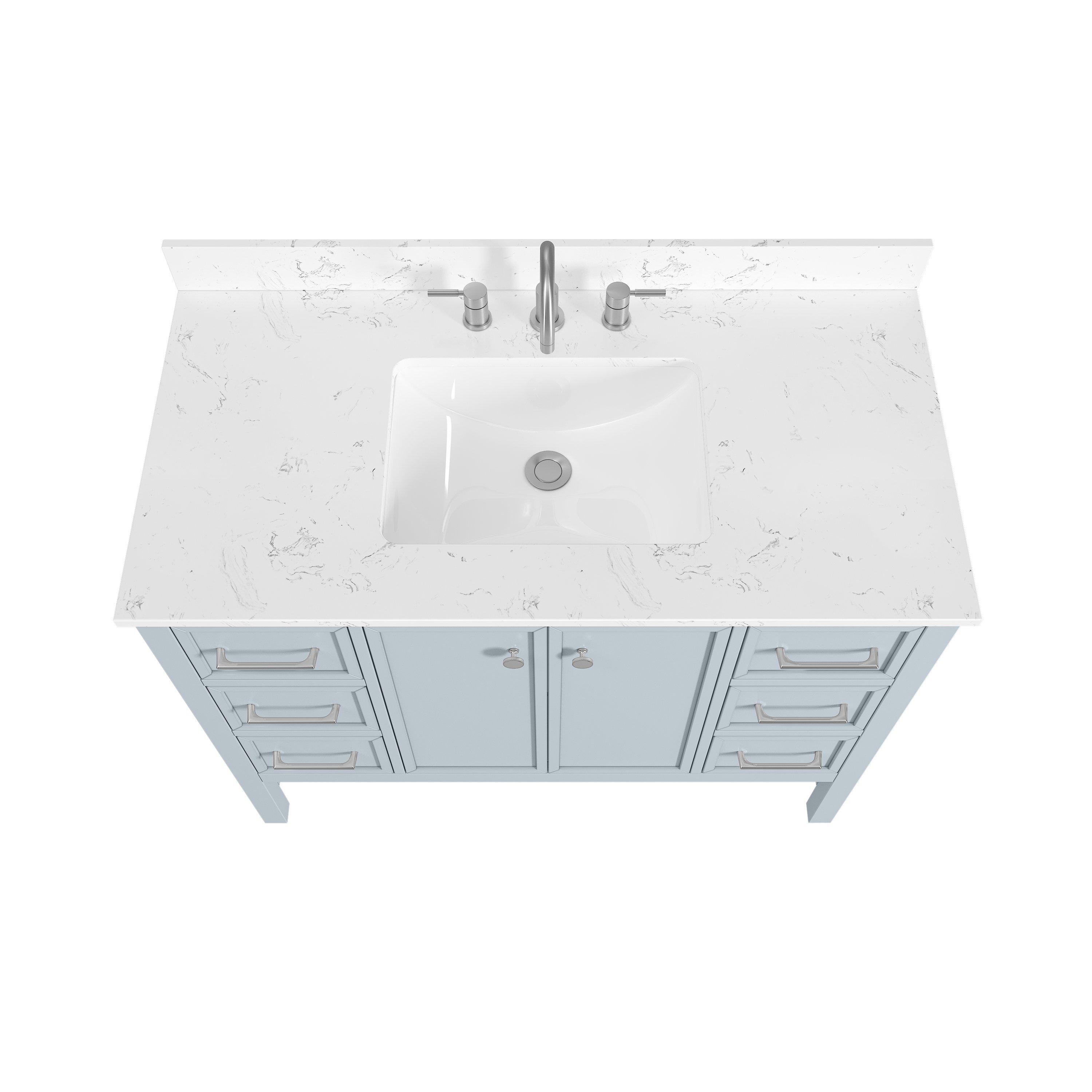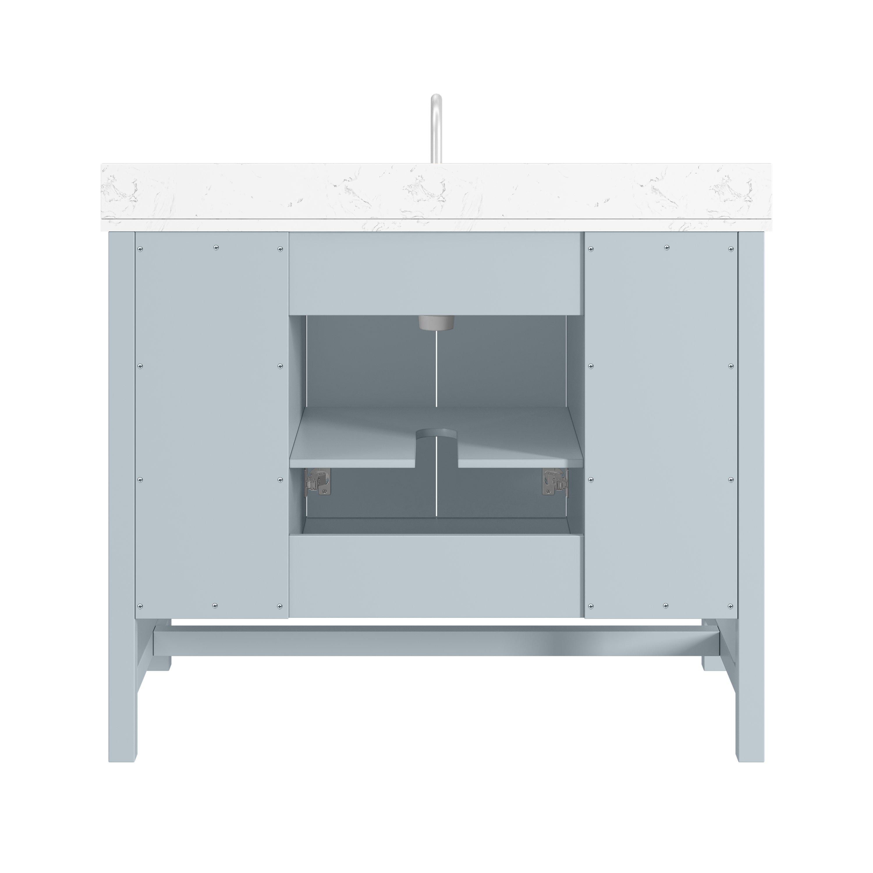 Complete your bathroom with the beautiful Piper 43 in. Blue Vanity with Engineered Stone Top. This freestanding features durable solid wood, mdf cabinets in stunning blue with a white engineered stone vanity top and polished chrome hardware. A charming single undermount sink in brilliant white is included. The Piper 43 in. Blue Vanity with Engineered Stone Top is a versatile choice to customize multiple bathroom settings.
