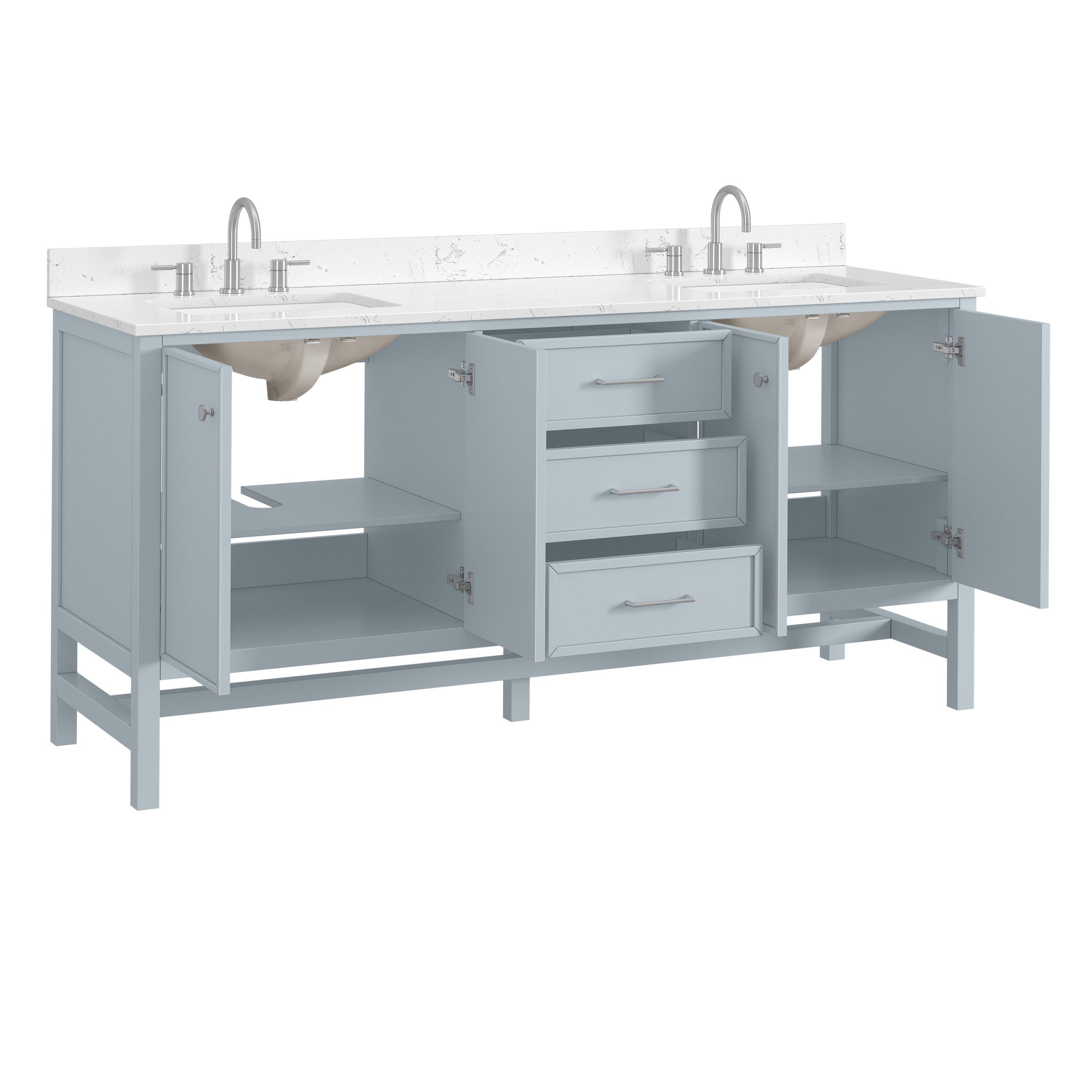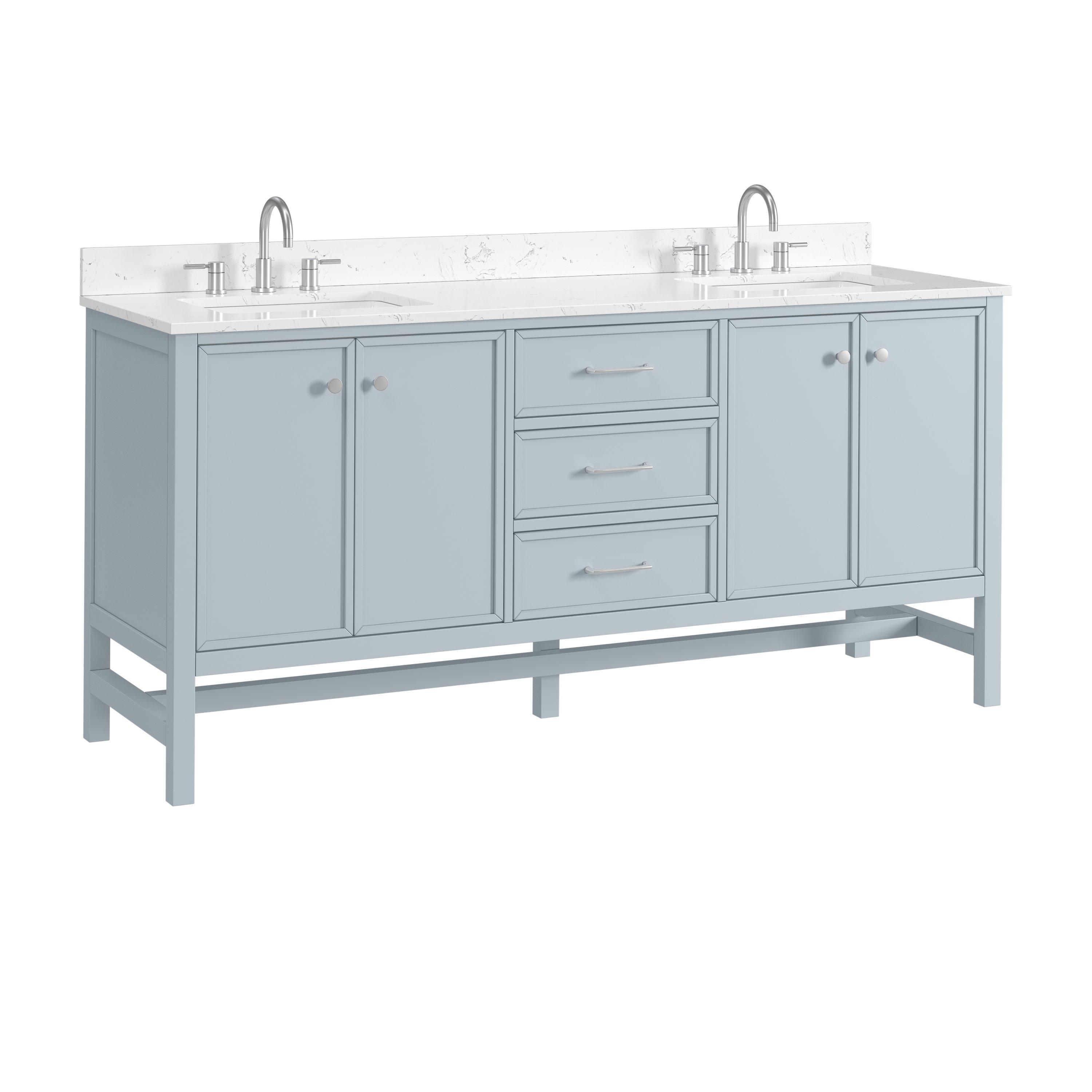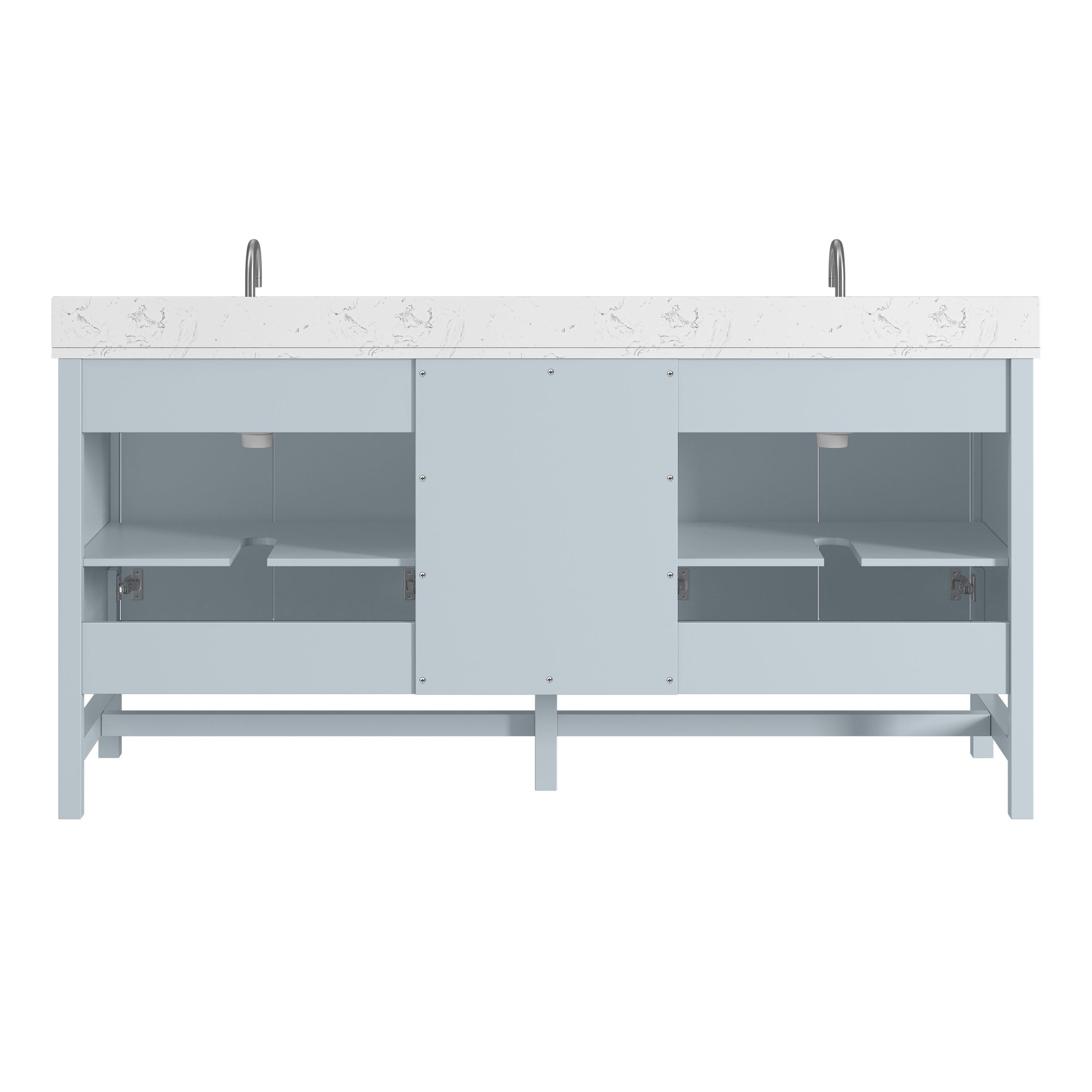 Tailor the look of your bathroom with the Piper 73 in. Blue Vanity with Engineered Stone Top featuring gorgeous solid wood, mdf in blue with 4 doors, 3 drawers, and 2 shelves. This piece is completed with beautiful polished chrome hardware and a double undermount white sink. The Piper 73 in. Blue Vanity with Engineered Stone Top is a stunning addition to any bathroom setting.