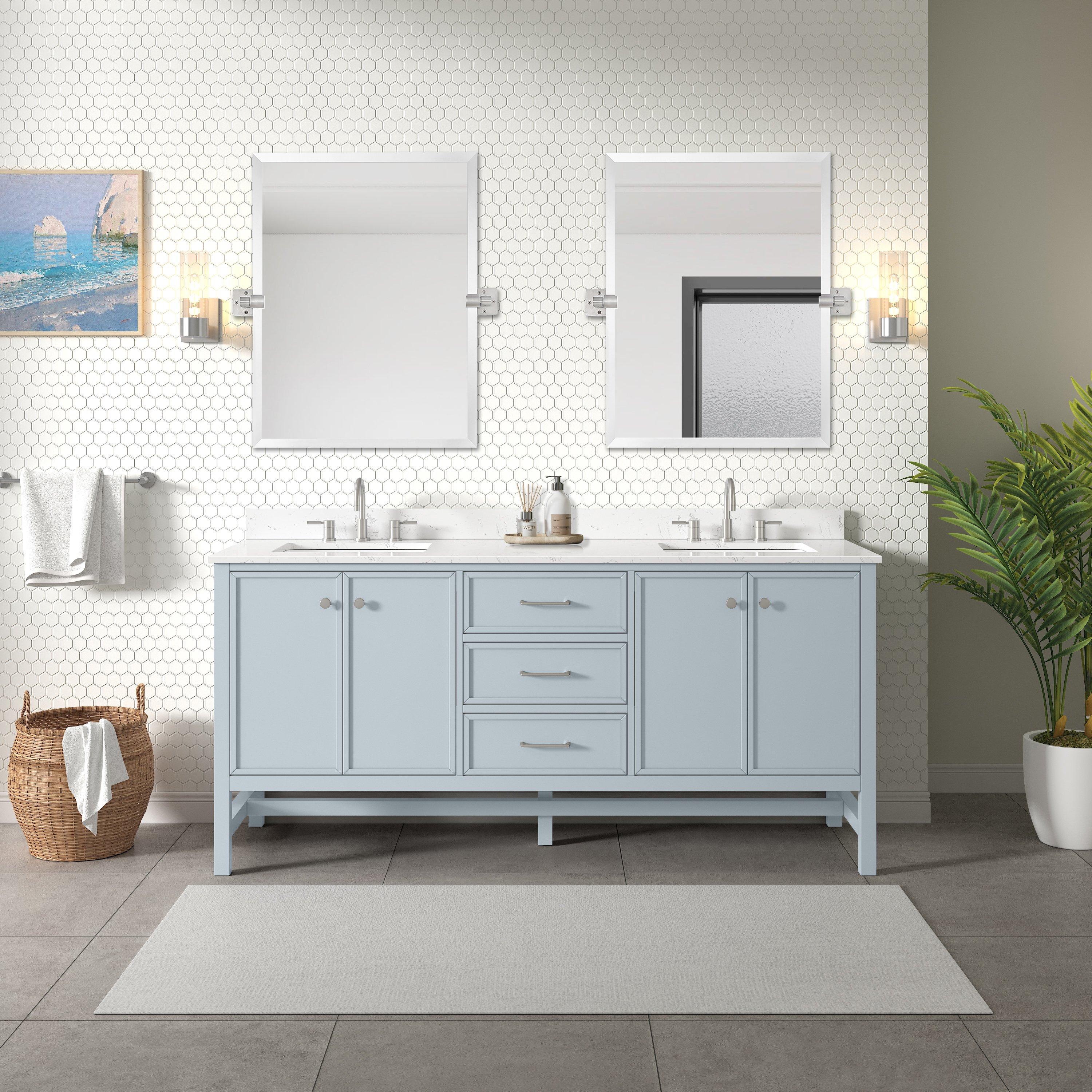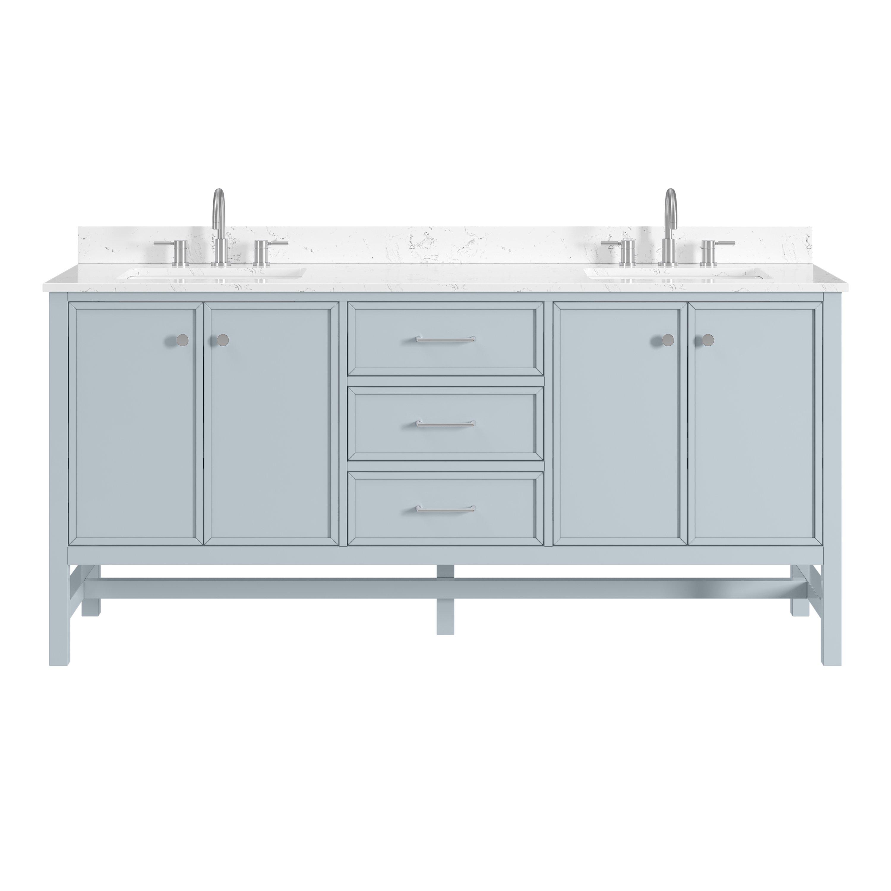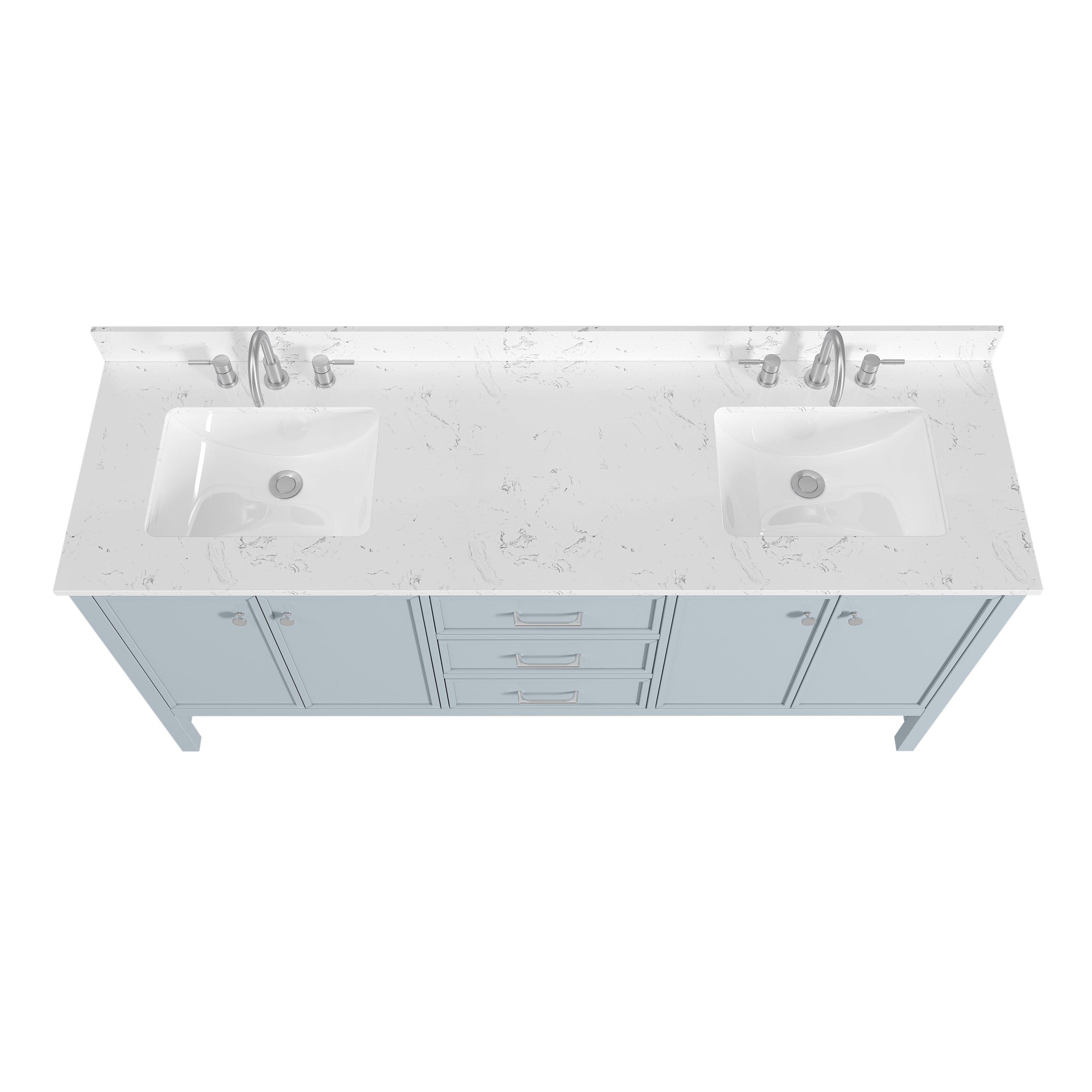 Tailor the look of your bathroom with the Piper 73 in. Blue Vanity with Engineered Stone Top featuring gorgeous solid wood, mdf in blue with 4 doors, 3 drawers, and 2 shelves. This piece is completed with beautiful polished chrome hardware and a double undermount white sink. The Piper 73 in. Blue Vanity with Engineered Stone Top is a stunning addition to any bathroom setting.