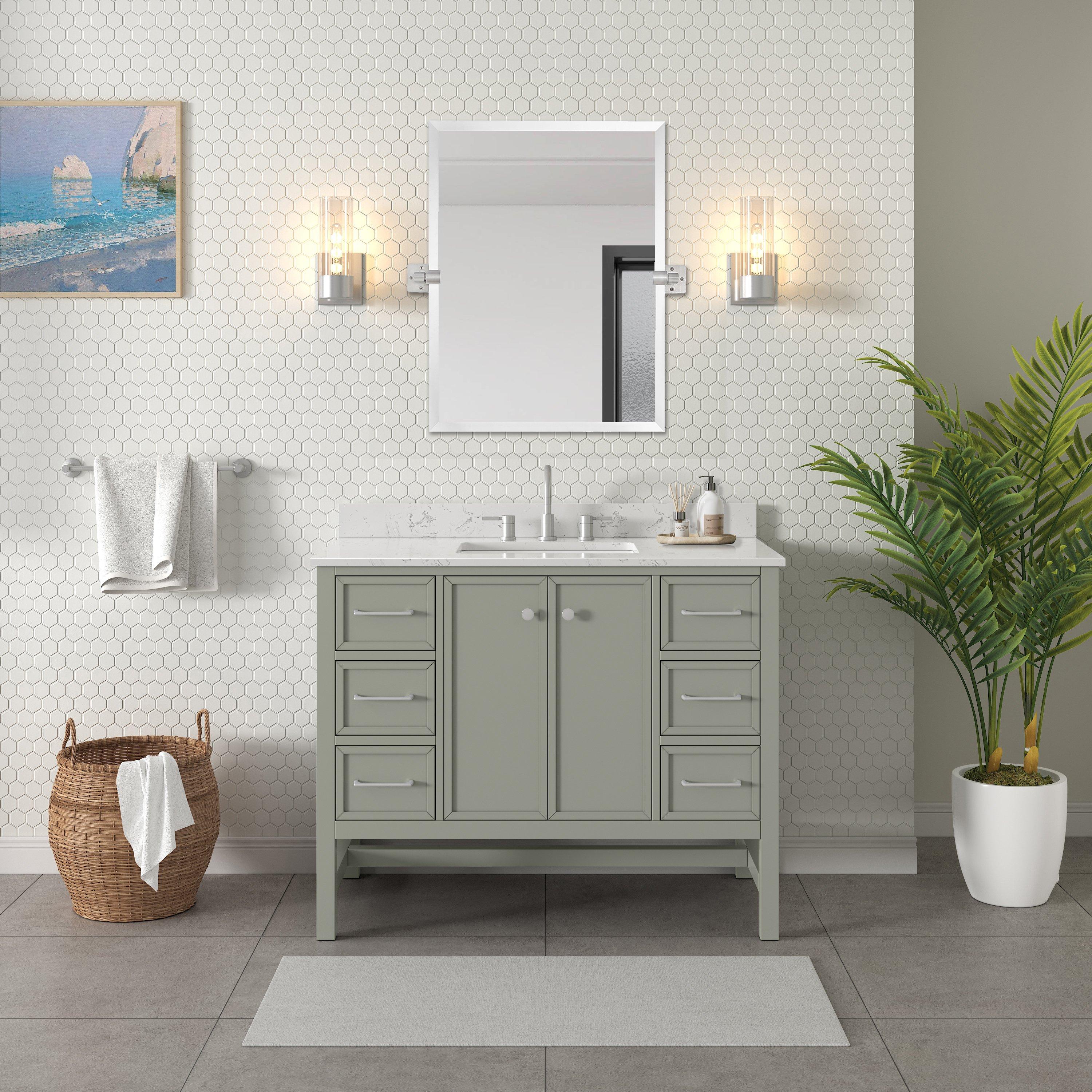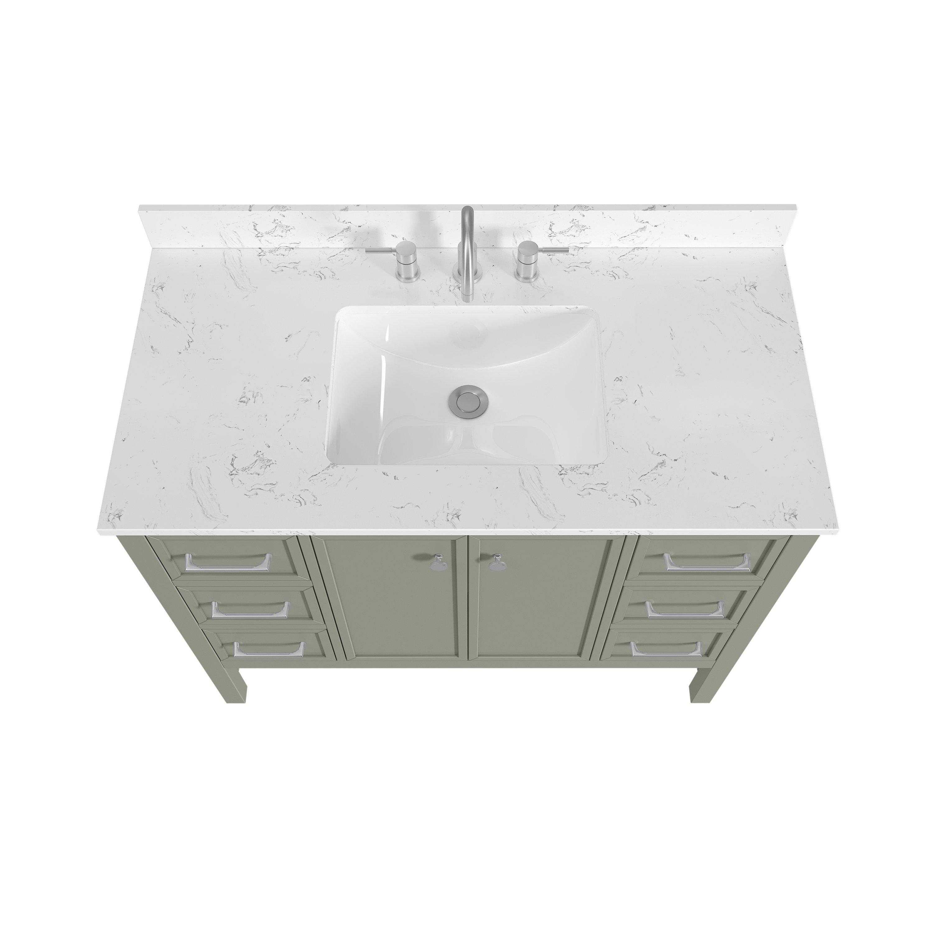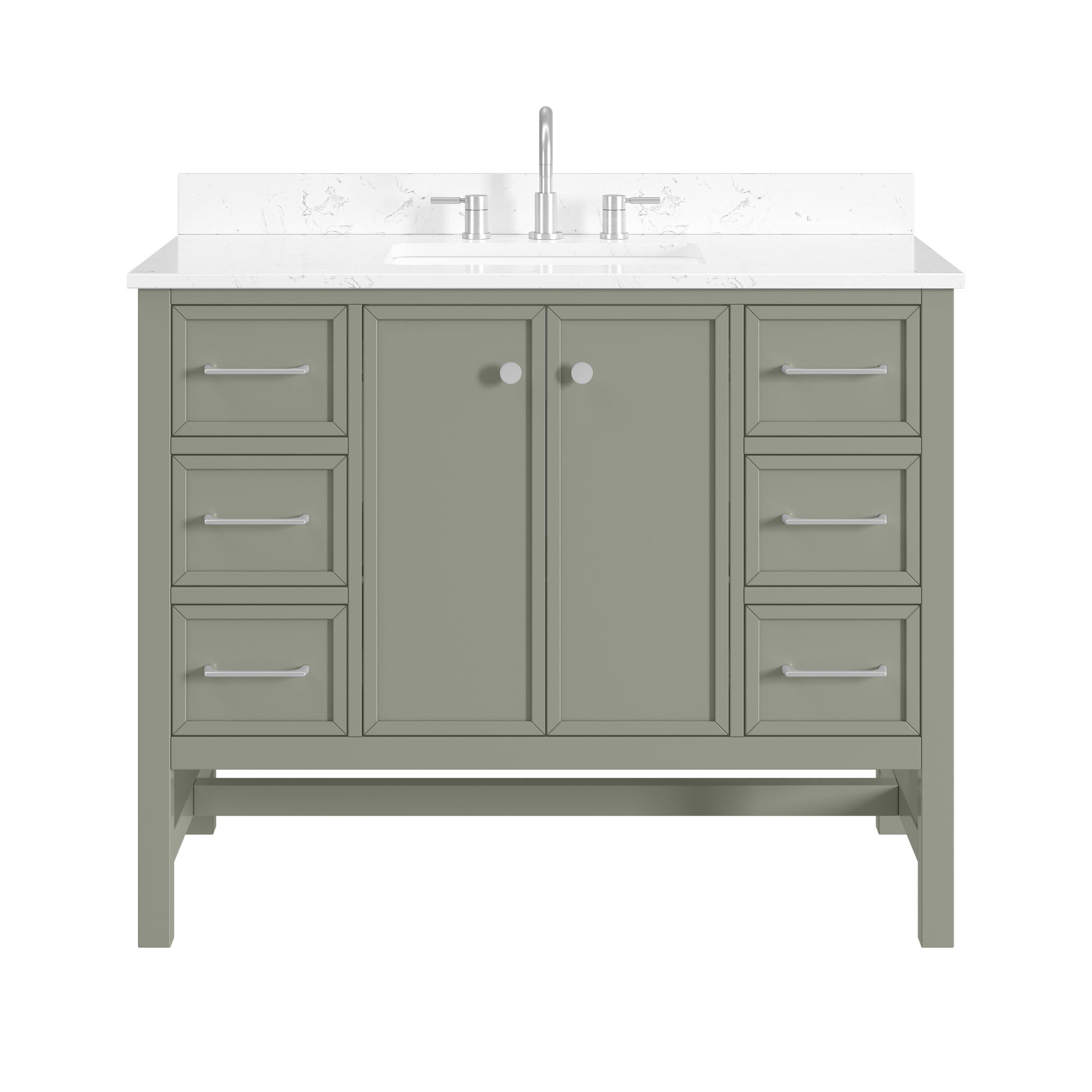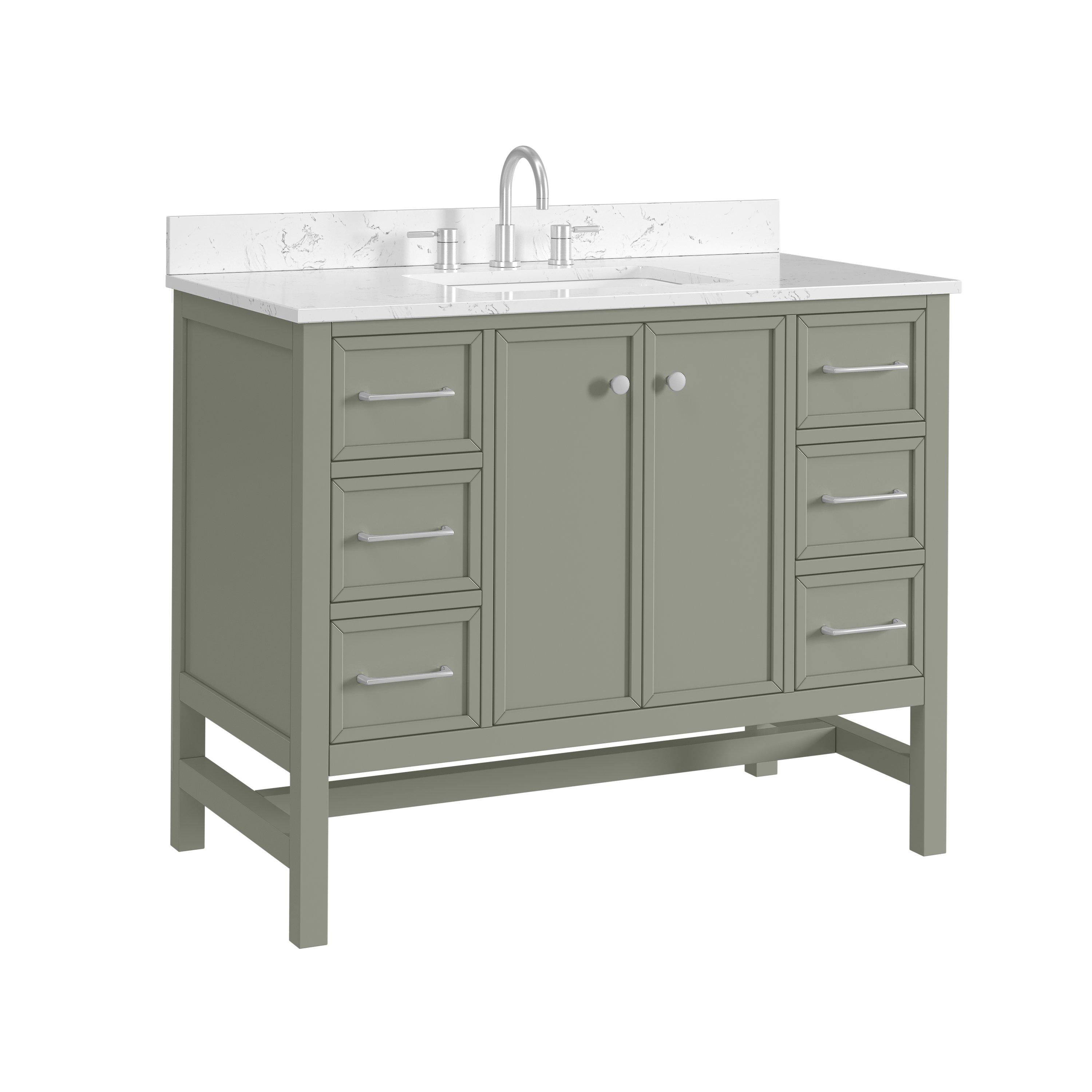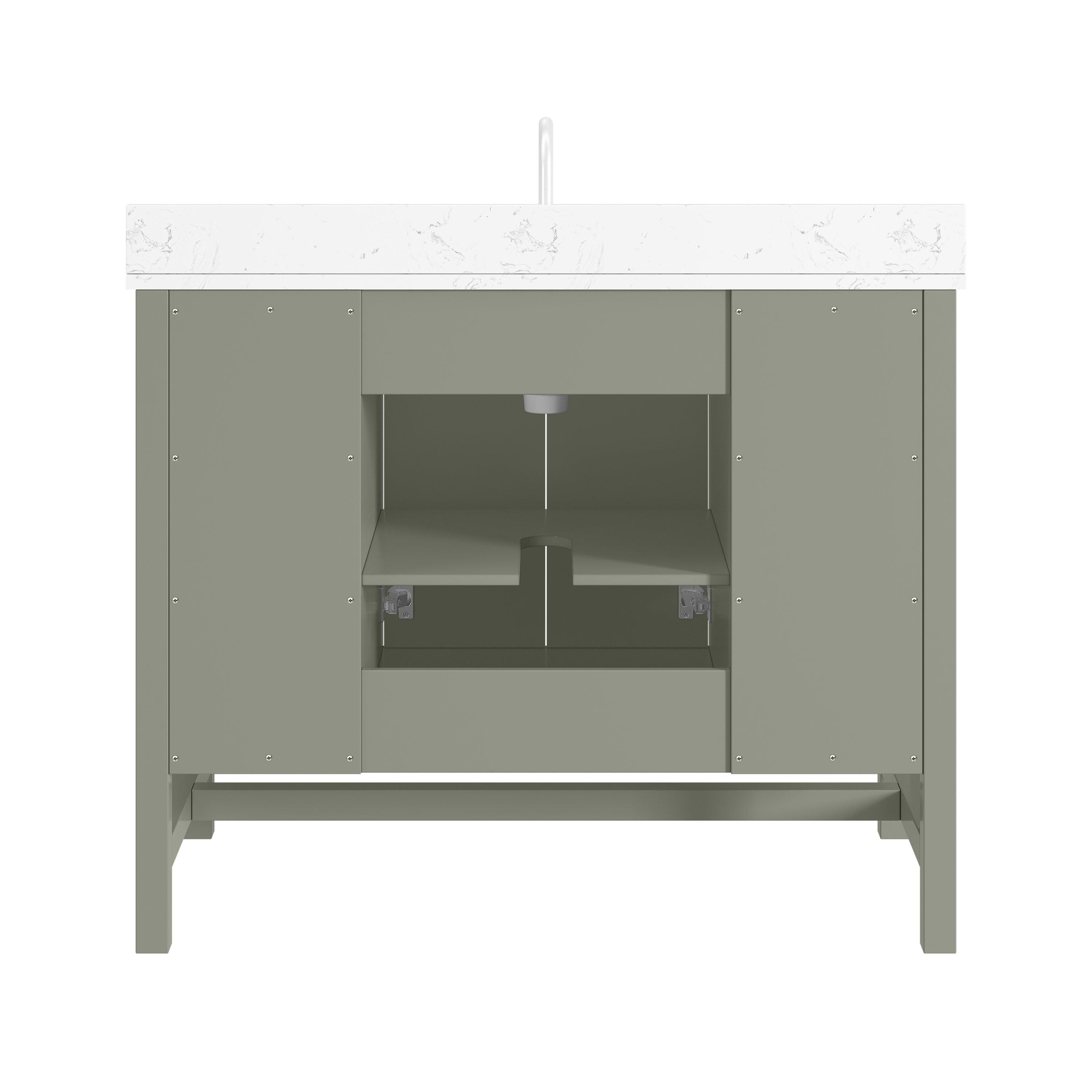 Tailor the look of your bathroom with the Piper 43 in. Green Vanity with Engineered Stone Top featuring gorgeous solid wood, mdf in green with 2 doors, 6 drawers, and 1 shelves. This piece is completed with beautiful brushed nickel hardware and a single undermount white sink. The Piper 43 in. Green Vanity with Engineered Stone Top is a stunning addition to any bathroom setting.