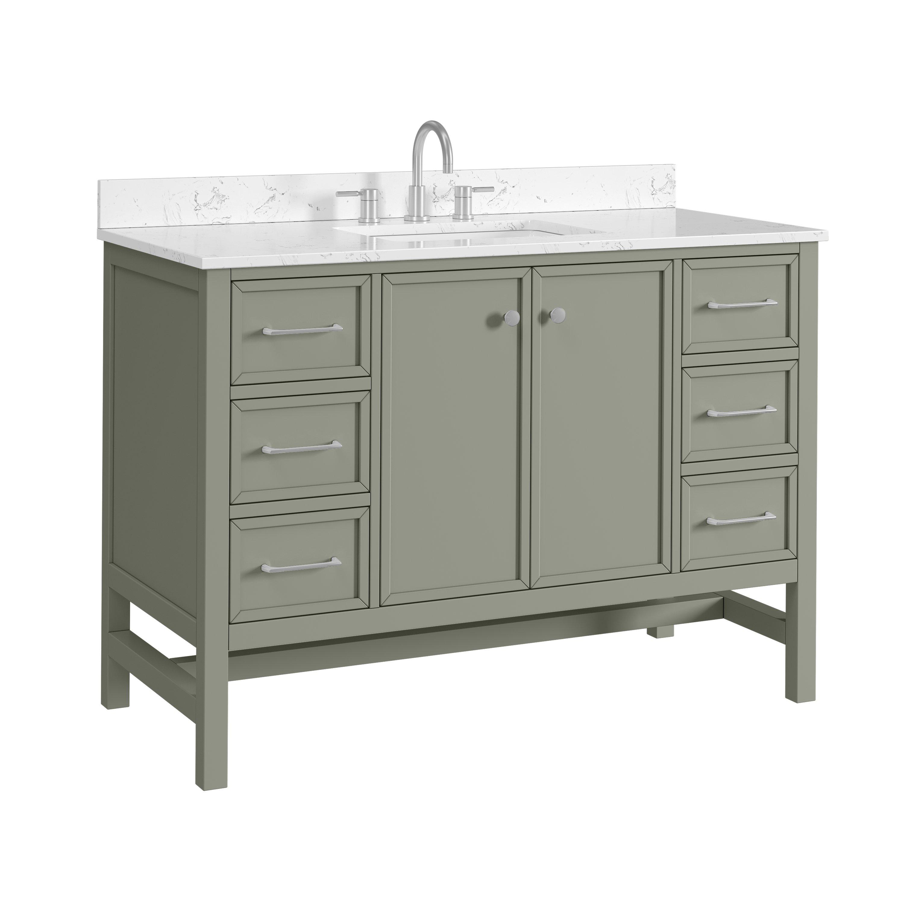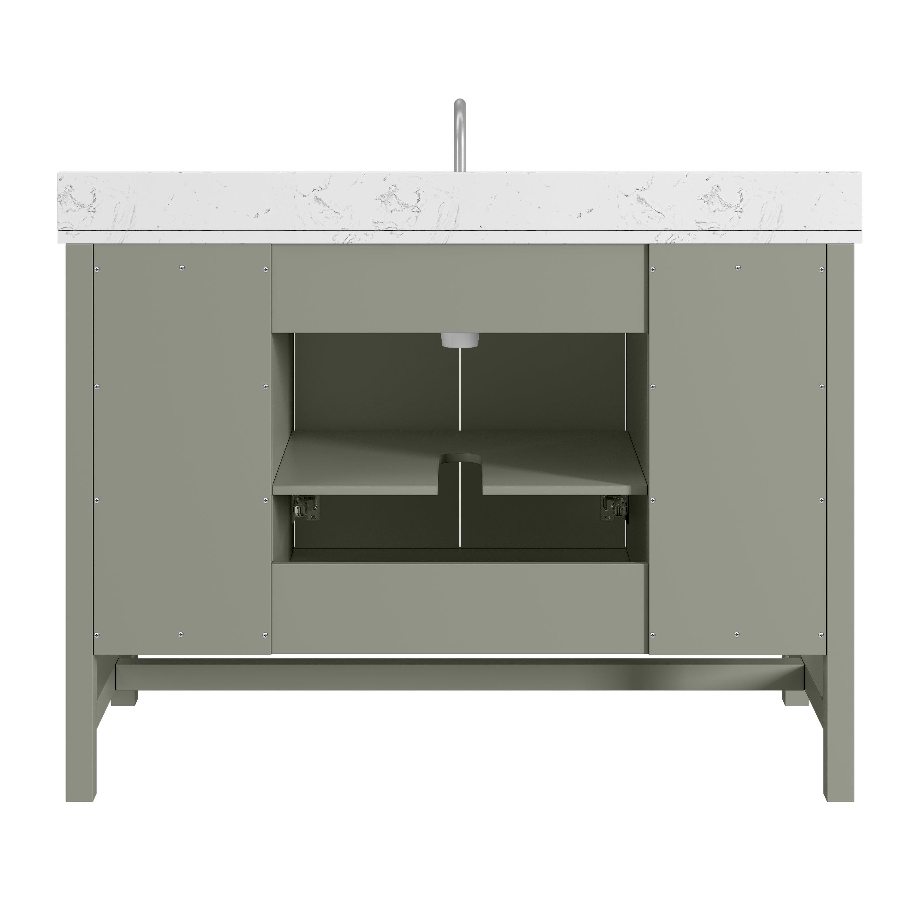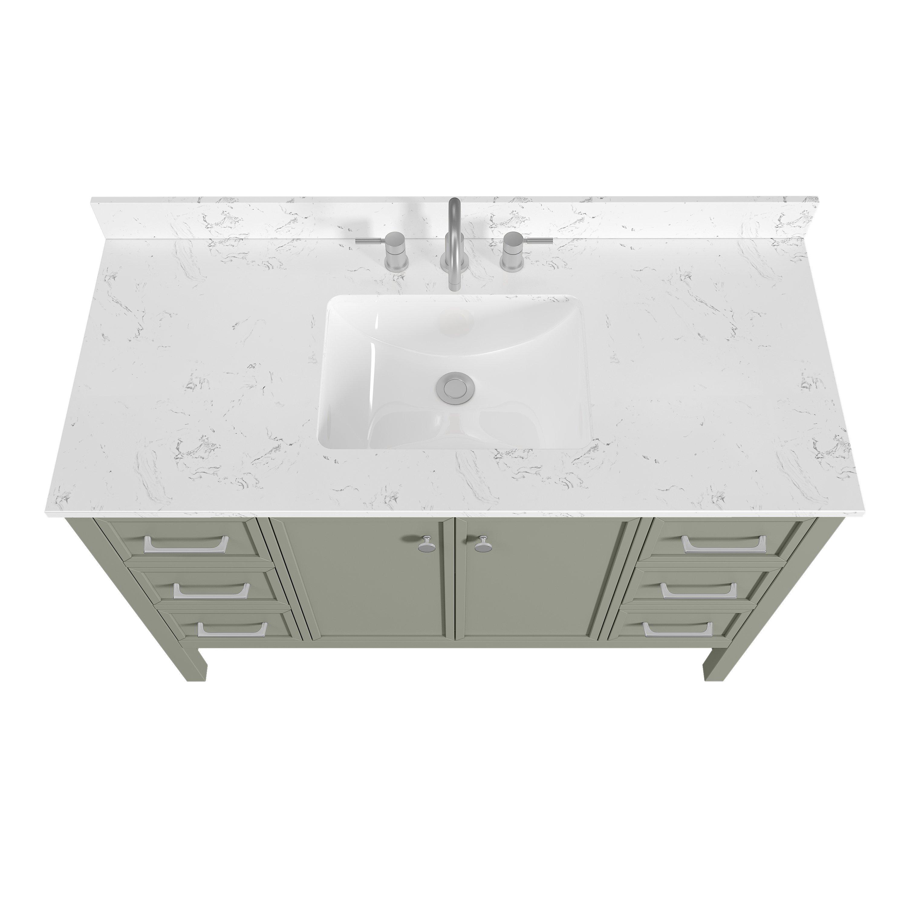 Complete your bathroom with the beautiful Piper 49 in. Green Vanity with Engineered Stone Top. This freestanding features durable solid wood, mdf cabinets in stunning green with a white engineered stone vanity top and brushed nickel hardware. A charming single undermount sink in brilliant white is included. The Piper 49 in. Green Vanity with Engineered Stone Top is a versatile choice to customize multiple bathroom settings.