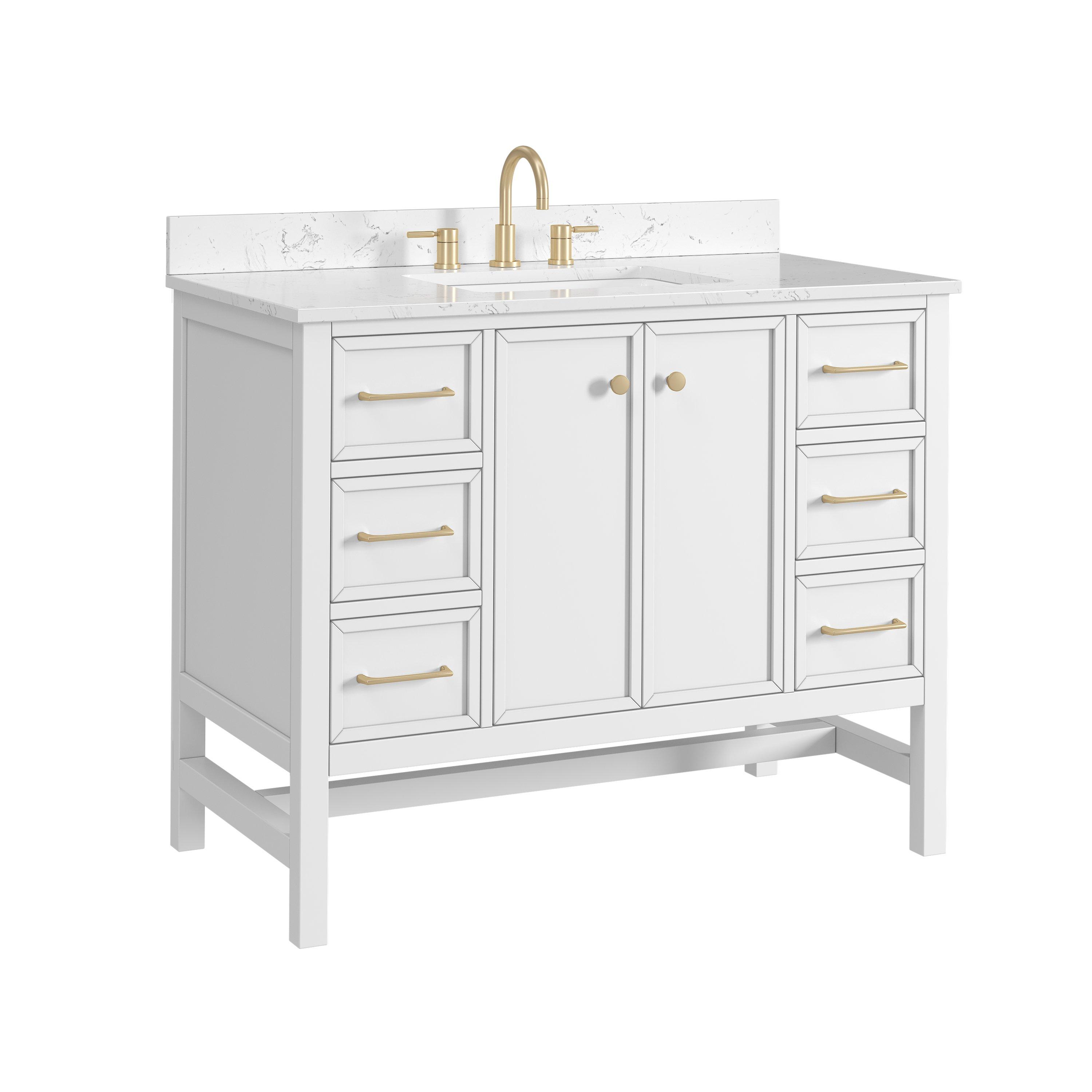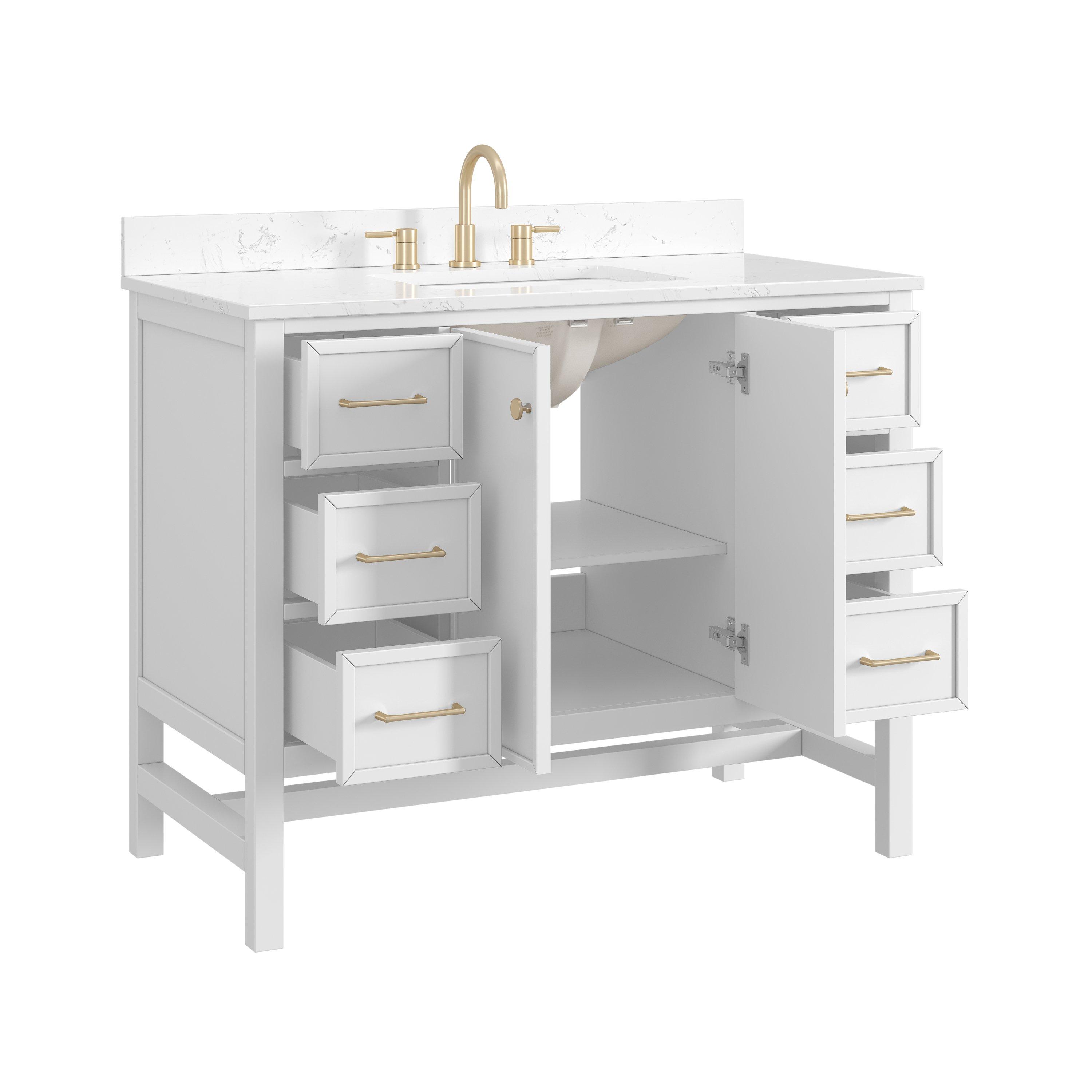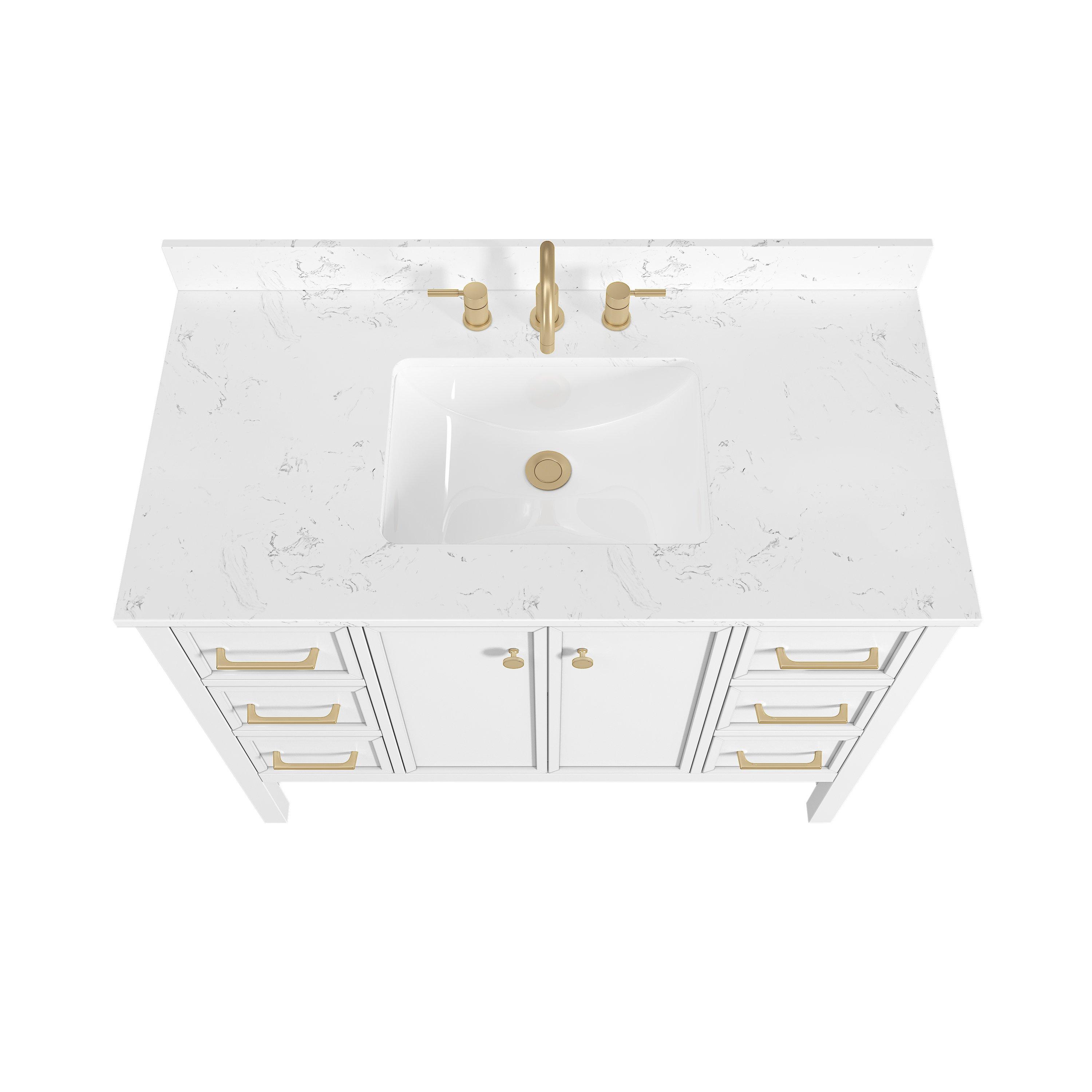 Tailor the look of your bathroom with the Piper 43 in. White Vanity with Engineered Stone Top featuring gorgeous solid wood, mdf in white with 2 doors, 6 drawers, and 1 shelves. This piece is completed with beautiful matte gold hardware and a single undermount white sink. The Piper 43 in. White Vanity with Engineered Stone Top is a stunning addition to any bathroom setting.