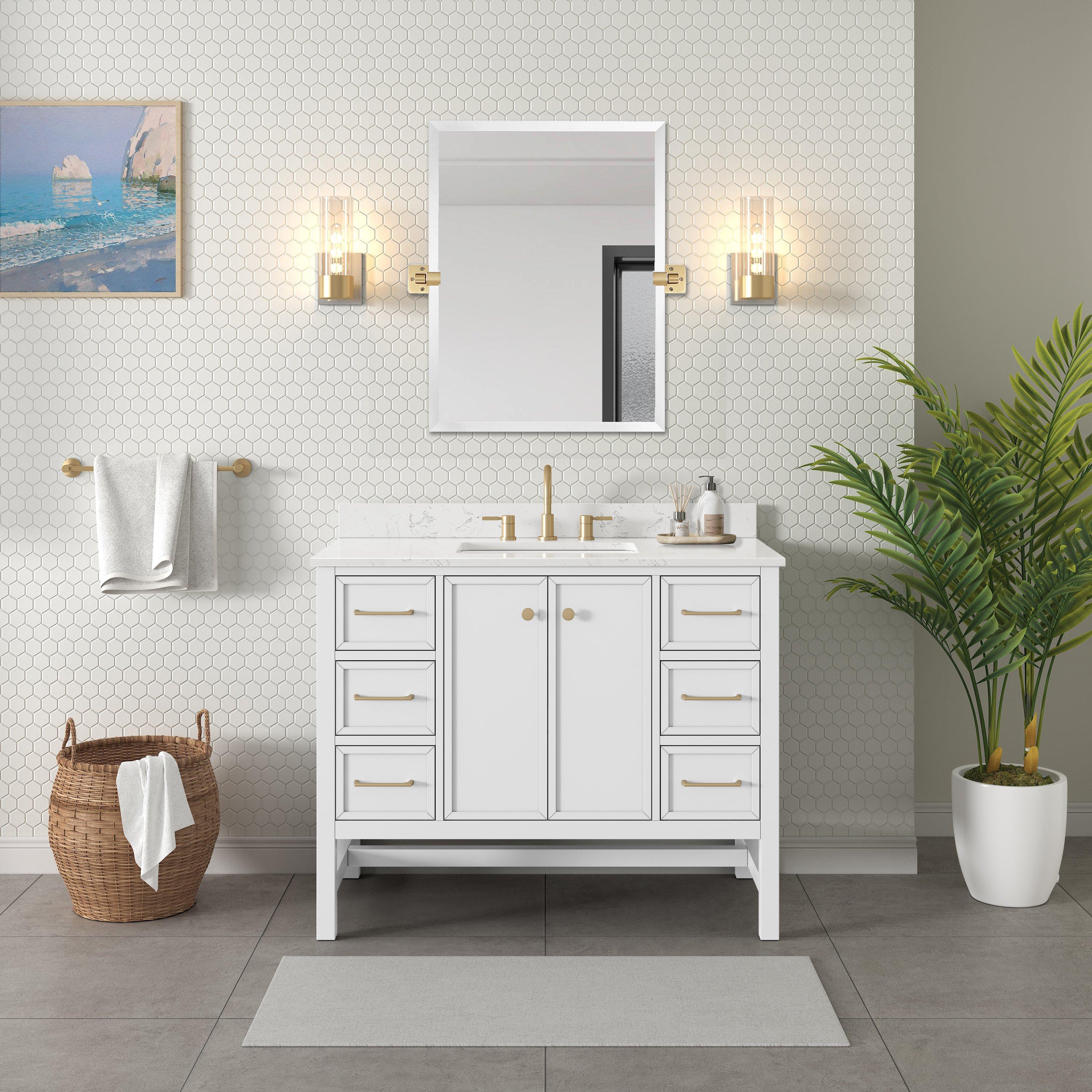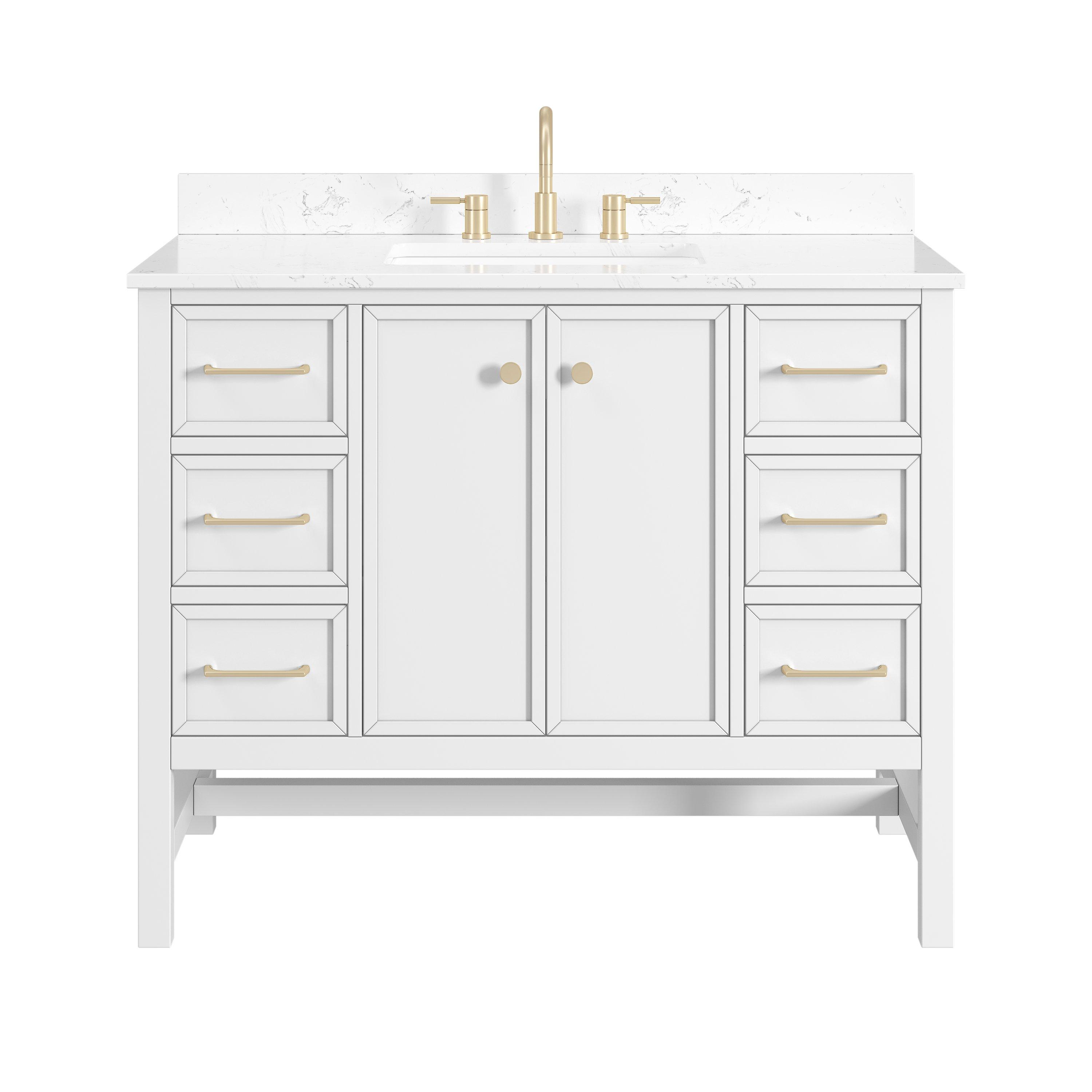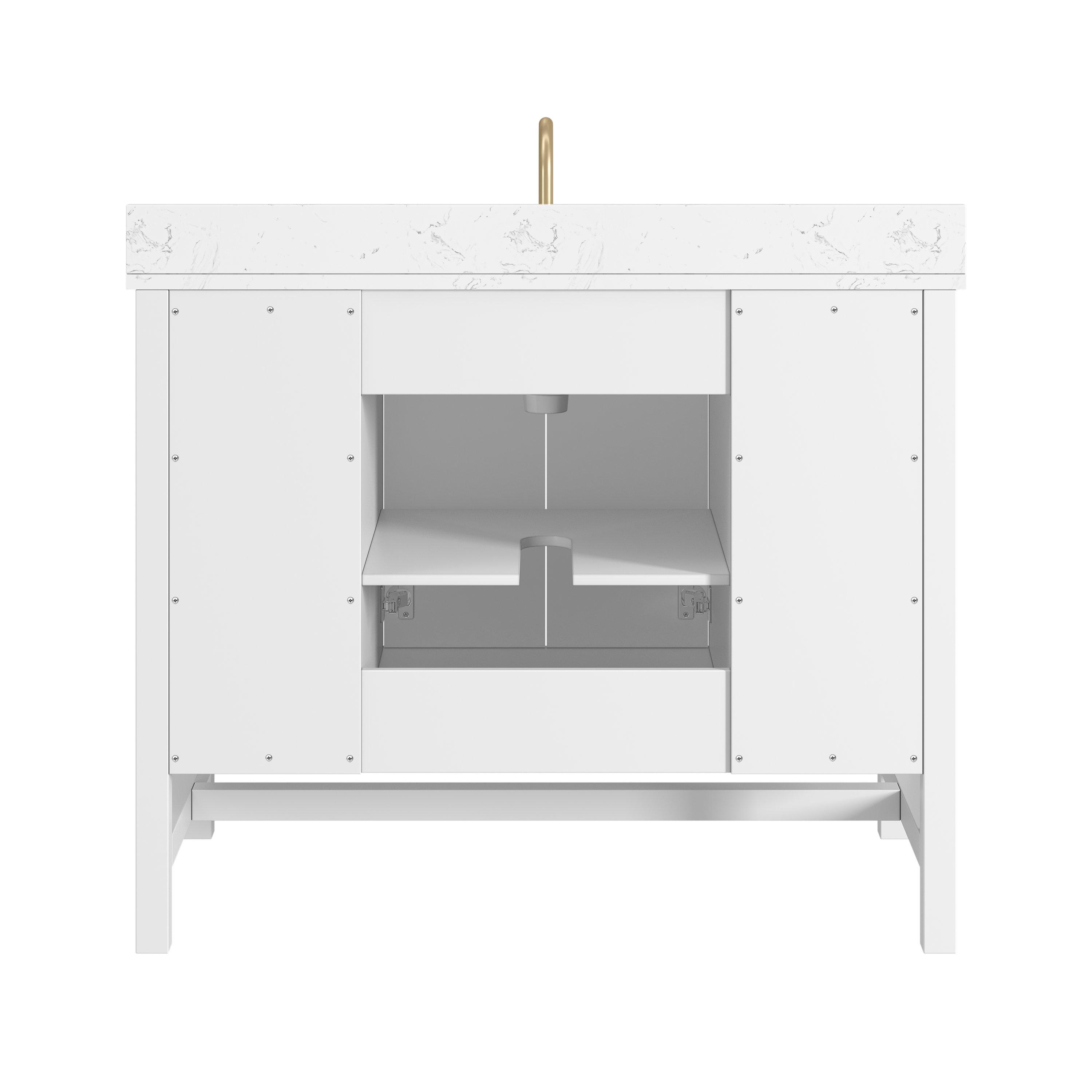 Tailor the look of your bathroom with the Piper 43 in. White Vanity with Engineered Stone Top featuring gorgeous solid wood, mdf in white with 2 doors, 6 drawers, and 1 shelves. This piece is completed with beautiful matte gold hardware and a single undermount white sink. The Piper 43 in. White Vanity with Engineered Stone Top is a stunning addition to any bathroom setting.