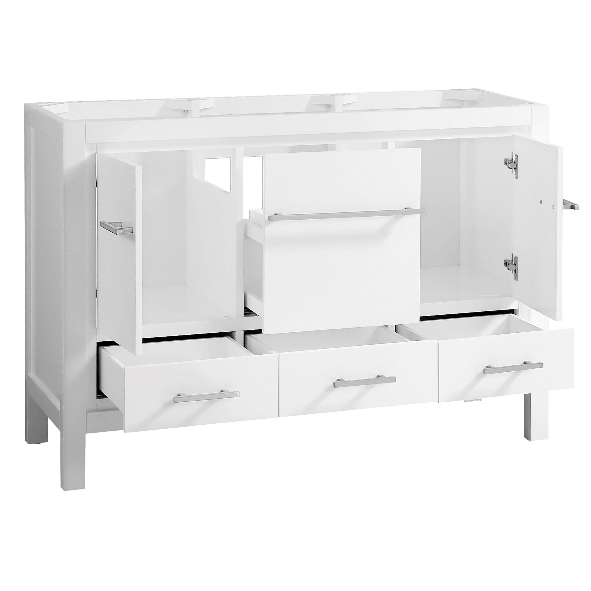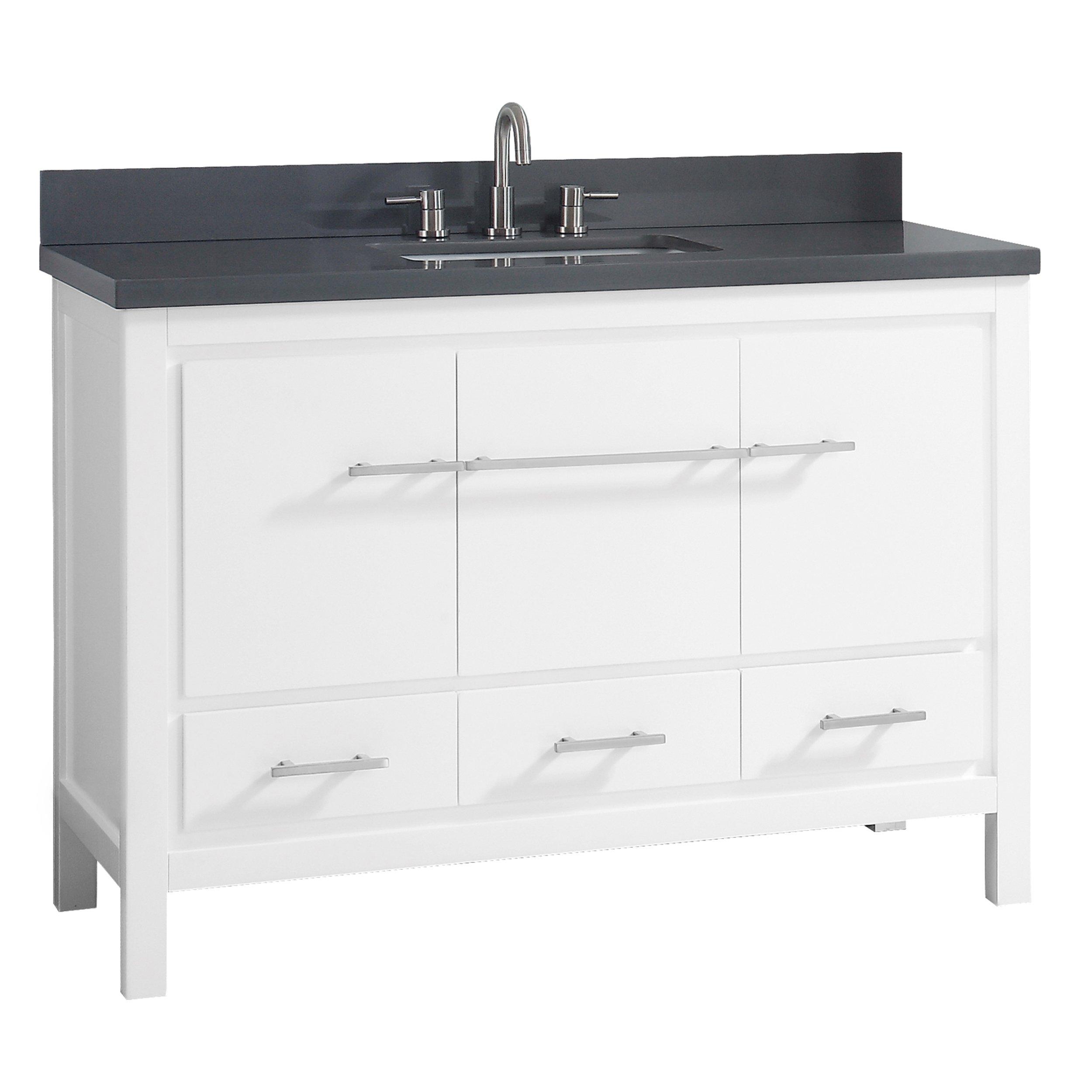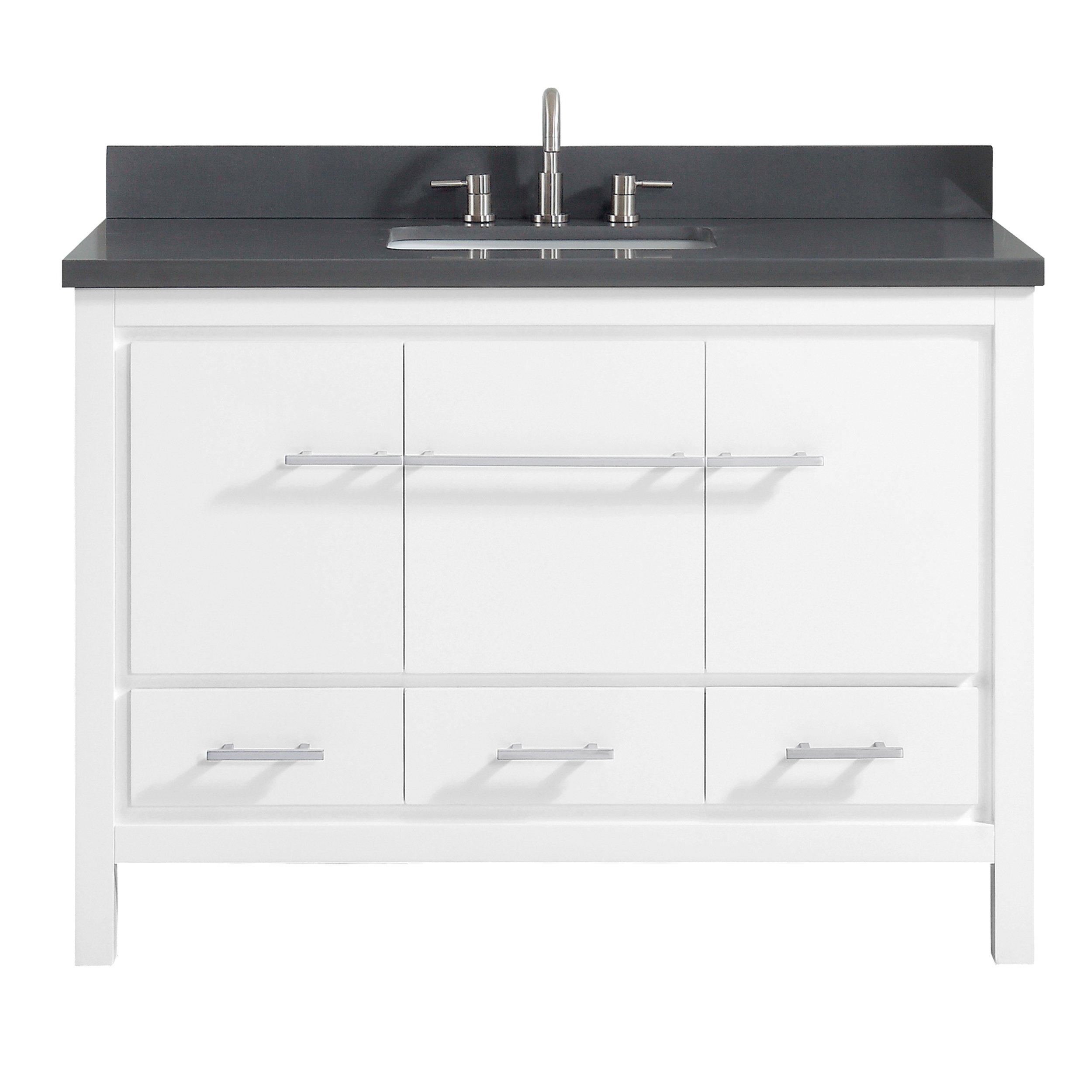 1 Year LimitedComplete your bathroom with the beautiful Ryder 49 in. White Single Vanity with Dark Gray Quartz Top. This freestanding features durable solid wood cabinets in stunning white with a gray quartz vanity top and brushed nickel hardware. A charming single undermount sink in brilliant white is included. The Ryder 49 in. White Single Vanity with Dark Gray Quartz Top is a versatile choice to customize multiple bathroom settings.