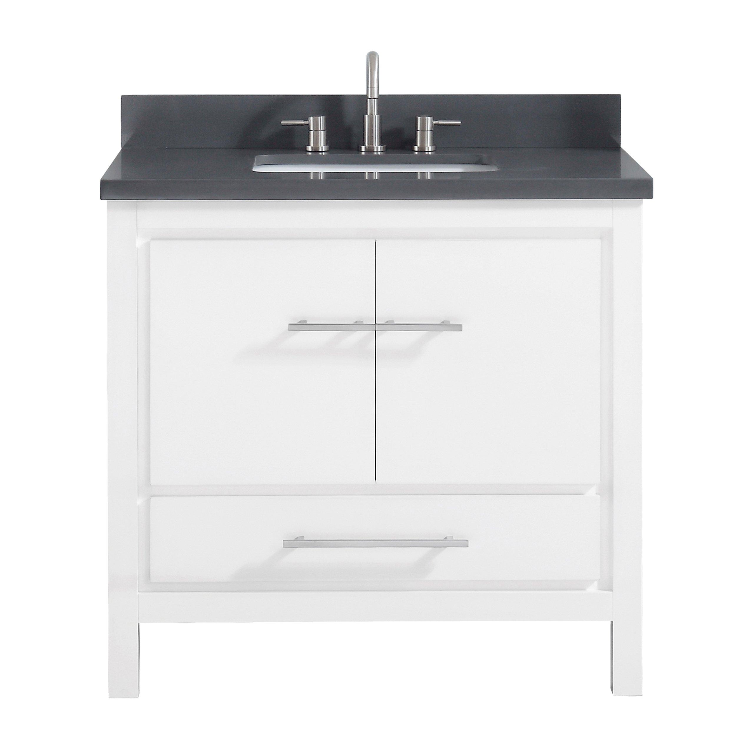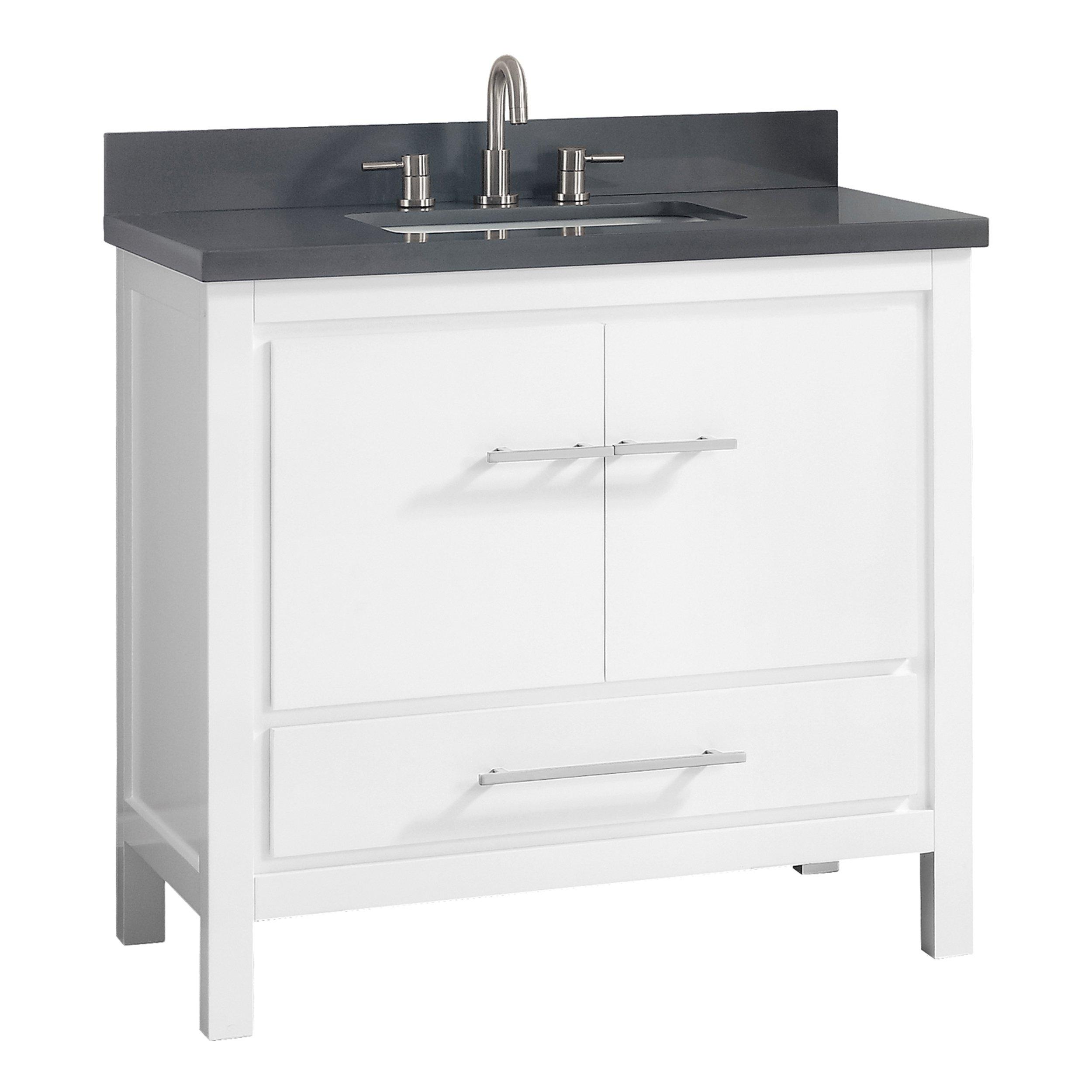 Complete your bathroom with the beautiful Ryder 37 in. White Single Vanity with Dark Gray Quartz Top. This freestanding features durable solid wood cabinets in stunning white with a gray quartz vanity top and brushed nickel hardware. A charming single undermount sink in brilliant white is included. The Ryder 37 in. White Single Vanity with Dark Gray Quartz Top is a versatile choice to customize multiple bathroom settings.