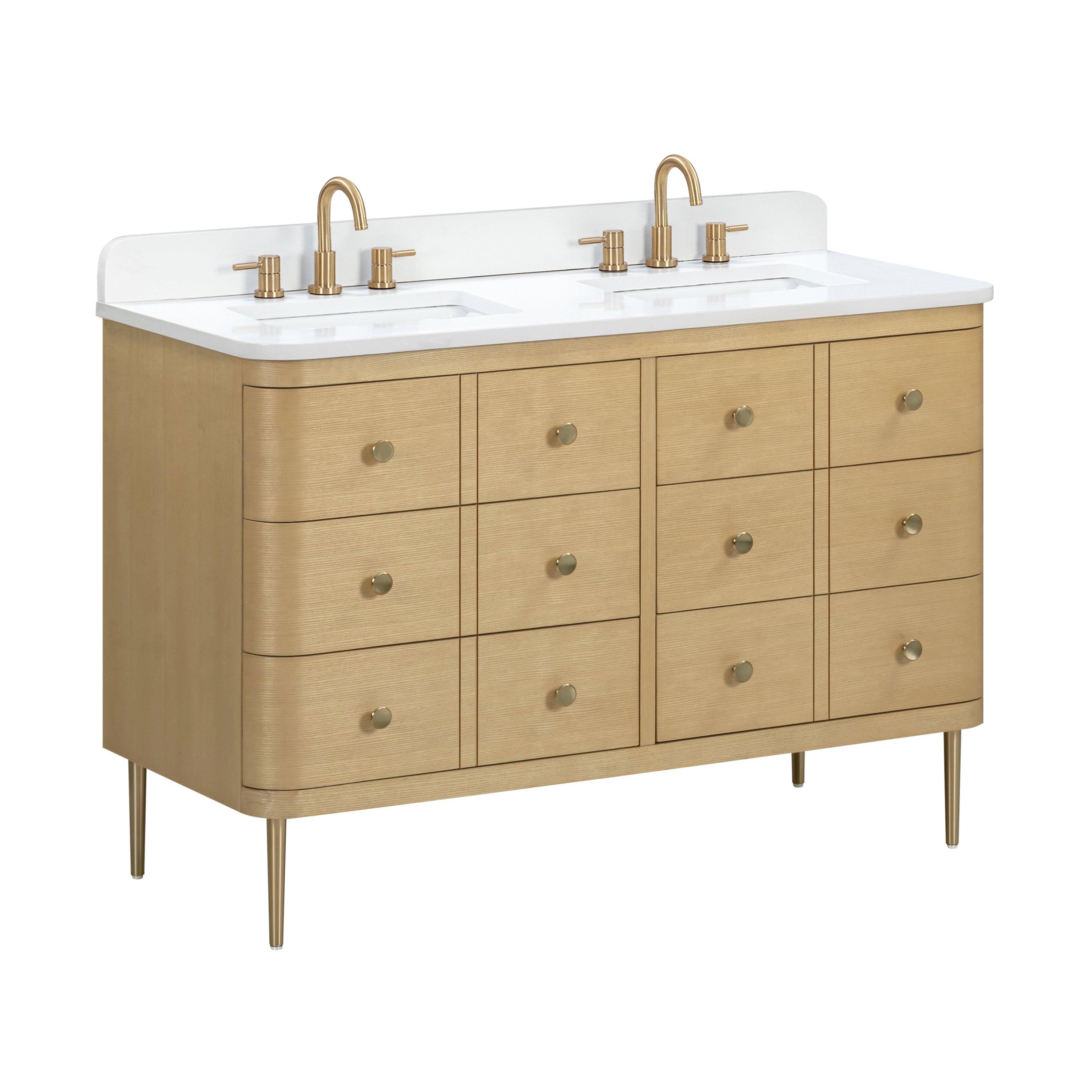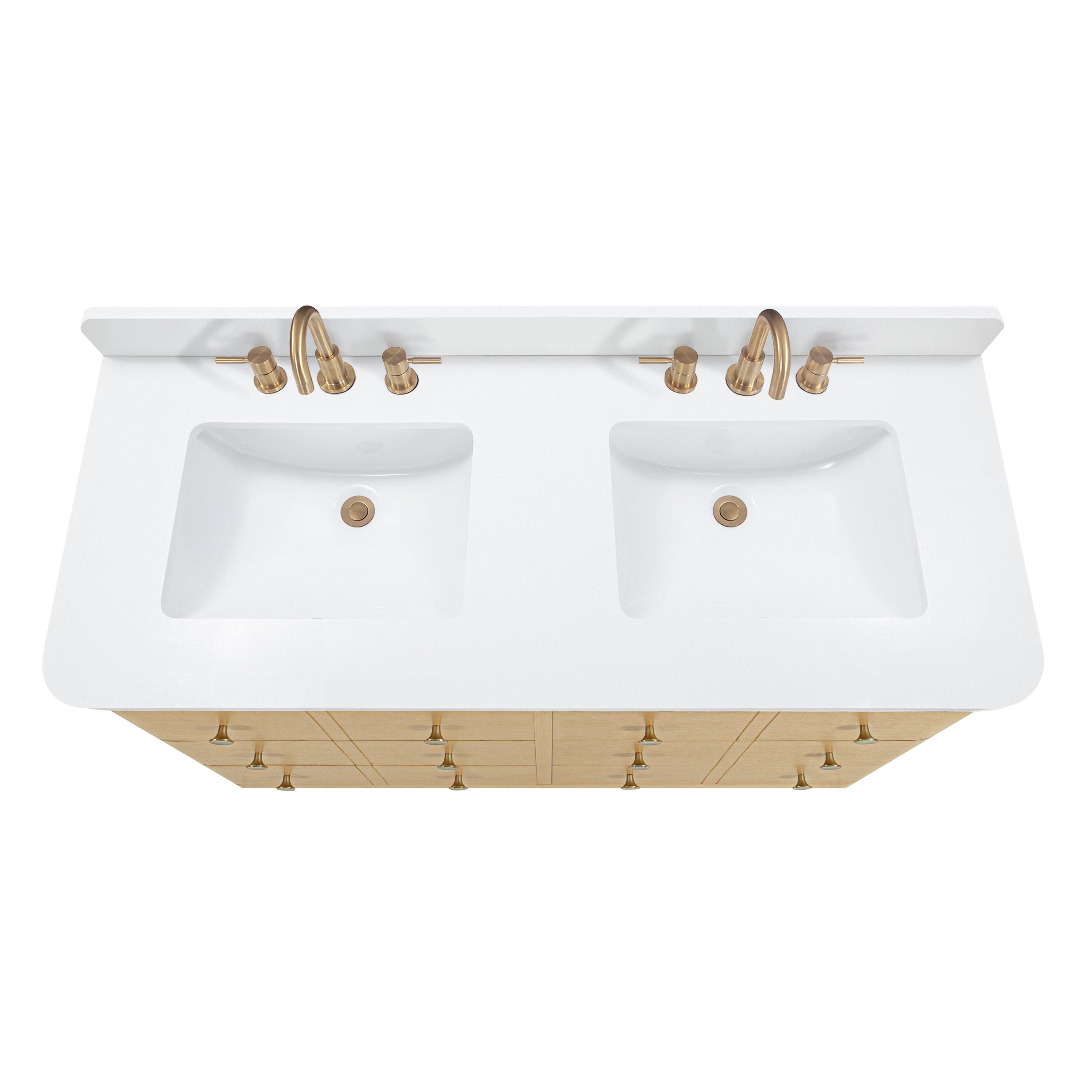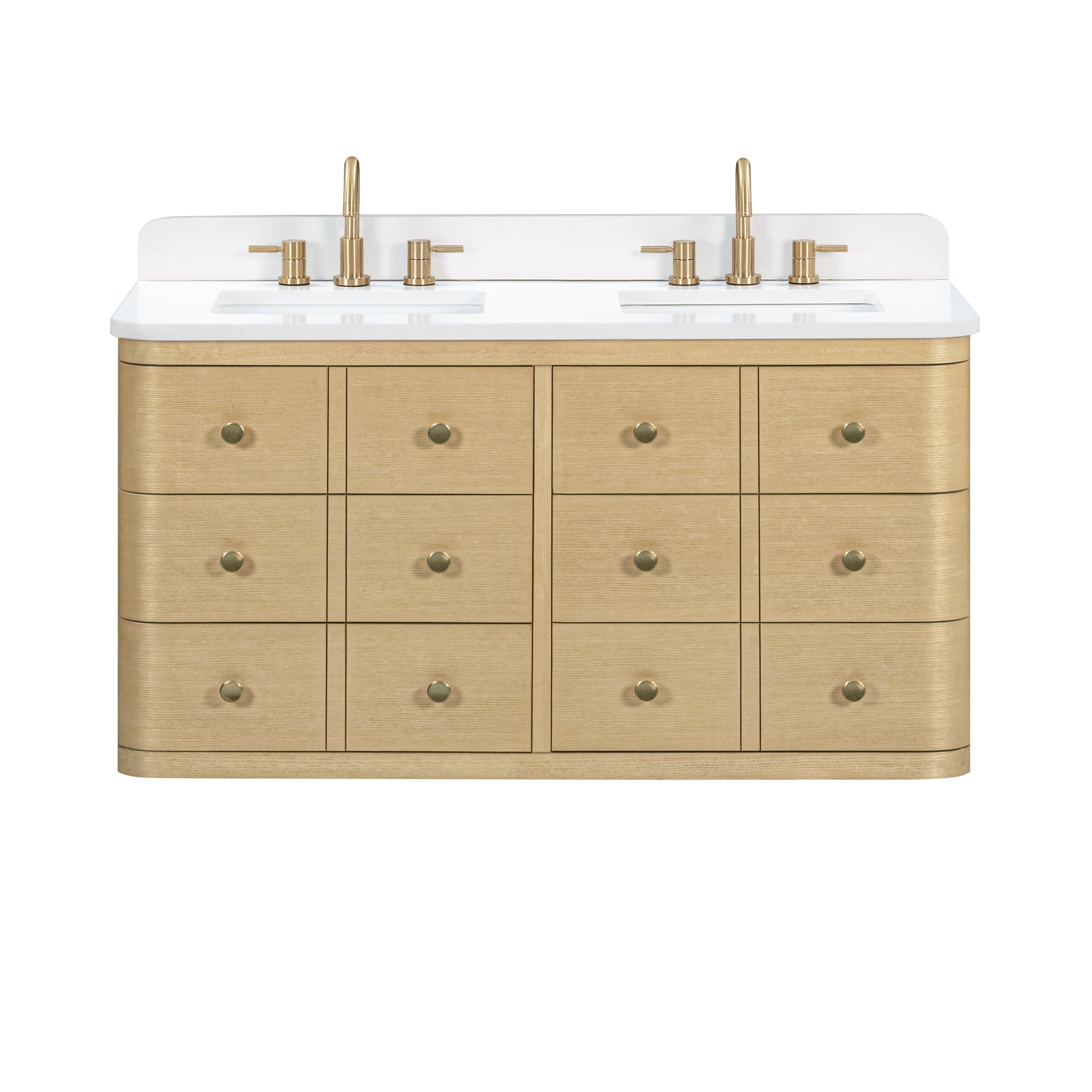 Complete your bathroom with the beautiful Sadie 49 in. White Vanity with Enginereed Stone Top. This wall mounted or freestanding features durable solid wood, mdf cabinets in stunning natural with a white engineered stone vanity top and matte gold hardware. A charming double undermount sink in brilliant white is included. The Sadie 49 in. White Vanity with Enginereed Stone Top is a versatile choice to customize multiple bathroom settings.