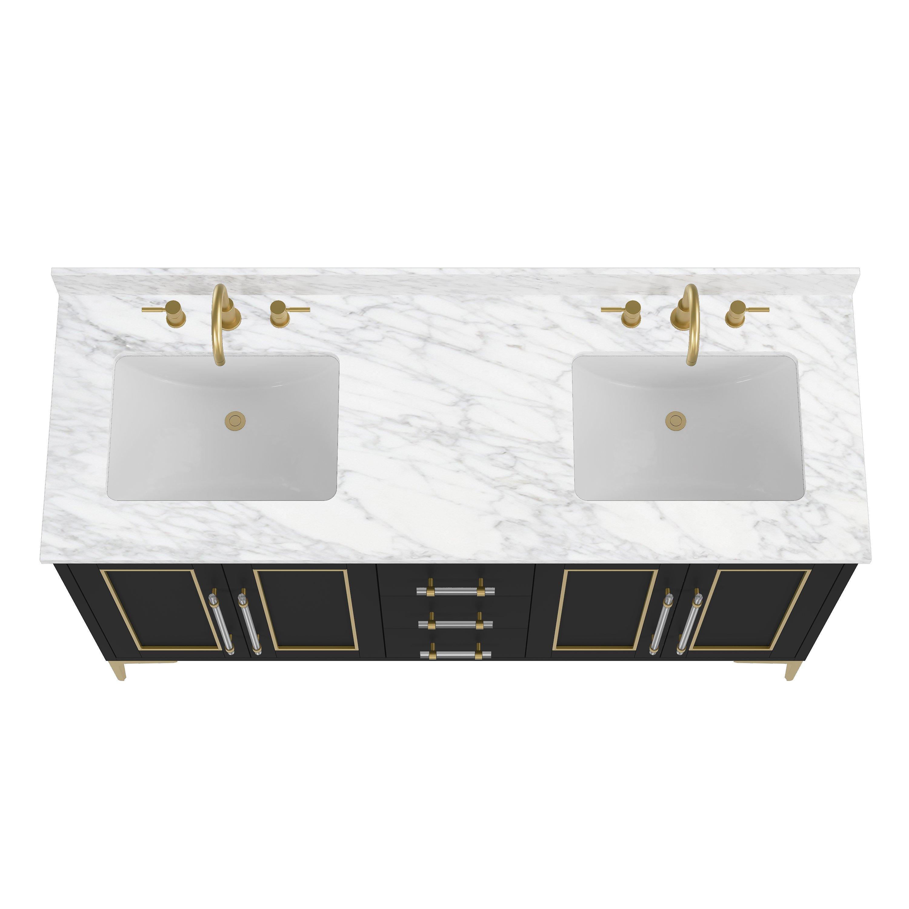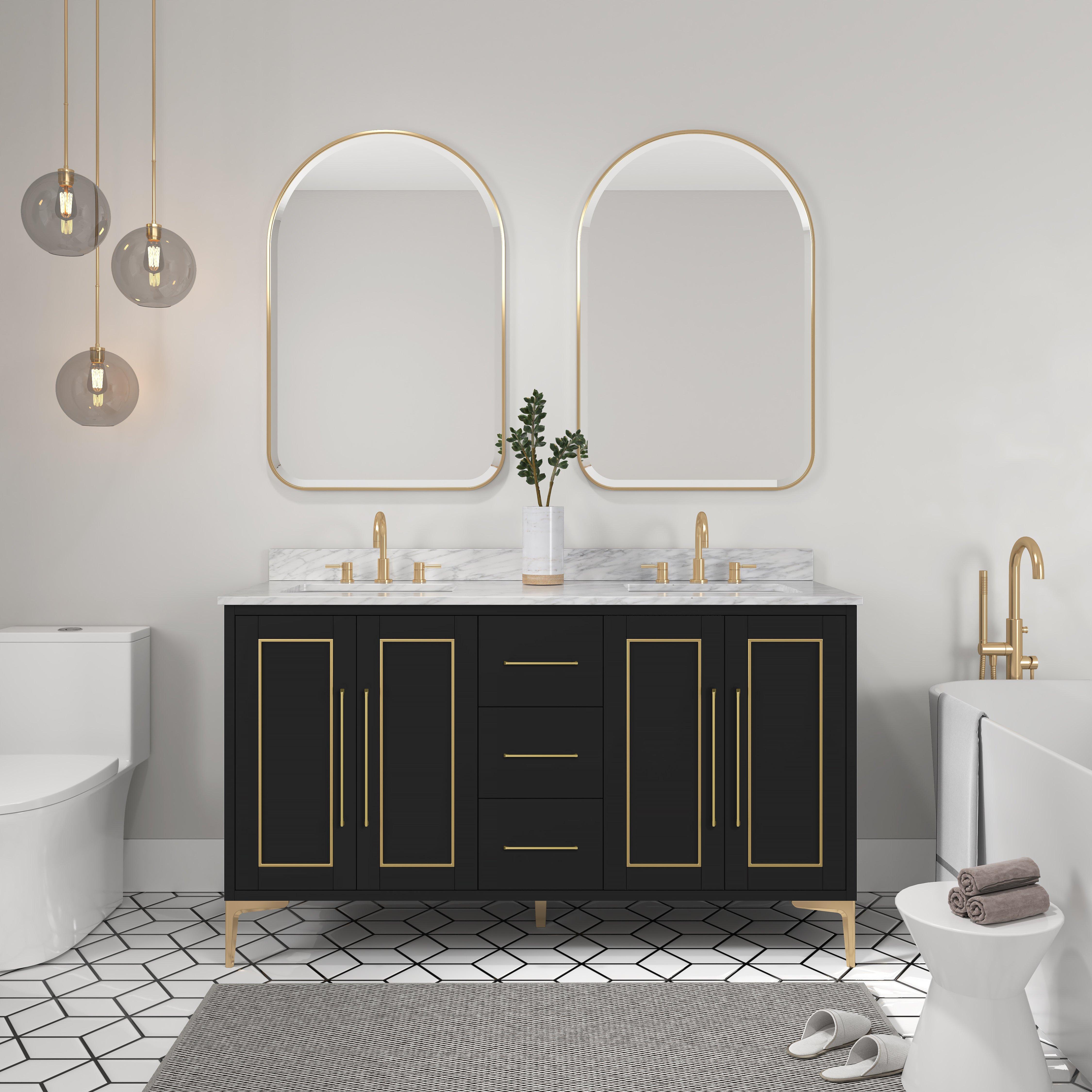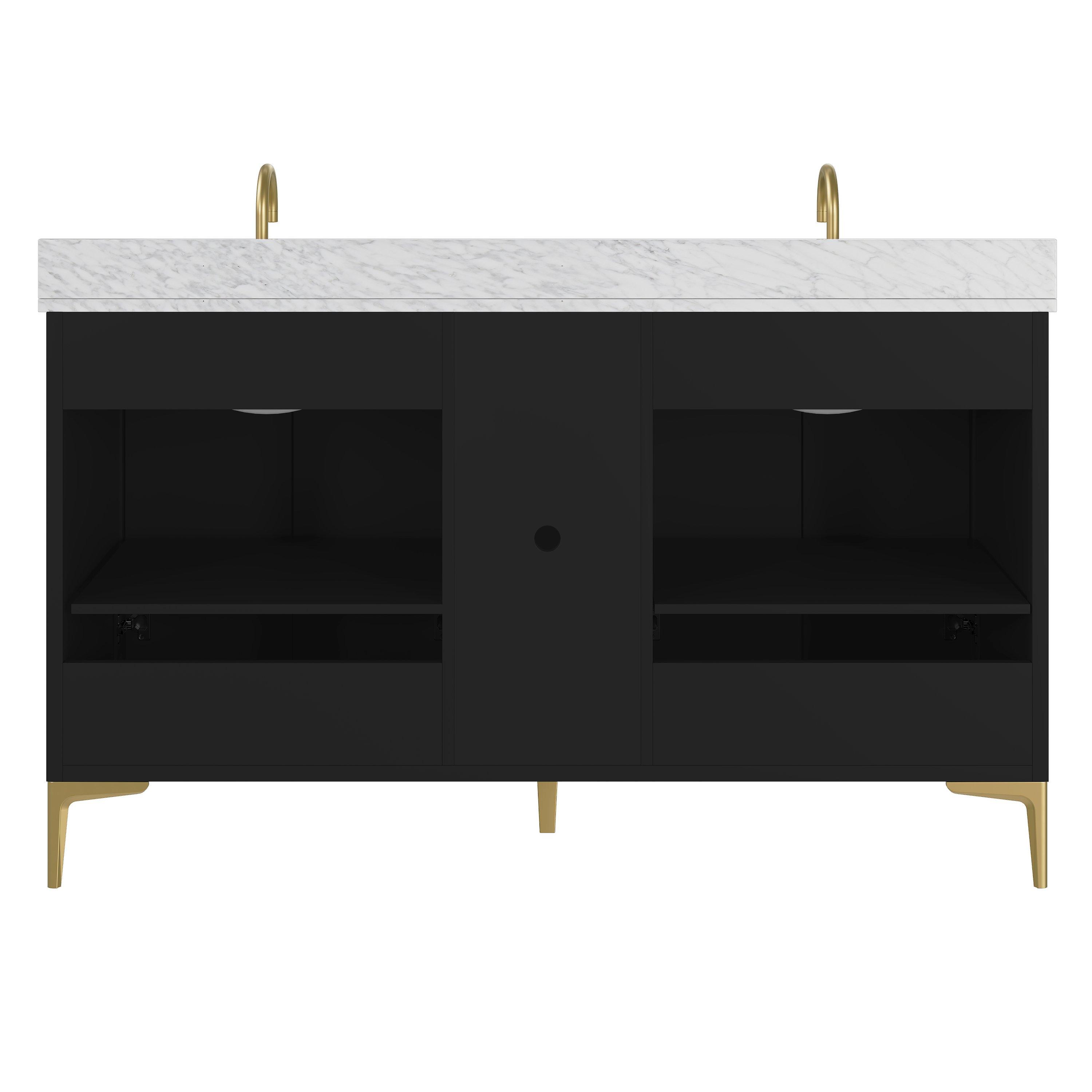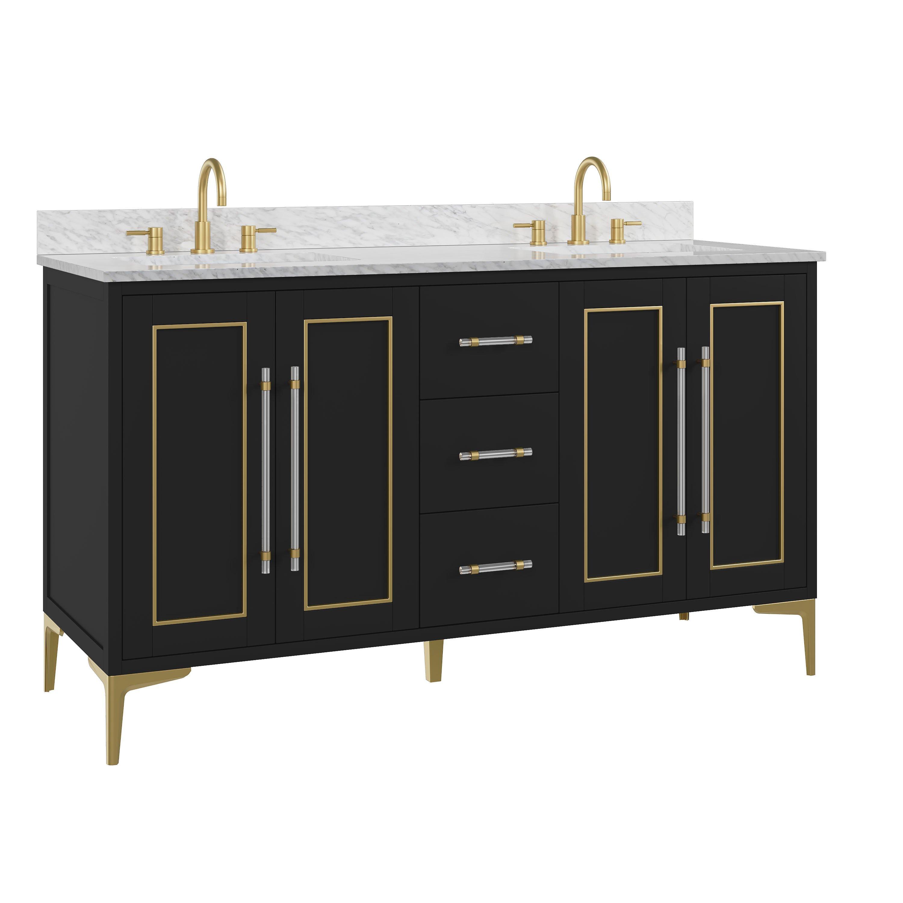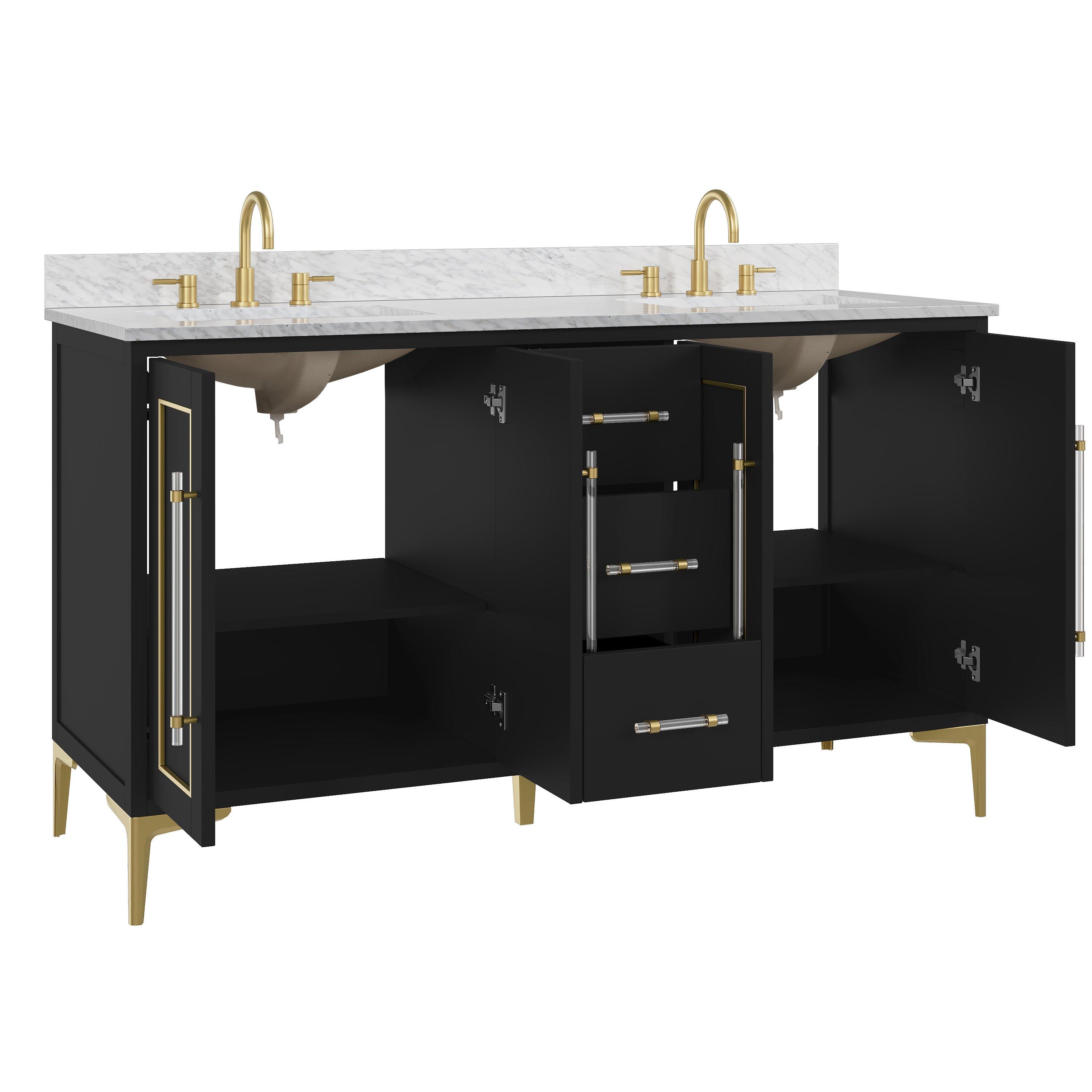 Complete your bathroom with the beautiful Siena 61 in. Black Vanity with Natural Carrara Marble Top. This freestanding features durable solid wood, mdf cabinets in stunning black with a white marble vanity top and n/a n/a hardware. A charming double undermount sink in brilliant white is included. The Siena 61 in. Black Vanity with Natural Carrara Marble Top is a versatile choice to customize multiple bathroom settings.