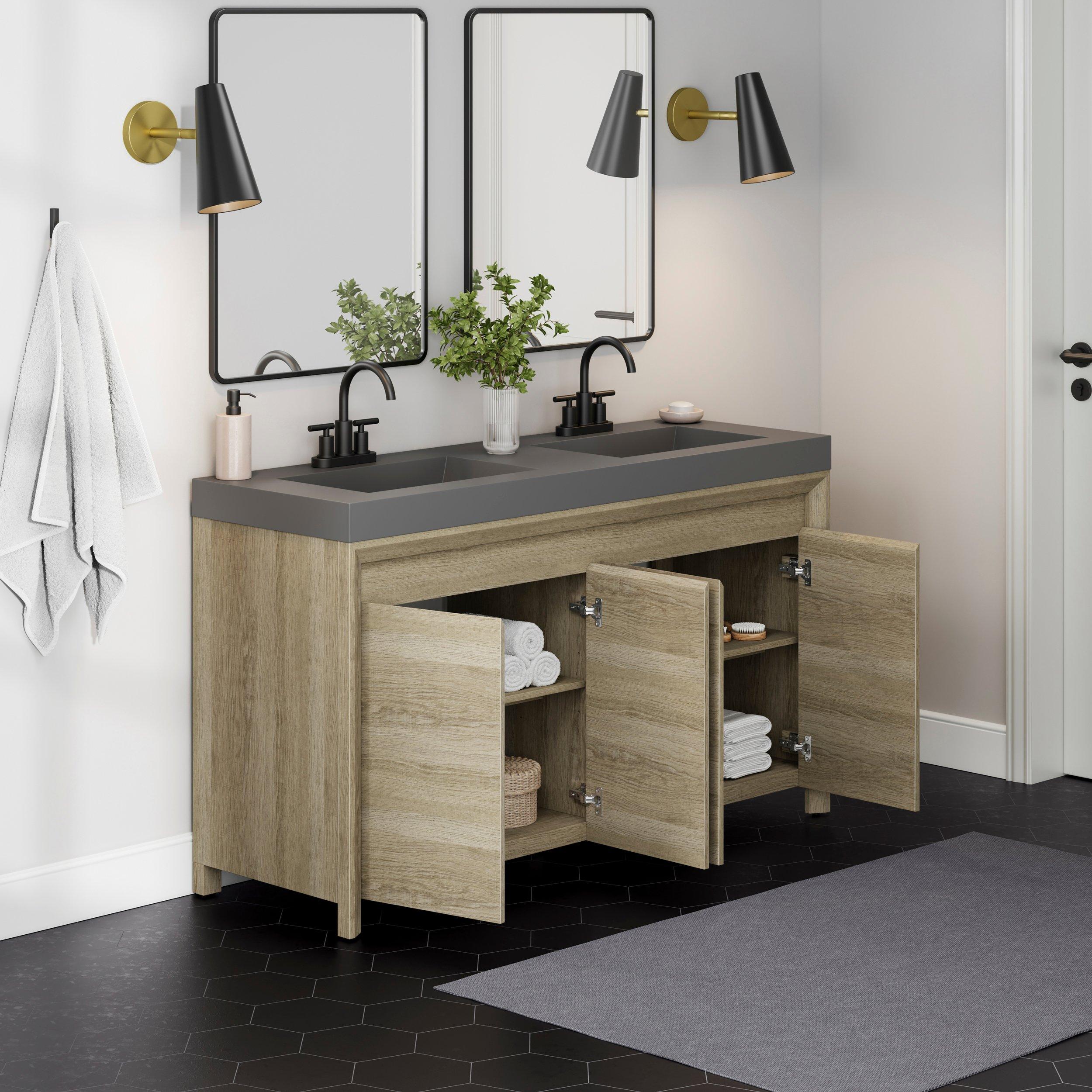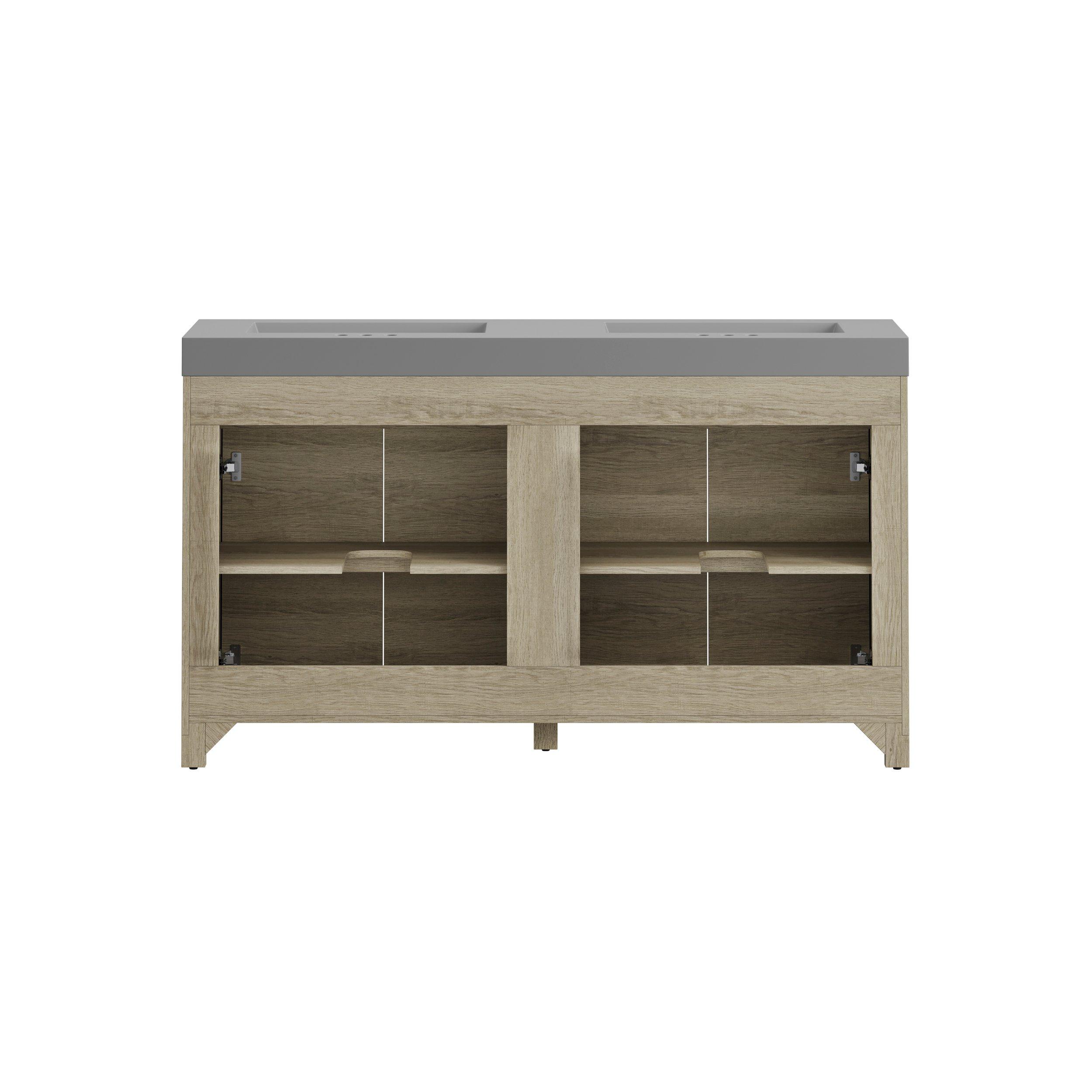 Tailor the look of your bathroom with the Warren 61 in. Natural Oak Finish Vanity with Cultured Marble Top featuring gorgeous mdf in natural with 4 doors, n/a drawers, and 2 shelves. This piece is completed with beautiful n/a n/a hardware and a double integral gray sink. The Warren 61 in. Natural Oak Finish Vanity with Cultured Marble Top is a stunning addition to any bathroom setting.