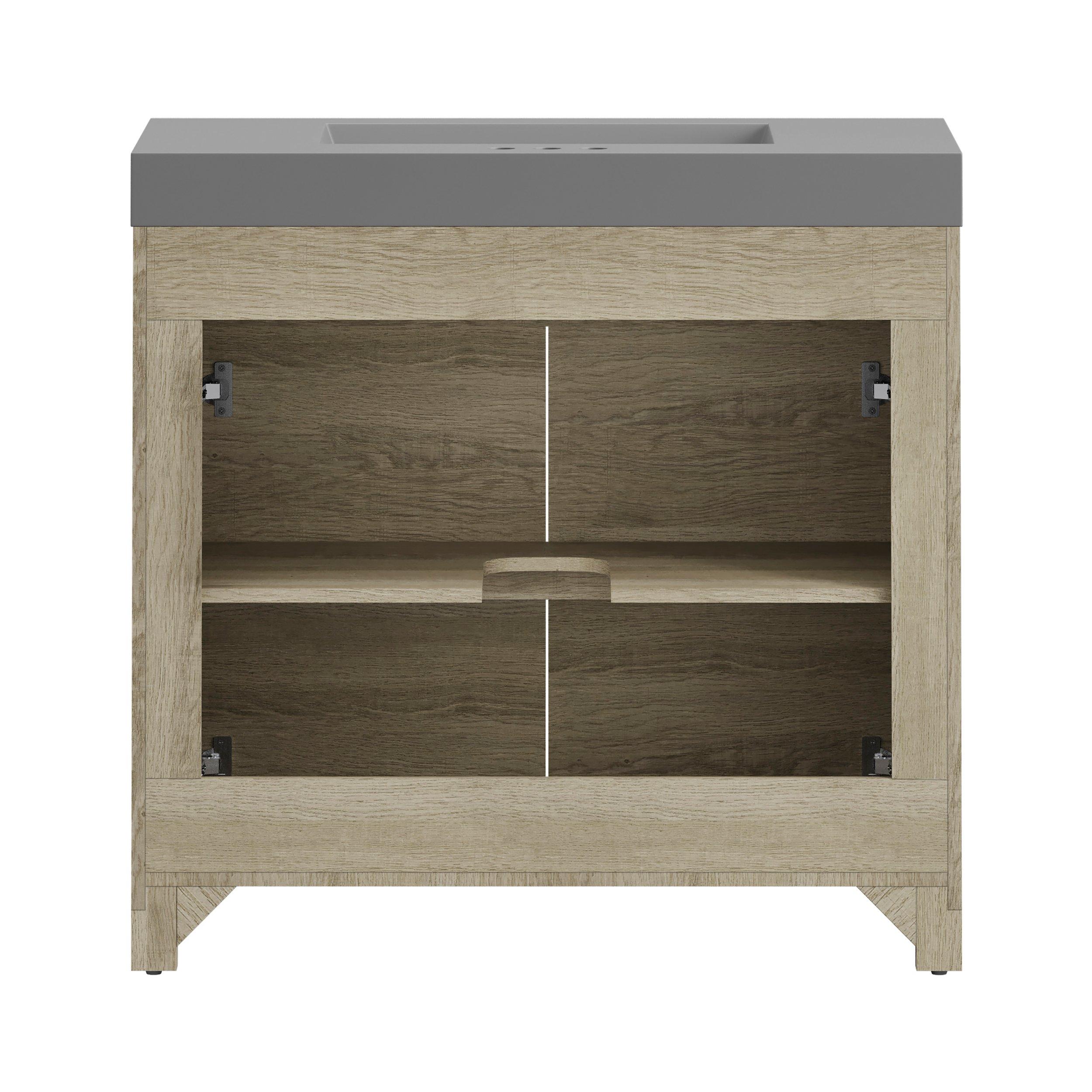 Complete your bathroom with the beautiful Warren 37 in. Natural Oak Finish Vanity with Cultured Marble Top. This freestanding features durable mdf cabinets in stunning natural with a gray cultured marble vanity top and n/a n/a hardware. A charming single integral sink in brilliant gray is included. The Warren 37 in. Natural Oak Finish Vanity with Cultured Marble Top is a versatile choice to customize multiple bathroom settings.