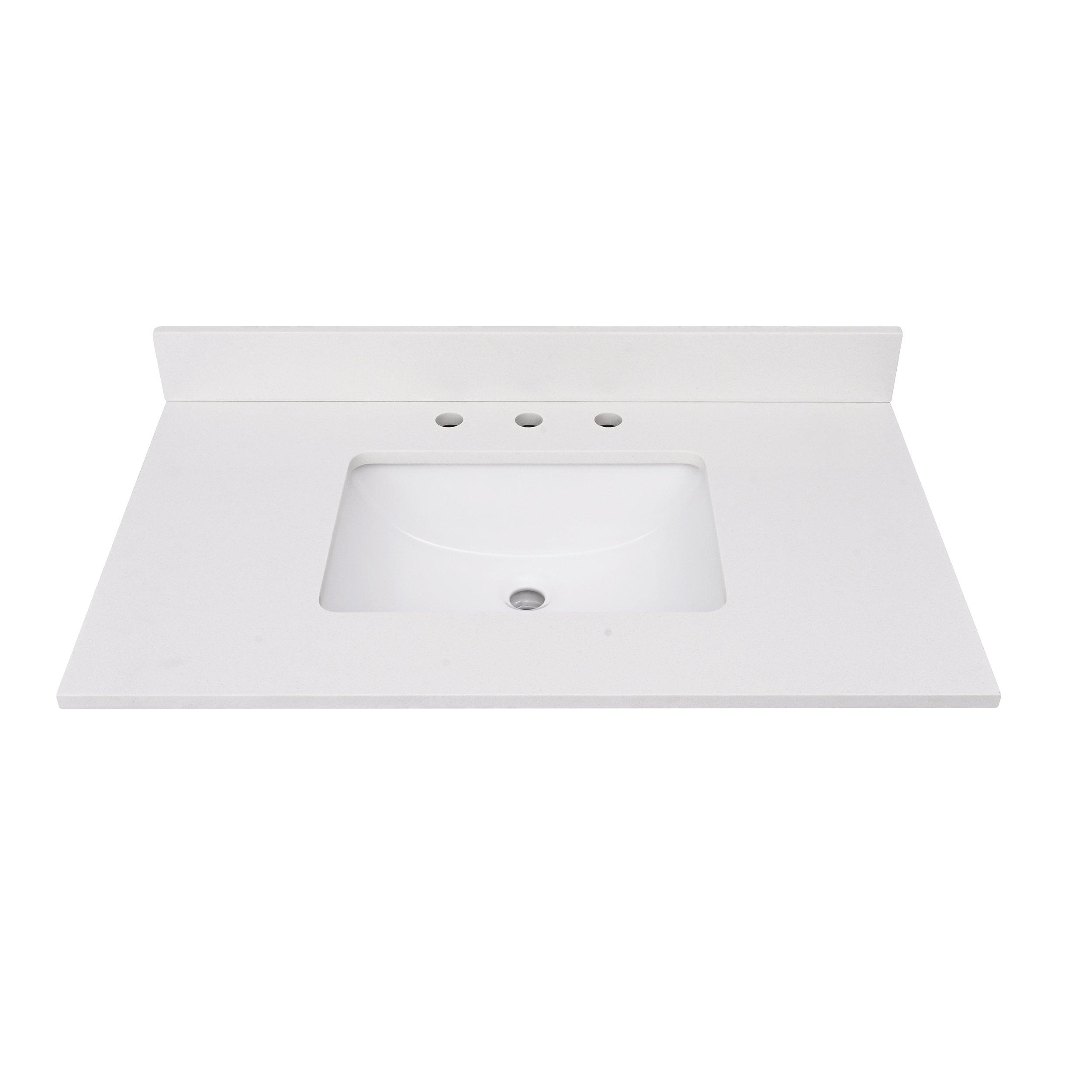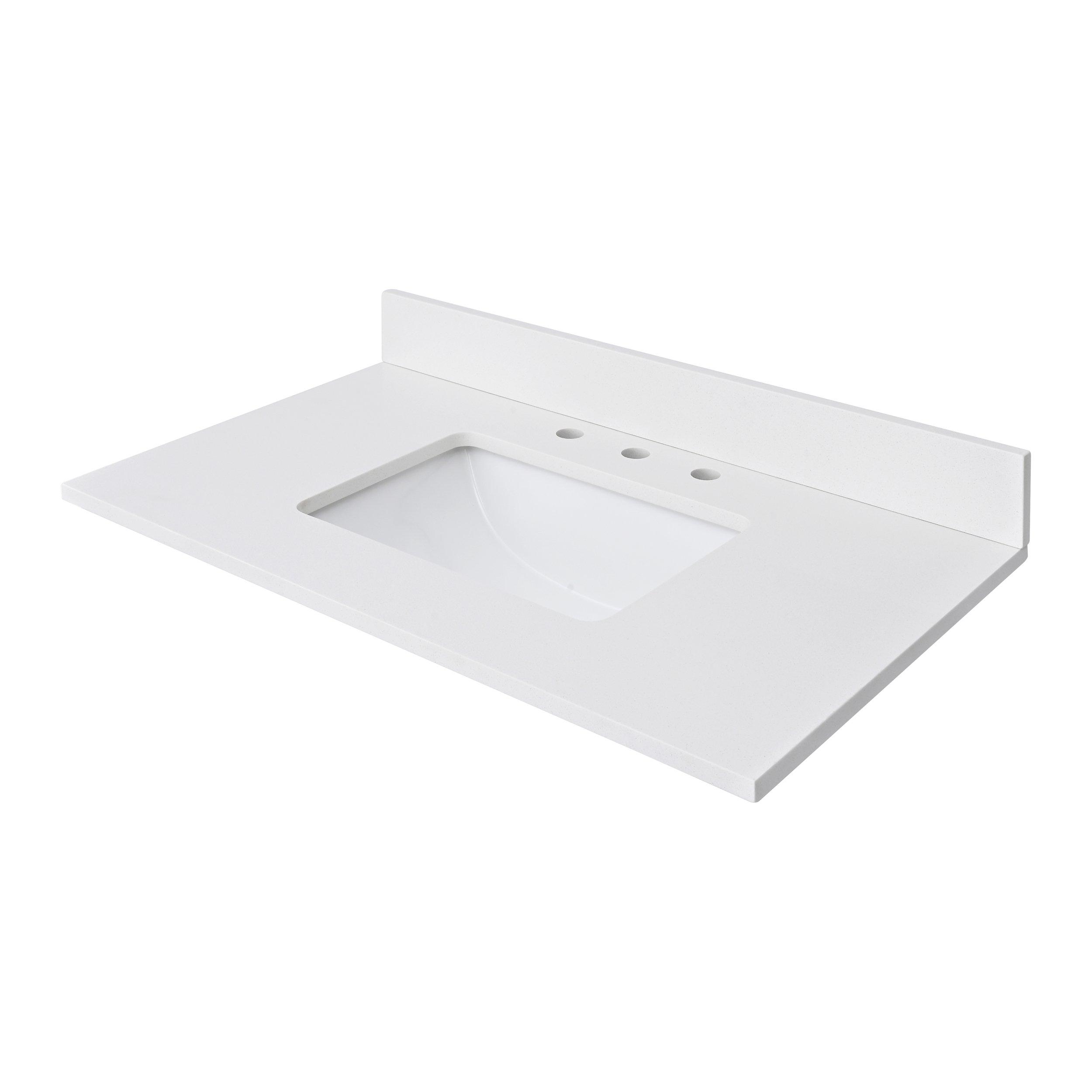 The sink position is offset and not directly centered on the vanity top to allow for more space on the side of the vanity.