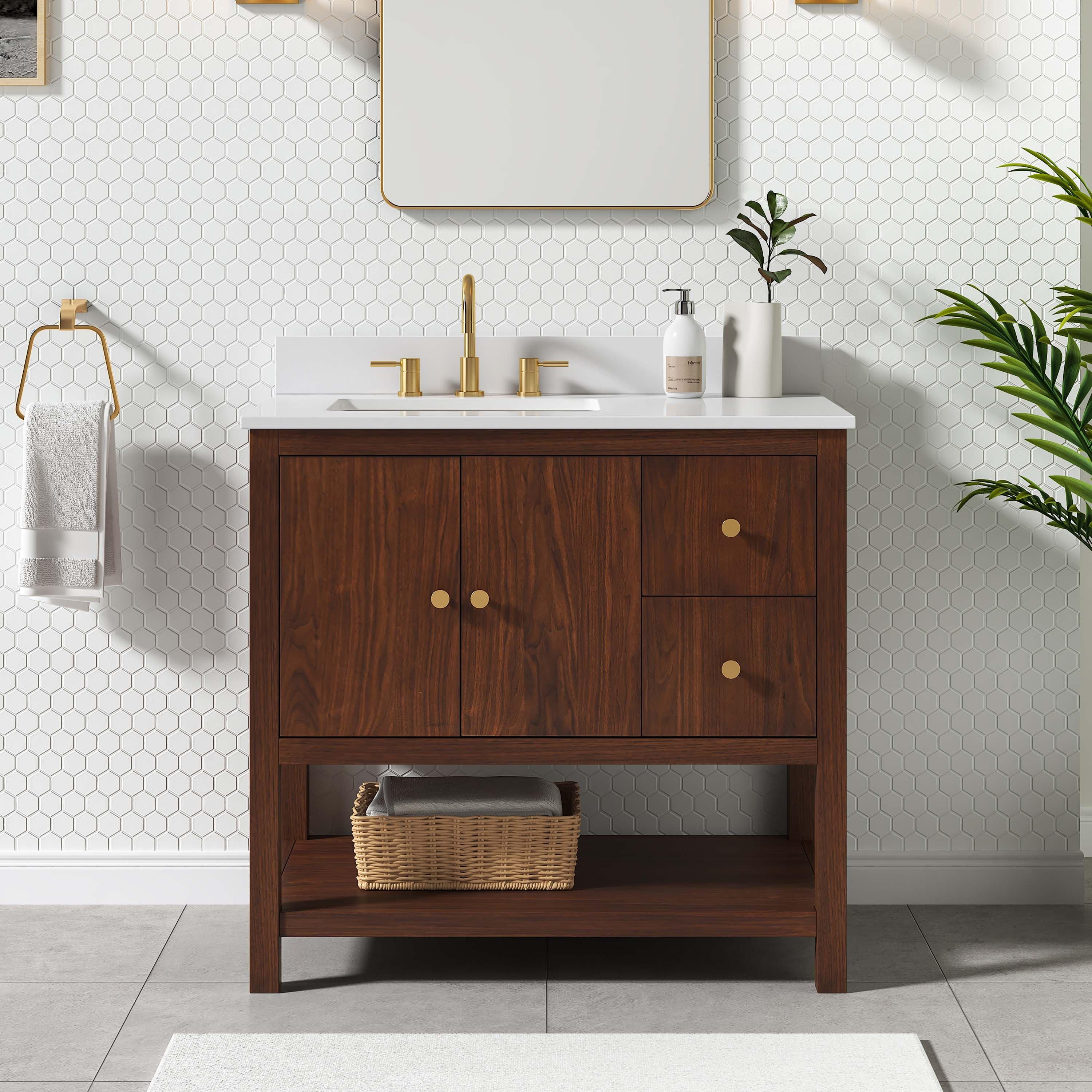Tailor the look of your bathroom with the Zora 37 in. Walnut Brown Vanity with White Quartz Top featuring gorgeous solid wood, mdf in brown with 2 doors, 3 drawers, and 0 shelves. This piece is completed with beautiful matte gold hardware and a single undermount white sink. The Zora 37 in. Walnut Brown Vanity with White Quartz Top is a stunning addition to any bathroom setting.