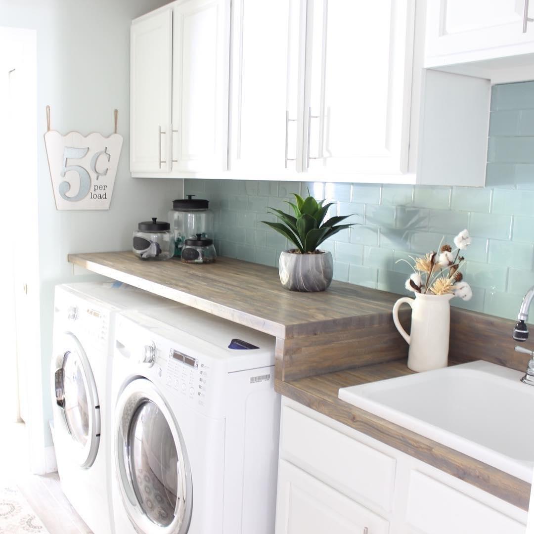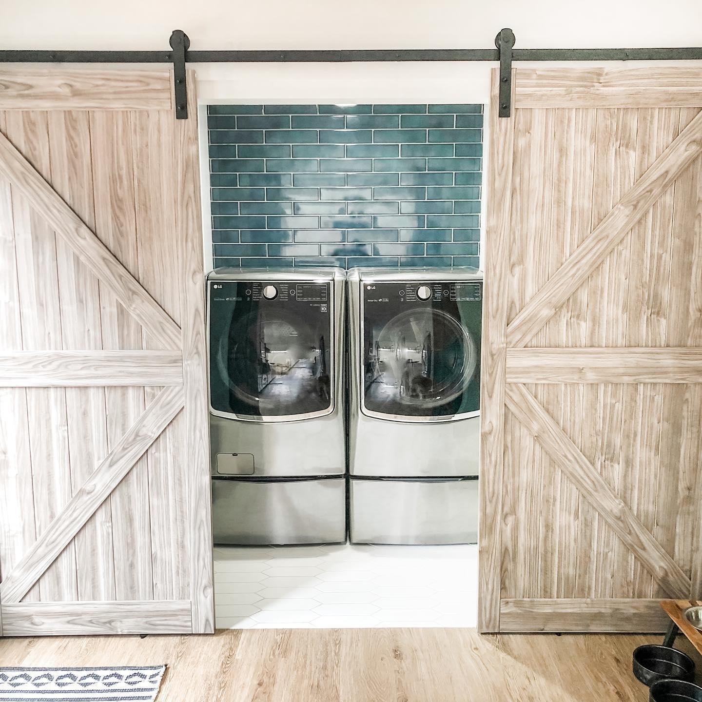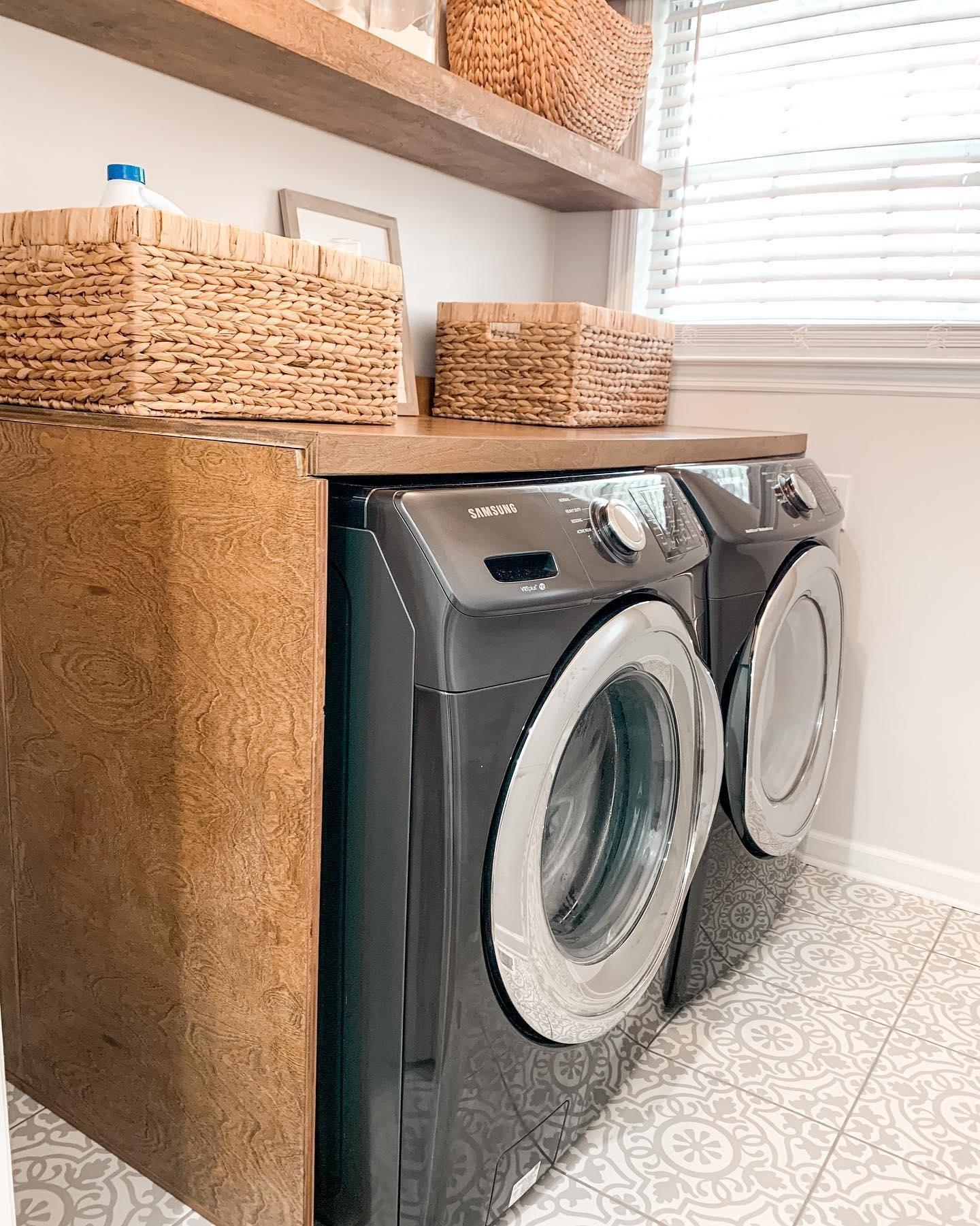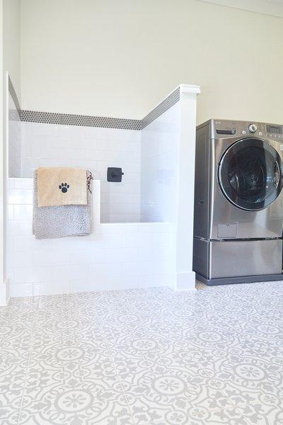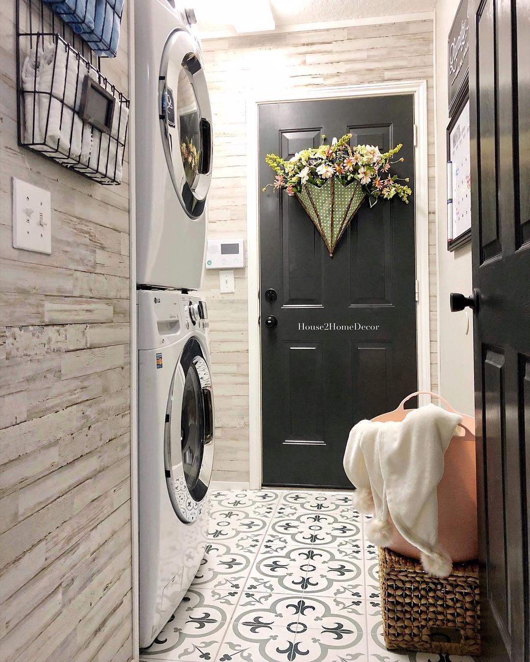 Introducing patterns is at the top of the list of laundry room ideas. Add patterned wall tile behind your machines with a floating shelf to create function and style. Porcelain tiles work well in the laundry room due to their non-porous surface, which helps prevent mildew, mold, and grime buildup. Use epoxy grout to ensure durability and longevity, even in damp spaces. Ceramic tiles are also suitable with their water and stain-resistant properties.