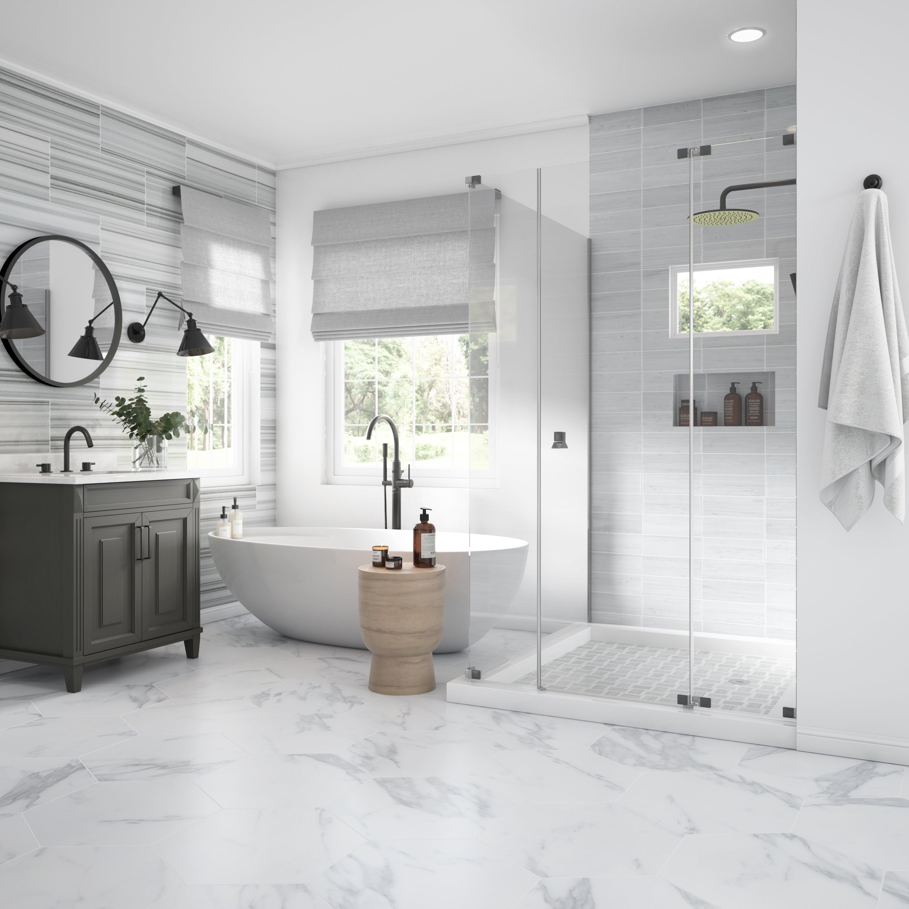 Take your bathroom from lackluster to luxurious with natural marble or marble-look tile. When it comes to marble, the bigger the better. Large format tile creates a sleek and seamless finish, minimizing grout lines and showcasing marble detail (not to mention, less grout makes it easier to clean). Intricate veining and subtle detail give the room versatility.