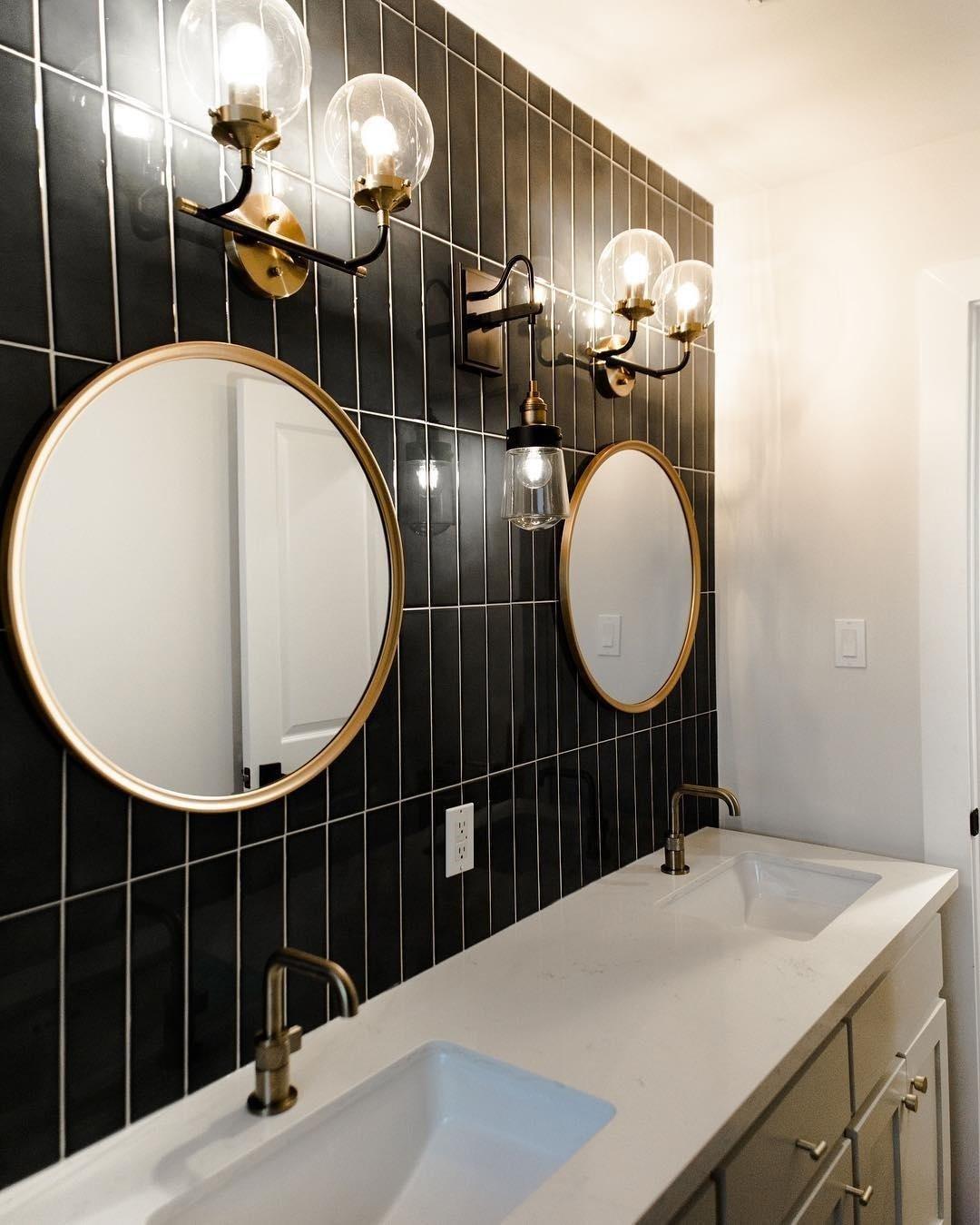 Woman in bathroom with geometric backsplash, wood vanity, and gold hardware