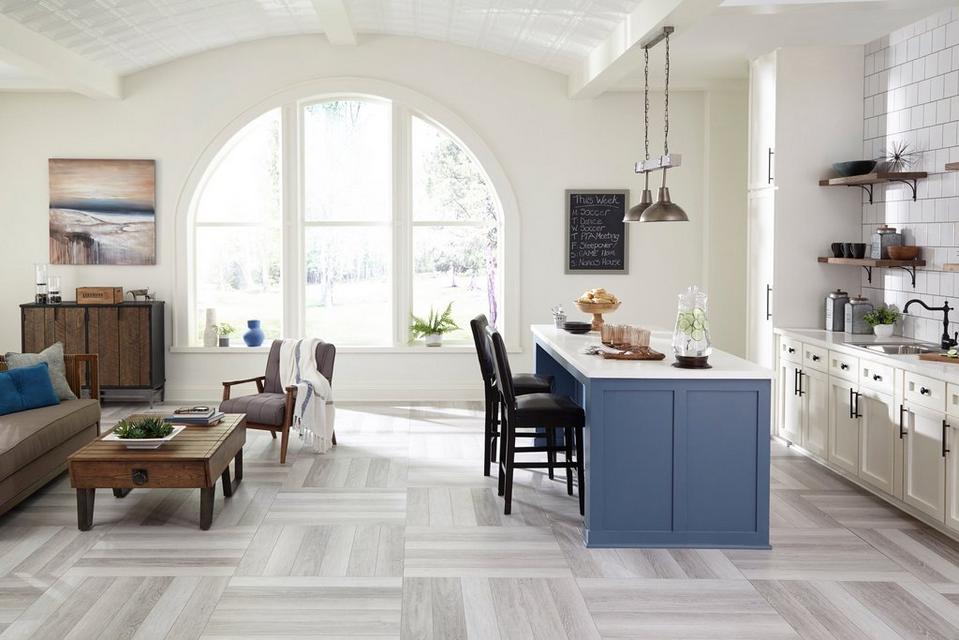 Pictured: River Rush Herringbone Water-Resistant Laminate, Bright White Ice Ceramic Wall Tile