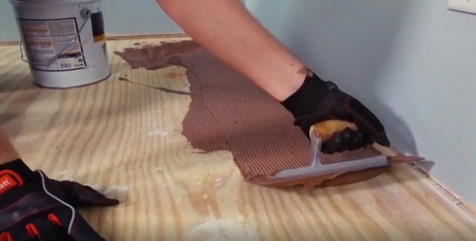 Lay your first row of flooring with the tongue side facing the room. After laying the first row, remove the first plank to ensure that at the adhesive is covering at least 98% of the plank.