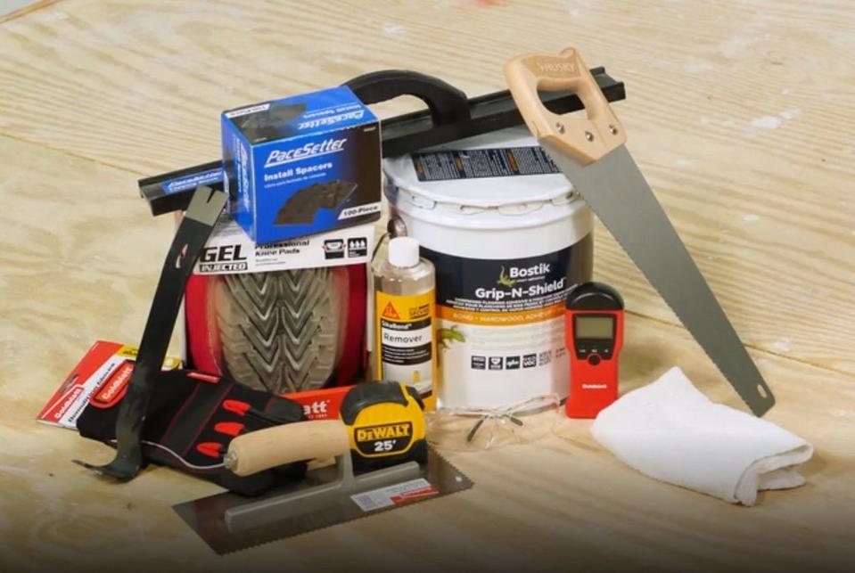 To install an engineered hardwood floor, you’ll need the following items: safety equipment, kneepads, moisture meter, measuring tape, tapping block, wall spacers, saw (hand, miter, or circular), pull bar, wood flooring adhesive, trowel, Sikabond Remover, and a clean rag.