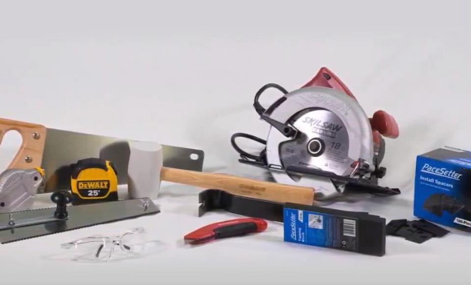 To install laminate flooring, you’ll need the following items: safety equipment, kneepads, moisture meter, measuring tape, a rubber mallet, wall spacers, saw (hand, miter, or circular), a small pry bar, a door jam saw, and underlayment.