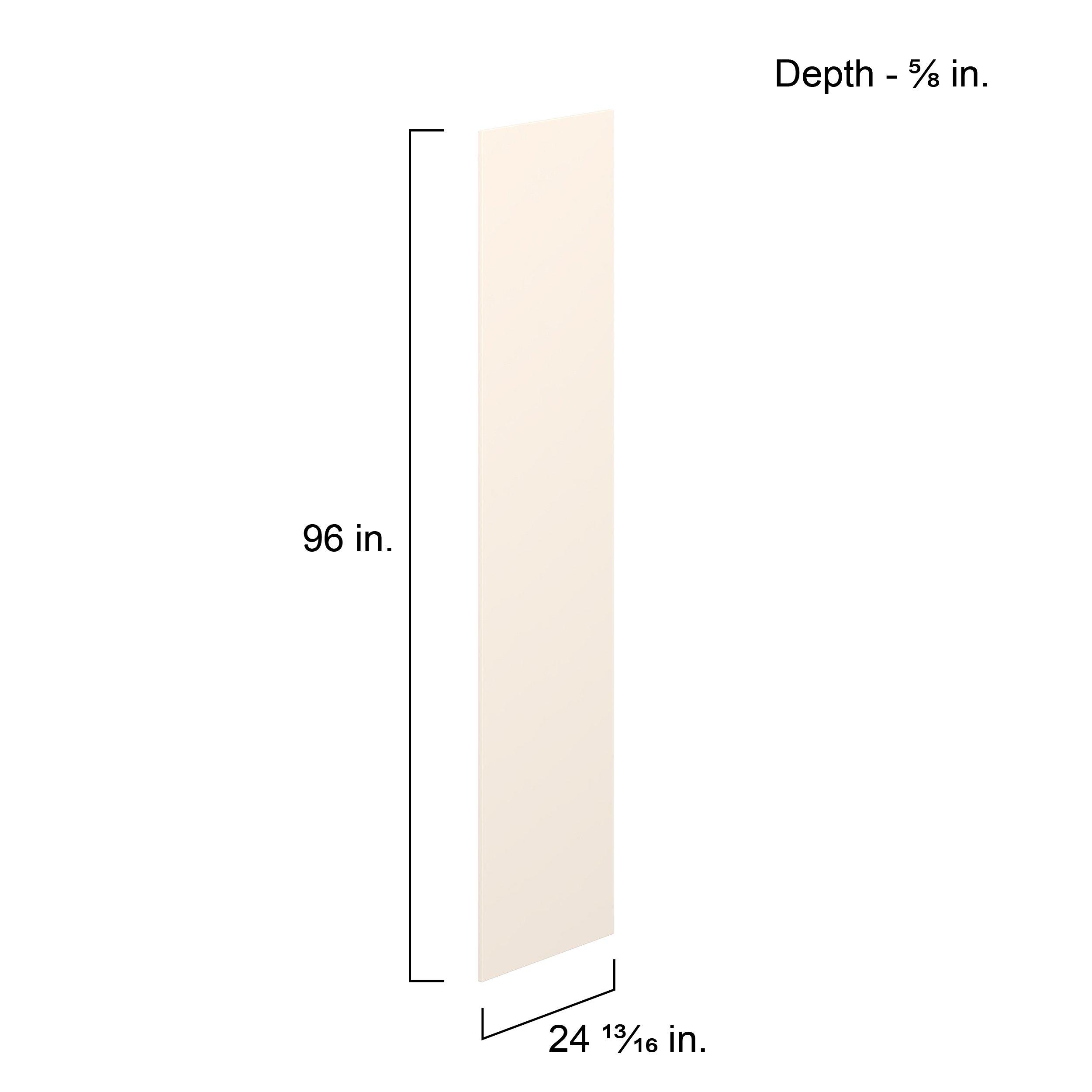 Enjoy a modern twist on a classic with Linden slim shaker cabinets. Available in premium-painted fresh washed linen and earthy moss green finishes, this collection exudes warmth and creates an inviting atmosphere Crafted from one-piece MDF Studio Design Collection Linden 24.57x 96in. Painted Washed Linen Cabinet End Panel is designed to resist hairline cracks while the easy-to-clean finish stands up to stains and moisture. Featuring 5-piece doors and dovetail drawer joints, these cabinets offer durability and elegance. This collection combines style with everyday storage solutions.