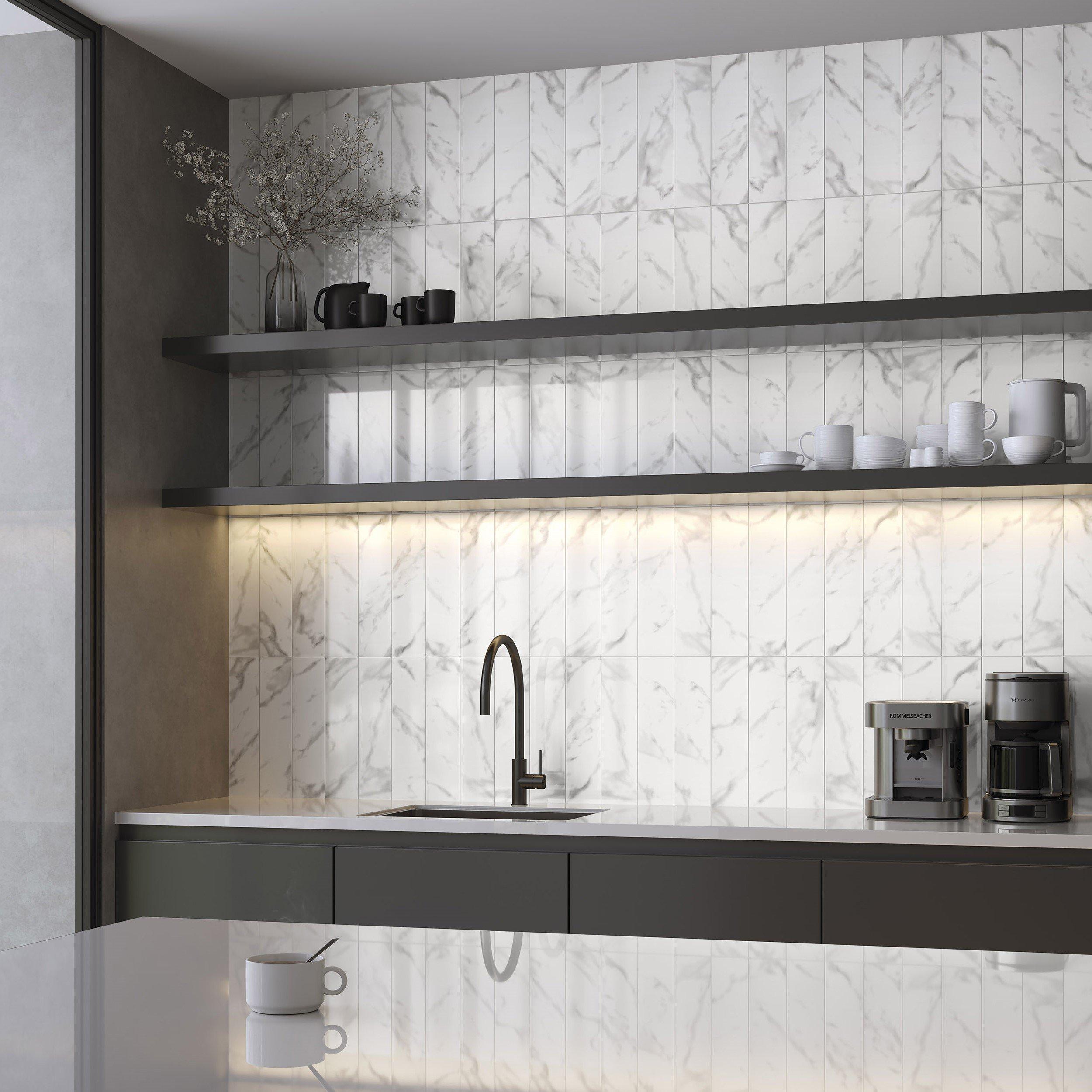 Personalize your space with the Marble Art Ceramic Polished Tile. This white high gloss finish tile will make a great impact in small areas like the bathroom, den, or other overlooked spaces.