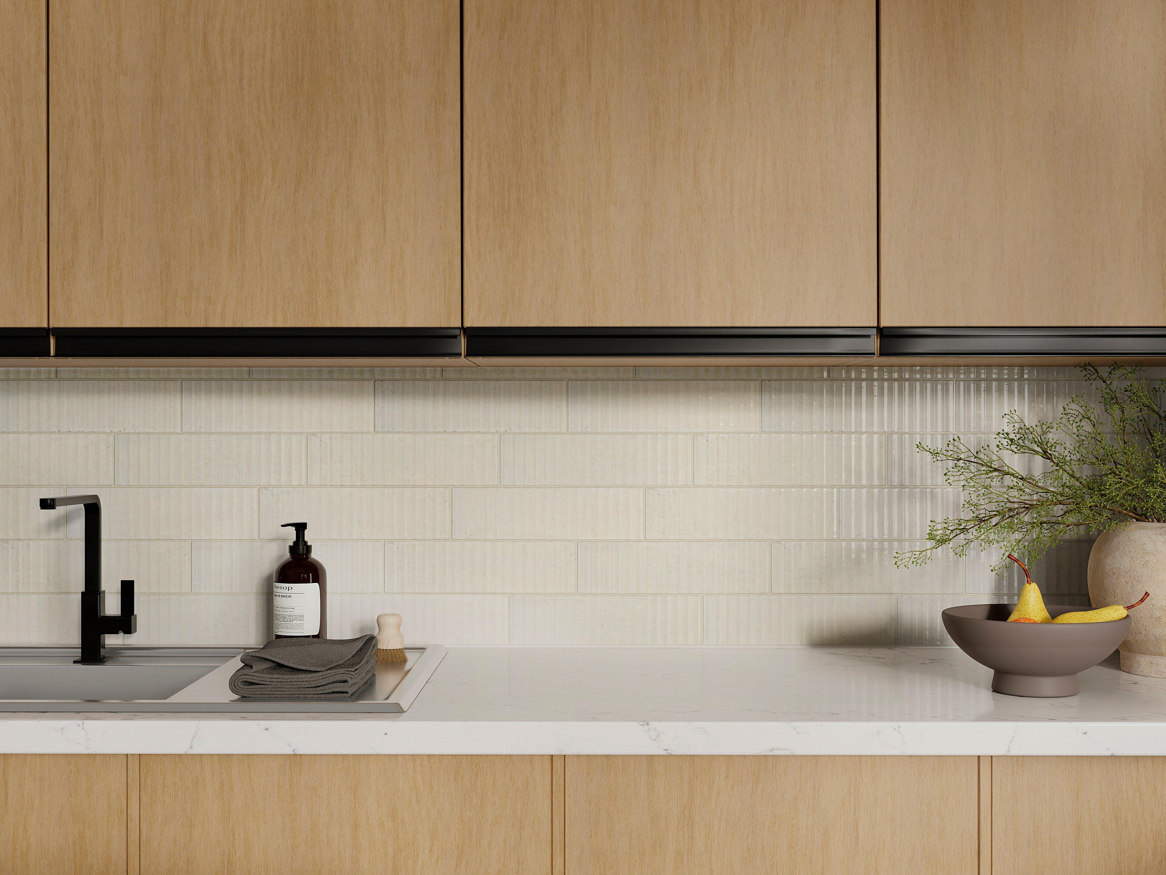 For an elevated look to your design, choose the Ribbed Alabaster Ceramic Tile with a high gloss finish. Use this beige tile to add new visual interest in any space like the bathroom, kitchen, living room, and more.