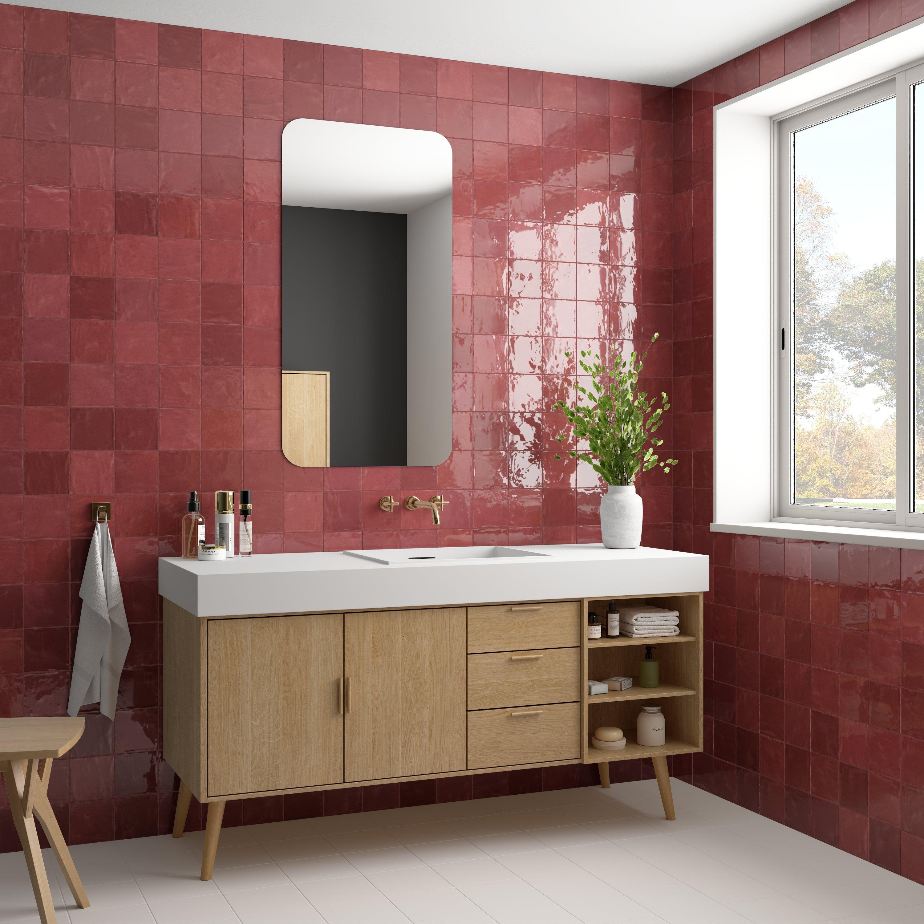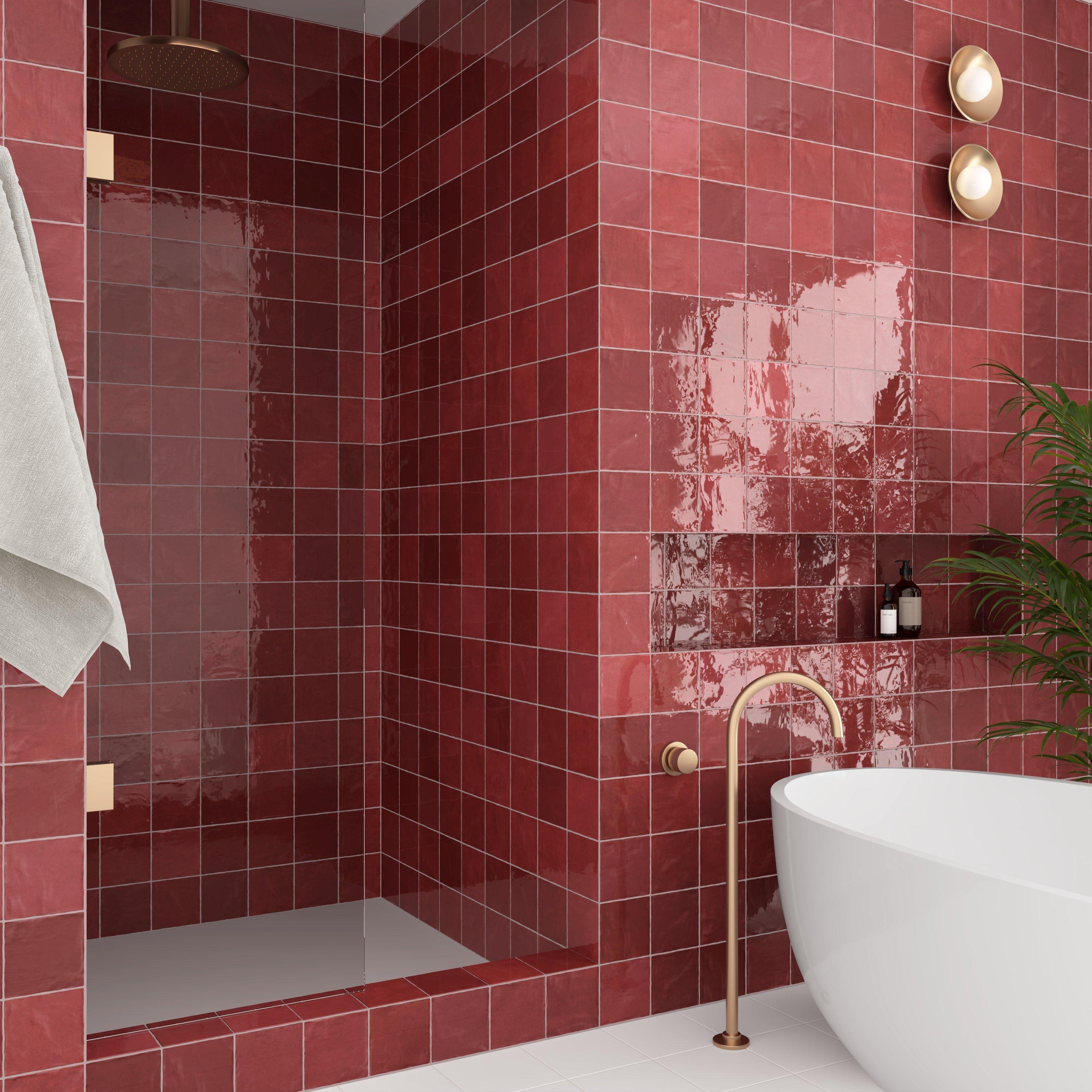 Personalize your space with the Zellige Bordeaux Ceramic Tile. This red/ pink high gloss finish tile will make a great impact in small areas like the bathroom, den, or other overlooked spaces.