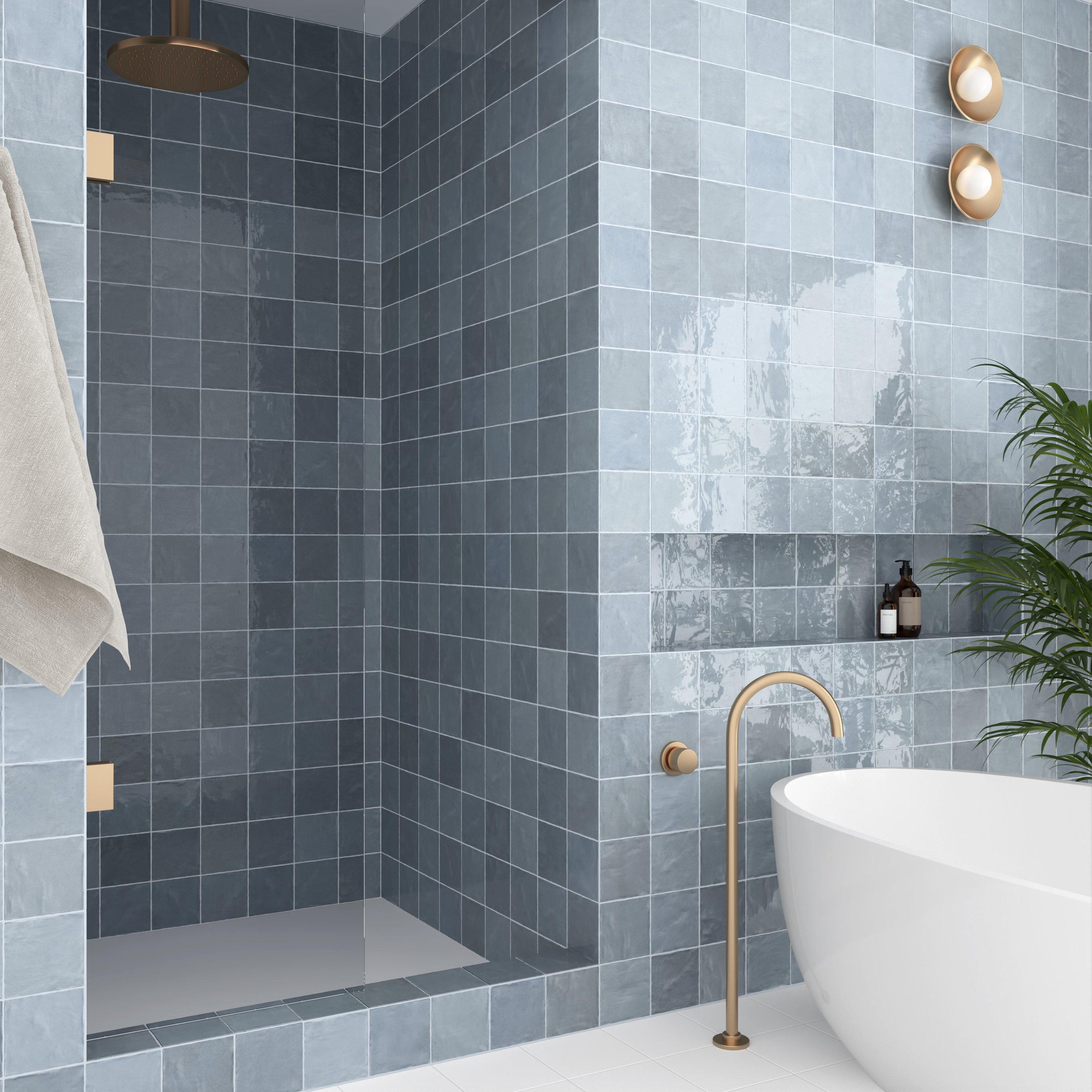 Personalize your space with the Zellige Glacier Ceramic Tile. This blue high gloss finish tile will make a great impact in small areas like the bathroom, den, or other overlooked spaces.